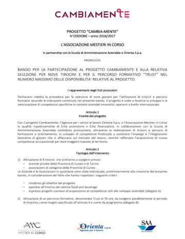PROGETTO “CAMBIA-MENTE” IV EDIZIONE – anno 2016/2017 L’ASSOCIAZIONE MESTIERI IN CORSO in partnership con la Scuola di Amministrazione Aziendale e Orienta S.p.a. PROMUOVE BANDO PER LA PARTECIPAZIONE AL PROGETTO CAMBIAMENTE E ALLA RELATIVA SELEZIONE PER NOVE TIROCINI E PER IL PERCORSO FORMATIVO “TRUST” NEL NUMERO MASSIMO DELLE DISPONIBILITA’ RELATIVE AL PROGETTO. I rappresentanti degli Enti promotori Dichiarano indetta la procedura per la selezione di nove giovani per l’attivazione di tirocini e percorsi formativi secondo le indicazioni contenute nel presente bando. Il progetto è volto a favorire lo sviluppo e la valorizzazione di competenze specifiche in contesti aziendali innovativi, operanti a livello internazionale. Articolo 1 Finalità del progetto Con il progetto Cambiamente, l’Agenzia per i servizi al lavoro Orienta S.p.a. e l’Associazione Mestieri in Corso in qualità rispettivamente di Ente promotore e Ente finanziatore, in collaborazione con la Scuola di Amministrazione Aziendale intendono promuovere, attraverso la realizzazione di tirocini e percorsi di formazione e orientamento, lo sviluppo di competenze finalizzate a sostenere l’impiego e l’integrazione lavorativa di giovani che si affacciano sul mercato del lavoro, nonché rafforzare l’acquisizione di nuove competenze occupazionali per dare maggiori risposte al territorio. Articolo 2 Tipologia dell’intervento 1) Attivazione di 9 tirocini che andranno a svolgersi presso: - aziende private della Provincia di Cuneo e di Torino - associazioni di categoria della Provincia di Cuneo Le Aziende e le Associazioni in questione sono state individuate, preliminarmente alla creazione del presente bando, in considerazione del fatto che hanno rispettato i seguenti criteri: - condiviso gli obiettivi del progetto operano all’interno del settore food and beverage espresso progetti connessi al’acquisizione di competenze utili allo sviluppo aziendale (allegato A) 2) Attivazione di un percorso formativo, denominato Trust di 76 ore, da svolgersi parallelamente al periodo di tirocinio, come meglio specificato all’articolo 6 e come da programma (allegato B). Articolo 3 Destinatari dell’intervento Possono presentare domanda di ammissione al Progetto Cambiamente i giovani residenti in Piemonte al momento dell’invio della domanda. di età compresa tra i 20 e i 29 anni; che non abbiano riportato condanne penali; (per i soli cittadini stranieri) che siano in possesso del regolare permesso di soggiorno o carta di soggiorno; che posseggano il titolo di studio richiesto dai progetti formativi per cui si candidano; I requisiti sopraindicati dovranno essere posseduti durante tutto il periodo dello svolgimento del tirocinio. Articolo 4 Durata dell’intervento Il tirocinio ha una durata di mesi sei e prevede un impegno massimo di 1000 ore complessive, di cui 76 dedicate al percorso formativo “Trust”. I tirocini avranno inizio a settembre 2016 e si concluderanno a fine febbraio 2017. Il tirocinante è tenuto a cooperare al conseguimento degli obiettivi che lo riguardano rispettando la normativa nazionale che regola lo svolgimento dei tirocini, nonché le regole aziendali e di progetto. Il tirocinio potrà essere, all’occorrenza, interrotto su valutazione dei tutor aziendali o dei responsabili del progetto. Articolo 5 Natura dell’intervento economico I tirocini formativi non possono, in alcun caso, configurarsi come rapporto di lavoro dipendente. I rimborsi spese, previsti in minimo euro 750,oo mensili lordi , non sono in alcun caso da configurarsi come forma di retribuzione. I suddetti rimborsi verranno erogati mensilmente dall’Azienda sede di tirocinio. L’Associazione Mestieri in Corso verserà mensilmente alle Aziende aderenti all’iniziativa l’importo di euro 576 al netto della ritenuta d’acconto del 4% che verrà versata direttamente all’Erario ( equivalenti ad euro 600 mensili lordi ). A carico dell’azienda aderente restera’ la quota parte del rimborso spese fino a concorrenza dell’importo previsto . L’assicurazione Inail e RC per il tirocinante saranno a carico dell’Azienda partecipante Articolo 6 Formazione e TRUST campus Il Progetto prevede un percorso formativo denominato Trust, pianificato e gestito in collaborazione con i seguenti partner: Il MetodoLara S.a.s Cultura dal Basso Impresa Sociale Madiba Società Cooperativa SAA – Scuola di Amministrazione Aziendale Il percorso ha una durata di 76 ore complessive, come da calendario (allegato B) e opererà su tematiche softcomportamentali e metodologiche trasversali ai differenti tirocini. La formazione, volta a valorizzare la condivisione dell’esperienza e il lavoro in team, si apre con un campus di 3 giorni presso l’Agriturismo I Bageta, dove i nove candidati si sperimenteranno come gruppo con i primi workshop. Il percorso Trust include le prime 4 ore di formazione per la Sicurezza sul lavoro obbligatorie per i tirocinanti neo inseriti. E’ inoltre prevista una giornata di formazione rivolta ai tutor aziendali individuati dalle singole realtà per accompagnare i tirocinanti nel loro percorso. Articolo 7 Attività di monitoraggio L’Associazione Mestieri in Corso e l’Agenzia per i servizi al lavoro Orienta Spa garantiranno la presenza di un tutor che, interfacciandosi con l’Azienda, ed in particolare con il tutor aziendale e con i tirocinanti, andrà a monitorare l’andamento dell’esperienza attraverso momenti di condivisione e incontri. Articolo 8 Modalità di presentazione della domanda Per partecipare alle selezioni del Progetto Cambiamente, gli interessati devono compilare in tutte le sue parti l’apposito modulo digitale reperibile sul sito www.cambia-mente.it, allegando: - Curriculum Vitae Carta d’identità e codice fiscale (in un unico documento in formato pdf o jpg) Le domande dovranno pervenire a partire da LUNEDI’ 2 MAGGIO 2016 ENTRO E NON OLTRE VENERDI’ 3 GIUGNO 2016 alle ore 18.00. Faranno fede data e or