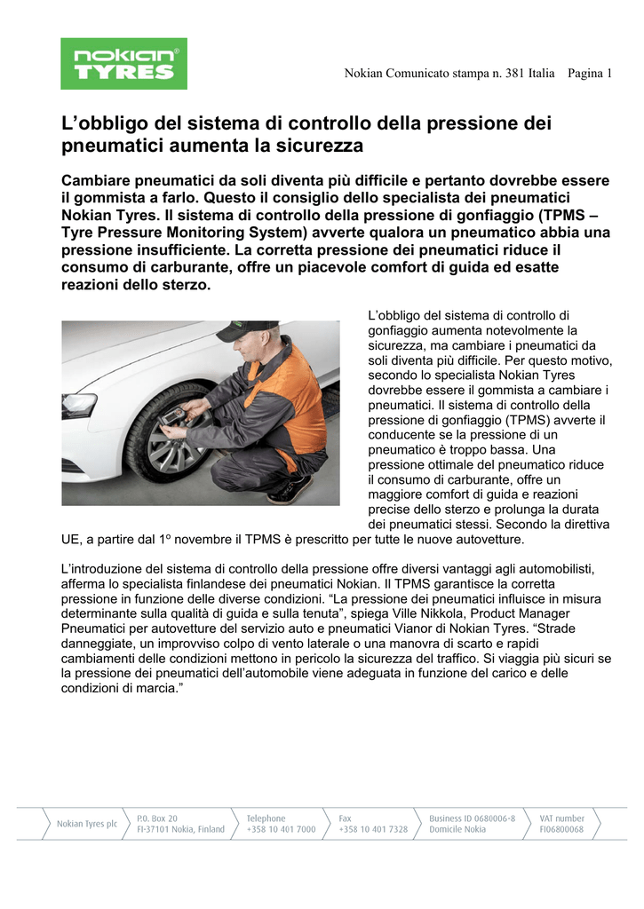 Nokian Comunicato stampa n. 381 Italia Pagina 1 L’obbligo del sistema di controllo della pressione dei pneumatici aumenta la sicurezza Cambiare pneumatici da soli diventa più difficile e pertanto dovrebbe essere il gommista a farlo. Questo il consiglio dello specialista dei pneumatici Nokian Tyres. Il sistema di controllo della pressione di gonfiaggio (TPMS – Tyre Pressure Monitoring System) avverte qualora un pneumatico abbia una pressione insufficiente. La corretta pressione dei pneumatici riduce il consumo di carburante, offre un piacevole comfort di guida ed esatte reazioni dello sterzo. L’obbligo del sistema di controllo di gonfiaggio aumenta notevolmente la sicurezza, ma cambiare i pneumatici da soli diventa più difficile. Per questo motivo, secondo lo specialista Nokian Tyres dovrebbe essere il gommista a cambiare i pneumatici. Il sistema di controllo della pressione di gonfiaggio (TPMS) avverte il conducente se la pressione di un pneumatico è troppo bassa. Una pressione ottimale del pneumatico riduce il consumo di carburante, offre un maggiore comfort di guida e reazioni precise dello sterzo e prolunga la durata dei pneumatici stessi. Secondo la direttiva UE, a partire dal 1o novembre il TPMS è prescritto per tutte le nuove autovetture. L’introduzione del sistema di controllo della pressione offre diversi vantaggi agli automobilisti, afferma lo specialista finlandese dei pneumatici Nokian. Il TPMS garantisce la corretta pressione in funzione delle diverse condizioni. “La pressione dei pneumatici influisce in misura determinante sulla qualità di guida e sulla tenuta”, spiega Ville Nikkola, Product Manager Pneumatici per autovetture del servizio auto e pneumatici Vianor di Nokian Tyres. “Strade danneggiate, un improvviso colpo di vento laterale o una manovra di scarto e rapidi cambiamenti delle condizioni mettono in pericolo la sicurezza del traffico. Si viaggia più sicuri se la pressione dei pneumatici dell’automobile viene adeguata in funzione del carico e delle condizioni di marcia.” Nokian Comunicato stampa n. 381 Italia Pagina 2 Il 20% degli automobilisti finlandesi viaggia con una pericolosa pressione dei pneumatici di 0,5 bar in meno, secondo l’associazione finlandese dei pneumatici Autonrengasliitto ry. Nell’ultimo mese in Finlandia, solo un terzo degli automobilisti ha verificato la pressione dei propri pneumatici. Il sistema di controllo della pressione dei pneumatici TPMS aiuta a ridurre il consumo di carburante. La pressione ottimale dei pneumatici contribuisce ad un piacevole comfort di guida, ad esatte reazioni dello sterzo e a un semplice rotolamento, che fa risparmiare carburante. La Trafi, organizzazione finlandese per la sicurezza del traffico per le automobili in Finlandia, stima che se tutte le vetture fossero dotate di un sistema di controllo della pressione di gonfiaggio si potrebbe risparmiare il 2,5% di carburante. Secondo le previsioni del servizio auto e pneumatici Vianor, simili risparmi di carburante si possono raggiungere anche in Italia. I sistemi diretti di controllo della pressione eseguono una misurazione più precisa di quelli indiretti I produttori di automobili possono scegliere tra sistemi di controllo della pressione TPMS diretti e indiretti. Nei sistemi diretti, ogni ruota è dotata di un sensore che trasmette i dati della pressione, della temperatura e altri fattori rilevanti alla strumentazione del cruscotto. «Il sistema diretto di controllo della pressione di gonfiaggio avverte il conducente quando la pressione di un pneumatico scende più del 20% sotto il valore previsto e ogni volta che la pressione è inferiore a 1,5 bar. Normalmente il TPMS diretto indica anche quale pneumatico ha una pressione insufficiente, ma questo dipende anche dal modello dell’auto“, spiega Nikkola, esperto del servizio auto e pneumatici Vianor. Il sistema indiretto di controllo della pressione di gonfiaggio non è così preciso come quello diretto e visualizza solo se il veicolo è in movimento, poiché i risultati della misurazione si basano sulla velocità delle ruote, fornita dal sistema ABS. Il TPMS indiretto non è quindi in grado di visualizzare la pressione precisa dei pneumatici. È il produttore dell’auto a decidere quale sistema integrare. Il cambio pneumatico diventa più complesso Il sistema più utilizzato sarà quello dotato di sensori all’interno delle ruote. Per gli automobilisti il cambio dei pneumatici diventa quindi tecnicamente più complesso, poiché in questo caso è necessario riconfigurare determinati strumenti automobilistici attraverso una porta OBD, se in occasione del cambio pneumatico è necessario sostituire anche i sensori. "Il cambio pneumatici dovrebbe quindi essere eseguito dal servizio pneumatici. Nelle sue filiali per pneumatici e auto, Vianor dispone di tutta la strumentazione necessaria e forma i propri Nokian Comunicato stampa n. 381 Italia Pagina 3 collaboratori. Si tratta di un grande cambiamento, che può risultare difficile per i nostri clienti e per i nostri collaboratori”, afferma Ville Nikkola. Secondo lo studio Aral del 2013, il 26% degli automobilisti italiani prevede di acquistare un’automobile nuova, usata o una “Jahreswagen” (vettura aziendale) nei prossimi 18 mesi. I pneumatici Nokian sono disponibili in commercio anche montati su cerchione come ruota completa. www.nokiantyres.it Catena di servizi auto e pneumatici Vianor di Nokian Tyres: http://vianor.it/ Redazione: Dott. Falk Köhler Foto Vianor_TMPS_1.jpg Didascalia: Il gommista del sevizio auto e pneumatici Vianor verifica il funzionamento del sensore del sistema di controllo della pressione di gonfiaggio con un dispositivo di diagnosi Foto: Nokian Tyres Vianor_TMPS_2.jpg Didascalia: Il sensore del sistema di controllo della pressione di gonfiaggio viene montato sulla valvola Foto: Nokian Tyres Download foto Sistema di controllo pressione di pompaggio: www.nokiantyres.com/tpms Maggiori informazioni Sistema di cont