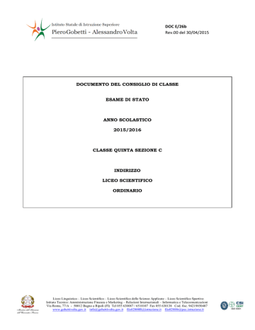 D DOC E/26b Rev.00 del 30/04/2015 DOCUMENTO DEL CONSIGLIO DI CLASSE ESAME DI STATO ANNO SCOLASTICO 2015/2016 CLASSE QUINTA SEZIONE C INDIRIZZO LICEO SCIENTIFICO ORDINARIO Liceo Linguistico – Liceo Scientifico – Liceo Scientifico delle Scienze Applicate – Liceo Scientifico Sportivo Istituto Tecnico: Amministrazione Finanza e Marketing – Relazioni Internazionali – Informatica e Telecomunicazioni Via Roma, 77/A - 50012 Bagno a Ripoli (FI) Tel 055 630087 / 6510107 Fax 055 630138 Cod. fisc. 94219850487 www.gobettivolta.gov.it [email protected] [email protected] [email protected] PRESENTAZIONE DELLA CLASSE ELENCO CANDIDATI Classe 5C A. S. 2015/2016 CANDIDATI CANDIDATI 1. Baldari Jessica 2. Barielli Lucia 3. Bartalucci Simone 4. Bassilichi Lapo 5. Bencini Leonardo 6. Carta Elisa 7. Di Maggio Alessandro 8. Domina Irene 9. Fabiani Vieri 10.Fancelli Lorenzo 11.Galardi Matteo 12.Grassi Cosimo 13.Manetti Gemma 14.Mannucci Agostino 15.Manuelli Martina 16.Massai Leonardo 17.Pinzauti Nicolas 18.Sutherland Francesca 19.Tarchi Niccolò 20.Teotini Pierluigi Maria 21.Togni Federico 22.Vangelisti Matteo 23.Vannini Iacopo All. 0 – la documentazione riservata relativa alle situazioni di disabilità è depositata agli atti. Anno scolastico Classe/sezione Studenti inseriti - terzo 2013/2014 3 - quarto – 2014/2015 - quinto – 2015/2016 Totale alunni C * interni esterni 0 1 4 C interni esterni 5 C interni esterni Esito scrutinio finale 23 ammessi non ammessi ritirati 22 1 0 0 0 22 ammessi non ammessi ritirati 22 0 0 0 1 23 ritirati * provenienti da altra sezione o indirizzo o ripetenti dell’Istituto 0 Il consiglio di classe, nella componente dei docenti, è risultato nel corso del triennio come di seguito indicato: LICEO SCIENTIFICO ORDINARIO Terza NOME DOCENTE Quarta NOME DOCENTE Quinta NOME DOCENTE Gori Gori Gori Gori Gori Gori Taccogna Taccogna Taccogna Giannetti ------- ------- Storia Barbaro Toffoli Toffoli Filosofia Barbaro Toffoli Toffoli Matematica Corsini Boncinelli Boncinelli Fisica Venturi Boncinelli Boncinelli Scienze Naturali Restivo Restivo Restivo De Lorenzo De Lorenzo De Lorenzo Garonni Garonni Garonni Rossi Rossi Rossi/Siino Materia Lingua e Letteratura Italiana Lingua e Letteratura Latina Lingua e Cultura Inglese Lingua e Cultura Straniera 2 * Spagnolo Disegno e Storia dell’Arte Scienze Motorie e Sportive Religione Cattolica * opzionale CARATTERISTICHE DELLA CLASSE (profilo della classe sul piano della disciplina e del profitto, in considerazione della situazione di partenza dell’anno in corso, della progressione nell’arco del triennio e degli obiettivi generali raggiunti). L’attuale coordinatore ha rilevato la classe per gli insegnamenti di Matematica e Fisica in quarta, quindi la conoscenza personale degli studenti è limitata agli ultimi due anni di corso. Ciò nonostante, l’interazione con i docenti delle proprie materie che lo hanno preceduto, e, soprattutto, con gli altri colleghi del consiglio di classe, alcuni dei quali hanno avuto la titolarità dei rispettivi corsi sin dalla prima, hanno consentito di integrare le conoscenze in modo da ottenere un quadro completo dell’evoluzione della classe nel corso del secondo biennio e dell’ultimo anno. La classe nel suo complesso si caratterizza per capacità logiche e competenze di livello medio-alto, con diversi studenti che raggiungono risultati di eccellenza, in particolar modo nelle materie scientifiche. Non mancano studenti con difficoltà e carenze in alcune discipline, ma tutti hanno evidenziato nel corso degli anni una evoluzione positiva, dovuta alla progressiva maturazione e all’impegno profuso nello studio, che li hanno portati a raggiungere risultati, nella quasi totalità dei casi, almeno sufficienti. Da un punto di vista relazionale, tuttavia, si è talvolta rilevata una certa resistenza da parte degli studenti ad aprirsi al dialogo educativo con i docenti, e al confronto con gli stessi compagni di classe. Non sempre sono stati raccolti gli innumerevoli stimoli loro proposti, sottoforma di attività curricolari ed extra-curricolari, mirati, oltre che ad accrescere le conoscenze specifiche dei ragazzi nelle singole discipline, ad elevare ed ampliare la loro preparazione culturale. Non di rado, l’intenso lavoro indubbiamente svolto in termini di studio è stato orientato al problema contingente del superamento delle singole verifiche, con atteggiamenti che hanno portato molti studenti, anche quelli più capaci, a confrontarsi con una certa reticenza con i docenti e con il gruppo classe, impedendo in alcuni casi la piena espressione delle loro potenzialità. Spesso ci si è concentrati più sul conseguimento del risultato numerico del voto che sulla valenza del percorso educativo. Questo atteggiamento emerge in particolare nelle materie umanistiche, dove le prove di verifica orali, che richiedono allo studente maggiori capacità di “argomentare” e di sostenere e articolare un discorso in termini personali e critici, esprimono risultati mediamente meno brillanti di quelli delle prove scritte. Va comunque registrato e sottolineato l’atteggiamento di grande responsabilità e consapevolezza che gli studenti hanno sempre mostrato nell’impegno quotidiano nello studio, anche in occasione delle attività extra-curricolari (uscite, viaggi di istruzione) e di eventi particolari ed iniziative della scuola. Da un punto di vista disciplinare, la classe si è sempre distinta per la frequenza assidua e l’atteggiamento rispettoso e corretto nei confronti degli insegnanti ed, in generale, dell’istituzione scolastica. Rimane quindi profondamente impresso in tutti i docenti il tratto caratteristico di serietà, solidità e buona preparazione. DESCRIZIONE SINTETICA DELLE SIMULAZIONI DELLE PROVE DI ESAME TIPO PROVA DATA DURATA MATERIE 5 ore ITALIANO 5 ore MATEMATICA 06 Maggio I PROVA 2016 II PROVA 26 Maggio 2016 III PROVA 24 Novembre TIPOLOGIA B III PROVA TIPOLOGIA B III PROVA TIPOLOGIA B FILOSOFIA, INGLESE, 2