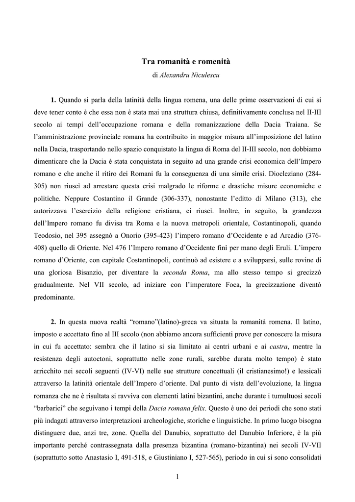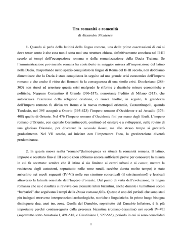 Tra romanità e romenità di Alexandru Niculescu 1. Quando si parla della latinità della lingua romena, una delle prime osservazioni di cui si deve tener conto è che essa non è stata mai una struttura chiusa, definitivamente conclusa nel II-III secolo ai tempi dell’occupazione romana e della romanizzazione della Dacia Traiana. Se l’amministrazione provinciale romana ha contribuito in maggior misura all’imposizione del latino nella Dacia, trasportando nello spazio conquistato la lingua di Roma del II-III secolo, non dobbiamo dimenticare che la Dacia è stata conquistata in seguito ad una grande crisi economica dell’Impero romano e che anche il ritiro dei Romani fu la conseguenza di una simile crisi. Diocleziano (284305) non riuscì ad arrestare questa crisi malgrado le riforme e drastiche misure economiche e politiche. Neppure Costantino il Grande (306-337), nonostante l’editto di Milano (313), che autorizzava l’esercizio della religione cristiana, ci riuscì. Inoltre, in seguito, la grandezza dell’Impero romano fu divisa tra Roma e la nuova metropoli orientale, Costantinopoli, quando Teodosio, nel 395 assegnò a Onorio (395-423) l’impero romano d’Occidente e ad Arcadio (376408) quello di Oriente. Nel 476 l’Impero romano d’Occidente finì per mano degli Eruli. L’impero romano d’Oriente, con capitale Costantinopoli, continuò ad esistere e a svilupparsi, sulle rovine di una gloriosa Bisanzio, per diventare la seconda Roma, ma allo stesso tempo si grecizzò gradualmente. Nel VII secolo, ad iniziare con l’imperatore Foca, la grecizzazione diventò predominante. 2. In questa nuova realtà “romano”(latino)-greca va situata la romanità romena. Il latino, imposto e accettato fino al III secolo (non abbiamo ancora sufficienti prove per conoscere la misura in cui fu accettato: sembra che il latino si sia limitato ai centri urbani e ai castra, mentre la resistenza degli autoctoni, soprattutto nelle zone rurali, sarebbe durata molto tempo) è stato arricchito nei secoli seguenti (IV-VI) nelle sue strutture concettuali (il cristianesimo!) e lessicali attraverso la latinità orientale dell’Impero d’oriente. Dal punto di vista dell’evoluzione, la lingua romanza che ne è risultata si ravviva con elementi latini bizantini, anche durante i tumultuosi secoli “barbarici” che seguivano i tempi della Dacia romana felix. Questo è uno dei periodi che sono stati più indagati attraverso interpretazioni archeologiche, storiche e linguistiche. In primo luogo bisogna distinguere due, anzi tre, zone. Quella del Danubio, soprattutto del Danubio Inferiore, è la più importante perché contrassegnata dalla presenza bizantina (romano-bizantina) nei secoli IV-VII (soprattutto sotto Anastasio I, 491-518, e Giustiniano I, 527-565), periodo in cui si sono consolidati 1 i centri romano-bizantini lungo il fiume (Oescus, Novae, Durostorum, che sono diventati anche centri di diffusione religiosa cristiana). La seconda zona comprenderebbe ciò che rimase in Transilvania e in Banato sul territorio dell’ex Dacia romana: Alburnus Maior, Napoca, Apulum, Tibiscum, dove gli archeologi hanno scoperto vestigia latine di questo periodo (Teodor 1981, p. 13). La terza zona - secondo alcuni archeologi - potrebbe essere quella a est dei Carpazi (nelle regioni di Botoşani, NeamŃ, Suceava, Vaslui, GalaŃi) dove ugualmente si sarebbero trovati insediamenti autoctoni di una popolazione «identica a quella del resto del territorio carpato-danubiano» (Teodor, p.15)- fatto che, secondo altri, sarebbe ancora da provare. Naturalmente in tutte queste regioni a nord, ma anche a sud del Danubio, soprattutto nel corso inferiore del fiume, dobbiamo tener conto della presenza dei Goti, i quali si cristianizzano, organizzano invasioni bellicose nell’Impero e riportano dalle regioni orientali prigionieri, alcuni di essi adepti della nuova religione di Cristo. Accanto a questi, probabilmente – sostengono alcuni storici romeni – ci sono dei ‘disertori romani’ del sud che ‘emigravano’ al nord per non «sottostare alle pesanti tasse» (Teodor 1981, p. 17). Ma queste affermazioni storico-archeologiche, la scoperta di ‘insediamenti’ e di necropoli non sono sufficienti per concluderne l’esistenza di «aree romanze intense» provviste di una «popolazione romanza carpato-danubiana» che avrebbe assicurato la continuità della lingua latina – come pretenderebbe Dan Teodor (1981, p. 16). Le affermazioni di Teodor riguardanti il «processo di romanizzazione» che avrebbe «potuto continuare a nord del Danubio, positivamente in special modo per la Muntenia e la Moldavia» (v. carta geografica, p. 97), vanno oltre i dati di cui dispone l’autore. Egli mette insieme «le città romano-bizantine sul Danubio», le quali sono potute diventare, come si sa, «fortezze militari di difesa», ma anche «veri centri di romanizzazione» (nonché centri religiosi cristiani) con tutto ciò che succedeva e si trovava sulla riva sinistra del Danubio fino ai Carpazi. Qui, a dispetto di alcune scoperte bizantine del V-VII secolo, non si può supporre con sicurezza l’esistenza in loco di antiche comunità latine (è altrettanto possibile che ci fossero insediamenti posteriori, poi abbandonati, di Goti o di altri popoli migratori. I resti archeologici che dovrebbero provare la continuità materiale nel tempo di una popolazione, possono durare in realtà molto tempo anche dopo la scomparsa della popolazione che ci ha abitato! Dunque è estremamente difficile formulare ipotesi riguardanti la continuità latinofona a nord del Danubio nello spazio strettamente carpato-danubiano. Per questo motivo, metodologicamente, è esagerato parlare di un latino ‘attivo’, dopo i secoli IV-V, nello spazio meridionale ‘carpatodanubiano’, in seguito Valacchia. Se esistono ancora resti di latinità in enclaves, in diverse regioni della ex Dacia romana, durante le lotte dell’Impero contro i ‘barbari’ (limizantes – ser