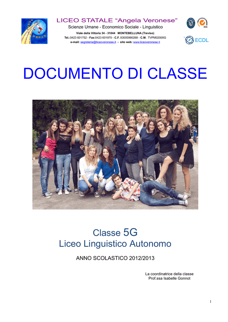 DOCUMENTO DI CLASSE Classe 5G Liceo Linguistico Autonomo ANNO SCOLASTICO 2012/2013 La coordinatrice della classe Prof.ssa Isabelle Gonnot 1 2 INDICE Elenco docenti della classe p.4 Elenco studenti della classe p.5 PARTE PRIMA Descrizione della scuola e del contesto ambientale p.6 PARTE SECONDA Finalità e obiettivi generali p.8 PARTE TERZA Criteri e strumenti di valutazione p.9 PARTE QUARTA Storia e profilo della classe p.13 Approfondimenti personali p.15 Simulazioni prove d'esame p.16 PROGRAMMI SVOLTI p.18 Italiano p.19 Latino p.24 Storia p.27 Ed.fisica p.30 Inglese p.31 Tedesco seconda lingua p.33 Francese terza lingua p.35 Matematica p.40 Filosofia p.42 Scienze p.44 Religione p.46 Appendice A p.47 Appendice B p.48 Appendice C p.49 Appendice D p.52 Appendice E p.54 Appendice F p.55 Appendice G p.56 3 ELENCO DOCENTI DELLA CLASSE 5 GLA COGNOME BOSCARINI NOME Piera MATERIA D’INSEGNAMENTO FIRMA RELIGIONE CHIAPPARINO Agnese Teresa ITALIANO IAZZETTA Virginia Natalia STORIA CHIAPPARINO Agnese Teresa LATINO VIVIANI Elisa 1° LINGUA - INGLESE MARION Mila CONVERSAZIONE INGLESE RIOLFO Claudia 2° LINGUA – TEDESCO NICKEL Helga CONVERSAZIONE TEDESCO GONNOT Isabelle 3° LINGUA – FRANCESE COSTANTINI Isabelle CONVERSAZIONE FRANCESE MATTIOLI Dario FILOSOFIA CECCHIN Francesca MATEMATICA GIORDANO Cosimina SCIENZE SPERIMENTALI BALSAMO Claudia EDUCAZIONE FISICA 4 ELENCO STUDENTI DELLA CLASSE 5 GLA COGNOME NOME 1 BORDIGNON Giorgia Andrea 2 CAON Elena 3 DALLA ROSA Beatrice 4 DE MARTIN Valentina 5 FACCHIN Angela Rita 6 FORNER Sofia 7 GIRARDI Annalisa 8 GOLLA Sara 9 HASANI Loredana 10 LIEVORE Rachele 11 PICCOLOTTO Sofia 12 POZZOBON Andrea 13 SALVALAGGIO Alessandra 14 SEMENCENCO Victor 15 TAVERNARO Greta 16 TREVISAN Eleonora 17 VIALETTO Margherita 18 ZAMPERONI Valentina FIRMA RAPPRESENTANTI DI CLASSE 5 PARTE PRIMA Descrizione della scuola e del contesto ambientale (territorio e sue caratteristiche) Introduzione L'Istituto ha cominciato ad operare a Montebelluna nell'anno scolastico 1966/67 come sezione staccata dell'Istituto magistrale "Duca degli Abruzzi" di Treviso. Nell'anno scolastico successivo (1967/68) ha ottenuto l'autonomia da Treviso; gli organi collegiali hanno quindi scelto la denominazione "Angela Veronese" in omaggio ad una poetessa locale del XVIII secolo. L’Istituto vanta una lunga storia di innovazione e sperimentazione didattica. Dopo aver avviato il nuovo corso quinquennale del Liceo Psico-Pedagogico, in sostituzione delle vecchie magistrali, ha iniziato la sperimentazione del nuovo Indirizzo Linguistico Brocca. Con l’introduzione della legge sull’Autonomia delle Istituzioni scolastiche (1999) l’Istituto ha avviato tre nuovi indirizzi, i cui programmi sono stati progettati dagli insegnanti stessi, tenendo conto delle esperienze di sperimentazione: il Liceo Linguistico Autonomo, il Liceo delle Scienze Sociali e il Liceo delle Scienze Umane. I tre indirizzi sono ormai tutti a regime. L’Istituto ha sempre investito per offrire agli studenti attrezzature tecnologiche aggiornate, e il corpo insegnante si contraddistingue per il notevole livello di conoscenza e uso delle nuove tecnologie. Contesto socio economico La scuola si colloca in un territorio particolarmente ricco sotto il profilo artigianale e industriale, che però vive in questo momento tutte le difficoltà e le contraddizioni in cui si dibatte l’intero Paese. Settori industriali (tessile, calzature, eccetera) che per anni hanno conosciuto una crescita continua e apparentemente senza limiti sono ora messi in crisi dal fenomeno della delocalizzazione e dalla concorrenza internazionale, basata su bassi costi del lavoro. Questo momento di passaggio rappresenta una sfida importante per il sistema dell’istruzione superiore. La riconversione produttiva del nostro territorio e dell’intero Paese non potrà prescindere, infatti, da consistenti investimenti privati e pubblici in ricerca e sviluppo e da un generale innalzamento dei livelli culturali dei giovani che si immettono sul mercato del lavoro. Da questo punto di vista, la scelta delle famiglie di investire su una scolarità di alto livello, aperta a tutte le facoltà universitarie, non appare frutto di una moda passeggera: un alto livello di istruzione, infatti, garantisce la necessaria flessibilità per inserirsi in un mercato del lavoro in veloce cambiamento, i cui bisogni, negli 8-10 anni che trascorrono tra l’iscrizione di uno studente al primo anno di corso e l’inserimento effettivo al termine degli studi universitari o postdiploma, sono difficili da prevedere. L’Istituto Veronese ha dunque saputo “intercettare” negli ultimi anni una domanda presente nel territorio di una scuola di tipo liceale, in grado di fornire la preparazione di base necessaria all’accesso universitario. A questo proposito, sulla base degli ultimi dati emersi dall’indagine Pisa (Programme for International Student Assessment) relativi all’anno 2003, il basso livello di competenze raggiunto dagli studenti italiani nei confronti internazionali risulta in realtà da una media tra tutti i tipi di scuola. Se si analizzano separatamente i dati relativi ai Licei, specie del Nord Est, si scopre che gli studenti italiani conseguono obiettivi che non hanno nulla da invidiare a quelli degli studenti finlandesi o coreani, che risultano essere i più brillanti. Naturalmente la scuola deve impegnarsi a corrispondere alle aspettative di alti livelli di preparazione e di qualità della formazione impartita insiti nella propria qualificazione liceale. Coerentemente con questa visione, l’Istituto si sta impegnando anche nel campo della formazione post-diploma, ed ha già organizzato due corsi IFTS (Formazione Tecnico Professionale Superiore Integrata), uno per la preparazione della figura professionale di Webmaster (2002) e uno per la preparazione della figura professionale di Officer for Immigration (2003-2004). Bacino di utenza Il bacino di utenza è molto vasto (con un raggio di circa 40 k