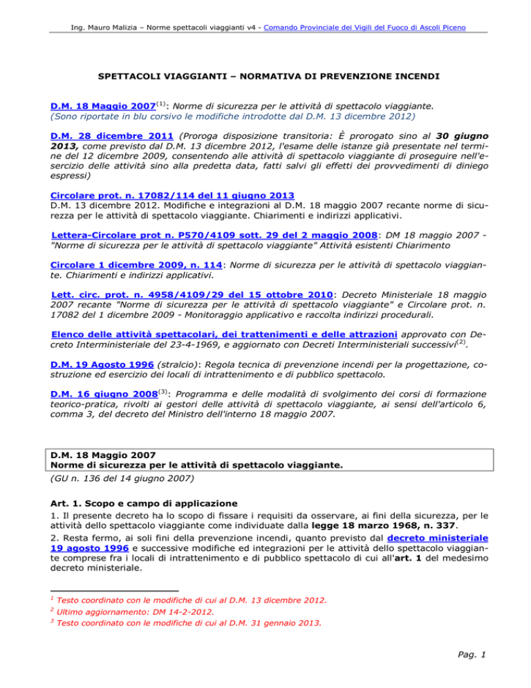 Ing. Mauro Malizia – Norme spettacoli viaggianti v4 - Comando Provinciale dei Vigili del Fuoco di Ascoli Piceno SPETTACOLI VIAGGIANTI – NORMATIVA DI PREVENZIONE INCENDI D.M. 18 Maggio 2007(1): Norme di sicurezza per le attività di spettacolo viaggiante. (Sono riportate in blu corsivo le modifiche introdotte dal D.M. 13 dicembre 2012) D.M. 28 dicembre 2011 (Proroga disposizione transitoria: È prorogato sino al 30 giugno 2013, come previsto dal D.M. 13 dicembre 2012, l'esame delle istanze già presentate nel termine del 12 dicembre 2009, consentendo alle attività di spettacolo viaggiante di proseguire nell'esercizio delle attività sino alla predetta data, fatti salvi gli effetti dei provvedimenti di diniego espressi) Circolare prot. n. 17082/114 del 11 giugno 2013 D.M. 13 dicembre 2012. Modifiche e integrazioni al D.M. 18 maggio 2007 recante norme di sicurezza per le attività di spettacolo viaggiante. Chiarimenti e indirizzi applicativi. Lettera-Circolare prot n. P570/4109 sott. 29 del 2 maggio 2008: DM 18 maggio 2007 "Norme di sicurezza per le attività di spettacolo viaggiante" Attività esistenti Chiarimento Circolare 1 dicembre 2009, n. 114: Norme di sicurezza per le attività di spettacolo viaggiante. Chiarimenti e indirizzi applicativi. Lett. circ. prot. n. 4958/4109/29 del 15 ottobre 2010: Decreto Ministeriale 18 maggio 2007 recante "Norme di sicurezza per le attività di spettacolo viaggiante" e Circolare prot. n. 17082 del 1 dicembre 2009 - Monitoraggio applicativo e raccolta indirizzi procedurali. Elenco delle attività spettacolari, dei trattenimenti e delle attrazioni approvato con Decreto Interministeriale del 23-4-1969, e aggiornato con Decreti Interministeriali successivi(2). D.M. 19 Agosto 1996 (stralcio): Regola tecnica di prevenzione incendi per la progettazione, costruzione ed esercizio dei locali di intrattenimento e di pubblico spettacolo. D.M. 16 giugno 2008(3): Programma e delle modalità di svolgimento dei corsi di formazione teorico-pratica, rivolti ai gestori delle attività di spettacolo viaggiante, ai sensi dell'articolo 6, comma 3, del decreto del Ministro dell'interno 18 maggio 2007. D.M. 18 Maggio 2007 Norme di sicurezza per le attività di spettacolo viaggiante. (GU n. 136 del 14 giugno 2007) Art. 1. Scopo e campo di applicazione 1. Il presente decreto ha lo scopo di fissare i requisiti da osservare, ai fini della sicurezza, per le attività dello spettacolo viaggiante come individuate dalla legge 18 marzo 1968, n. 337. 2. Resta fermo, ai soli fini della prevenzione incendi, quanto previsto dal decreto ministeriale 19 agosto 1996 e successive modifiche ed integrazioni per le attività dello spettacolo viaggiante comprese fra i locali di intrattenimento e di pubblico spettacolo di cui all'art. 1 del medesimo decreto ministeriale. 1 Testo coordinato con le modifiche di cui al D.M. 13 dicembre 2012. 2 Ultimo aggiornamento: DM 14-2-2012. 3 Testo coordinato con le modifiche di cui al D.M. 31 gennaio 2013. Pag. 1 Ing. Mauro Malizia – Norme spettacoli viaggianti v4 - Comando Provinciale dei Vigili del Fuoco di Ascoli Piceno 2-bis. Le attività di "spettacolo di strada" di cui alla sezione VI dell'elenco di cui all'articolo 4 della legge 18 marzo 1968, n. 337, sono escluse dal campo di applicazione del presente decreto, fermo restando l'obbligo del rispetto delle vigenti norme di sicurezza a tutela del pubblico e degli artisti. Art. 2. Definizioni 1. Ai fini del presente decreto, valgono le seguenti definizioni: a) attività di spettacolo viaggiante: attività spettacolari, trattenimenti e attrazioni, allestite mediante attrezzature mobili, o installate stabilmente, all'aperto o al chiuso, ovvero in parchi di divertimento. Tali attività sono quelle classificate per tipologia con decreto del Ministro per i beni e le attività culturali, ai sensi dell'art. 4 della legge 18 marzo 1968, n. 337(4); b) attrazione: singola attività dello spettacolo viaggiante compresa nella sezione I dell'apposito elenco ministeriale (autoscontro, giostra per bambini, ecc.); c) attività esistente: attività di spettacolo viaggiante compresa per tipologia nell'elenco di cui all'art. 4 della legge 18 marzo 1968, n. 337 e posta in esercizio sul territorio nazionale prima della entrata in vigore del presente decreto(5); d) parco di divertimento: complesso di attrazioni, trattenimenti ed attrezzature dello spettacolo viaggiante rispondente alle tipologie previste nell'elenco di cui all'art. 4 della legge 18 marzo 1968, n. 337, destinato allo svago, alle attività ricreative e ludiche, insistente su una medesima area e per il quale è prevista una organizzazione, comunque costituita, di servizi comuni; e) gestore: soggetto che ha il controllo dell'attività di spettacolo viaggiante e a cui fa capo la titolarità della licenza di cui all'art. 69 del testo unico delle leggi di pubblica sicurezza (TULPS). Nel caso dei parchi di divertimento, per le finalità del presente decreto, è equiparato al gestore, il direttore tecnico o responsabile della sicurezza che, per formale delega del gestore o del legale rappresentante del parco medesimo, sia preposto alla conduzione o al controllo di conduzione di una o più attrazioni; f) conduttore: persona delegata dal gestore come responsabile del funzionamento della attività quando questa è posta a disposizione del pubblico; g) manuale di uso e manutenzione: documento che contiene tutte le istruzioni, documentazioni, disegni e informazioni necessarie per un sicuro utilizzo dell'attività, incluse quelle relative al montaggio/smontaggio, al funzionamento in condizioni ordinarie e di emergenza e alla manutenzione ordinaria e straordinaria; h) libretto dell'attività: registro che contiene tutte le informazioni relative alla storia tecnica e amministrativa della attività a partire dalle fasi di progetto, esecuzione e collaudo ovvero i dati tecnici e le eventuali limitazioni di esercizio, l'elenco della documentazione tecnica e autorizzativa disp