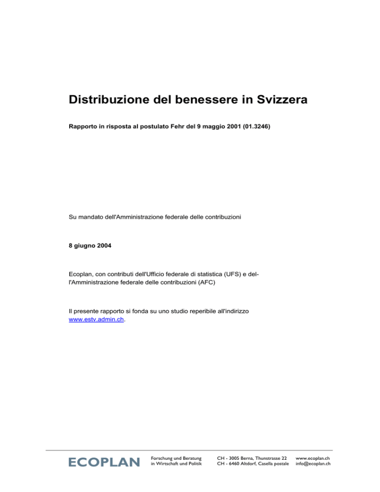 Distribuzione del benessere in Svizzera Rapporto in risposta al postulato Fehr del 9 maggio 2001 (01.3246) Su mandato dell'Amministrazione federale delle contribuzioni 8 giugno 2004 Ecoplan, con contributi dell'Ufficio federale di statistica (UFS) e dell'Amministrazione federale delle contribuzioni (AFC) Il presente rapporto si fonda su uno studio reperibile all'indirizzo www.estv.admin.ch. ECOPLAN Forschung und Beratung in Wirtschaft und Politik CH - 3005 Berna, Thunstrasse 22 CH - 6460 Altdorf, Casella postale www.ecoplan.ch [email protected] Colofone Autore: Titolo: Sottotitolo: Mandatario: Luogo: Anno: Documentazione: Ecoplan Distribuzione del benessere in Svizzera Rapporto in risposta al postulato Fehr del 9 maggio 2001 (01.3246) Amministrazione federale delle contribuzioni Berna 2004 Amministrazione federale delle contribuzioni (AFC) Gruppo di sostegno Bruno Jeitziner, AFC (capo del progetto) Olivier Brunner-Patthey, UFAS Andrea Haerter, UFAS Ruth Meier, UFS Caterina Modetta, UFS Rudi Peters, AFC Beat Schmid, UFS Gruppo del progetto Ecoplan André Müller (direzione del progetto) Michael Marti Robert Oleschak Stephan Osterwald L'elaborazione dei dati e la stesura del rapporto sono avvenute in stretta collaborazione con l'Amministrazione federale delle contribuzioni, l'Ufficio federale di statistica, l'Ufficio federale delle assicurazioni sociali ed Ecoplan. Il presente rapporto esprime il punto di vista degli autori, che non corrisponde necessariamente a quello del mandatario o dei membri del gruppo di sostegno. Ecoplan Forschung und Beratung in Wirtschaft und Politik www.ecoplan.ch Thunstrasse 22 CH - 3005 Berna Tel +41 31 356 61 61 Fax +41 31 356 61 60 [email protected] Casella postale CH - 6460 Altdorf Tel +41 41 870 90 60 Fax +41 41 872 10 63 [email protected] ECOPLAN Indice Indice Elenco delle abbreviazioni ..................................................................................................................2 Glossario ...............................................................................................................................................3 Rapporto in risposta al postulato Fehr del 9 maggio 2001 (01.3246) .............................................5 I nuovi risultati sulla distribuzione del benessere in Svizzera ................................................................5 Il reddito disponibile................................................................................................................................6 Distribuzione del reddito .........................................................................................................................8 Evoluzione dei redditi dal 1990 al 2001................................................................................................14 Ineguaglianza nella distribuzione della sostanza .................................................................................19 Il benessere non è soltanto una questione di reddito...........................................................................20 1 ECOPLAN Elenco delle abbreviazioni Elenco delle abbreviazioni AD Assicurazione contro la disoccupazione AFC Amministrazione federale delle contribuzioni AI Assicurazione per l'invalidità AVS Assicurazione per la vecchiaia e per i superstiti CHF Franchi svizzeri CITP Classificazione internazionale tipo delle professioni (International Standard Classification of Occupations; ISCO) CN Conti nazionali EL1 Economia domestica composta da persone esercitanti un'attività lucrativa, "1" designa il primo decile EP1 Economia domestica composta da pensionati, "1" designa il primo quartile IC90 Indagine sul consumo 1990 INPC Indice nazionale dei prezzi al consumo IPG Indennità per perdita di guadagno IRC Indagine sul reddito e sul consumo IRC98, 00 e Indagine sul reddito e sul consumo 1998, 2000 e 2001 01 LIS Luxembourg Income Study OCSE Organizzazione per la cooperazione e lo sviluppo economici PIL Prodotto interno lordo RIFOS Rilevazione sulle forze di lavoro in Svizzera RSS Rilevazione della struttura dei salari SEC 95 Sistema europeo dei conti 1995 seco Segretariato di Stato dell'economia UE Unione europea UFAS Ufficio federale delle assicurazioni sociali UFS Ufficio federale di statistica 2 ECOPLAN Glossario Glossario Approccio secondo l'economia domestica Misurando l'ineguaglianza (coefficiente di Gini e indice di Theil) si pone il problema di come debbano essere considerate le caratteristiche demografiche delle economie domestiche. Nel caso dell'approccio secondo l'economia domestica si converte unicamente il reddito delle economie domestiche sulla base di una scala di equivalenza affinché si possa confrontare queste ultime tra loro. Nel caso dell'approccio secondo le persone, si considera anche il numero di persone che compongono l'economia domestica. Approccio secondo le persone Misurando l'ineguaglianza (coefficiente di Gini e indice di Theil) si pone il problema di come debbano essere considerate le caratteristiche demografiche delle economie domestiche. Nel caso dell'approccio secondo l'economia domestica si converte unicamente il reddito delle economie domestiche sulla base di una scala di equivalenza affinché si possa confrontare queste ultime tra loro. Nel caso dell'approccio secondo le persone, si considera anche il numero di persone che compongono l'economia domestica. Coefficiente di Gini Questo indice misura la quantità d'ineguaglianza di un determinato fattore tra soggetti economici. Uno dei fattori comunemente utilizzati è il reddito e quindi il coefficiente di Gini è in grado di misurare le sperequazioni di reddito in una popolazione. Il coefficiente di Gini si situa tra 0 e 1. Lo 0 corrisponde all'equidistribuzione del reddito (ogni individuo consegue lo stesso reddito). Quanto più il coefficiente è elevato, tanto più il reddito è distribuito in modo ineguale. Contributo alla crescita L'espressione "contributo alla crescita" è spiegata ricorrendo all'esem