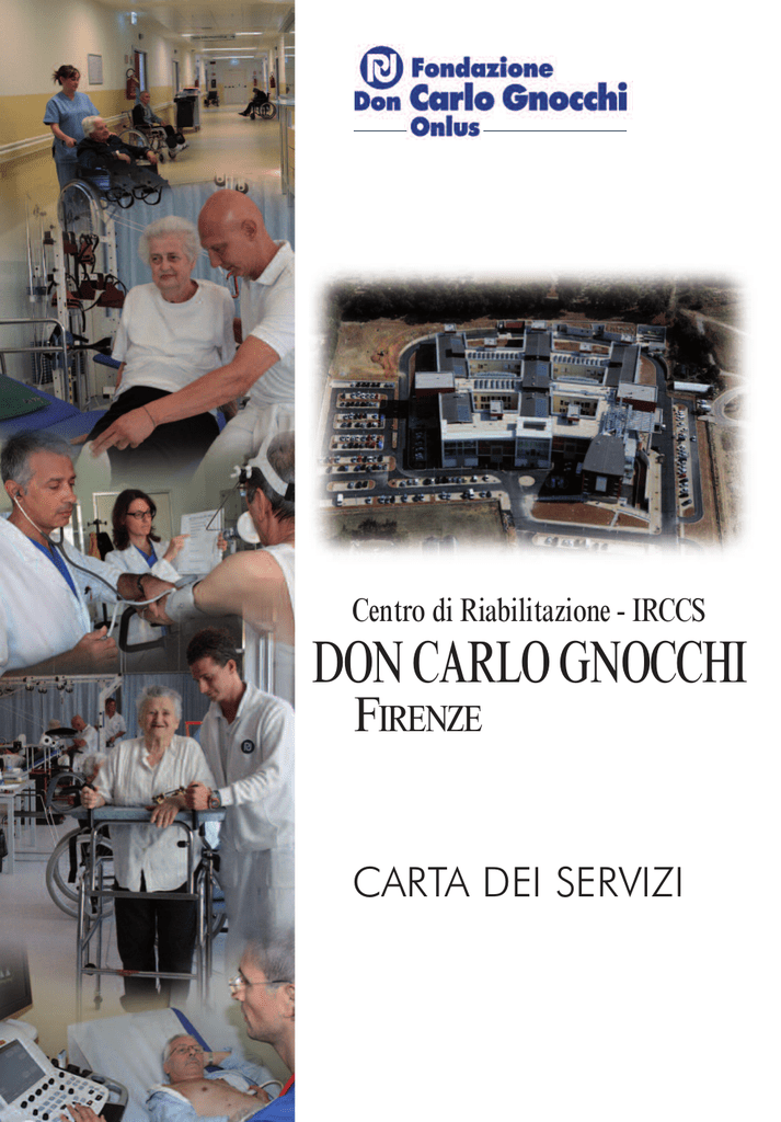 Centro di Riabilitazione - IRCCS DON CARLO GNOCCHI FIRENZE CARTA DEI SERVIZI Indice “Amis, ve raccomandi la mia baracca...” pag. 3 Il Centro IRCCS “Don Carlo Gnocchi” l Cenni storici pag. 5 l La struttura pag. 6 l L’attività sanitaria pag. 8 l Modalità di accesso pag. 10 l Le Unità di Riabilitazione pag. 12 l I Servizi pag. 18 l Trattamenti a pagamento (o in solvenza) pag. 20 l Informazioni utili pag. 21 l Ufficio Relazioni con il Pubblico (URP) pag. 27 l Impegni per la qualità pag. 28 l Ricerca scientifica e formazione pag. 31 l Diritti e doveri degli assistiti pag. 32 I Centri della Fondazione Don Gnocchi pag. 34 La Carta dei Servizi del Centro IRCCS “Don Carlo Gnocchi” è periodicamente revisionata per il costante aggiornamento degli standard di qualità. Edizione ottobre 2013. La versione aggiornata è comunque consultabile in rete, all’indirizzo www.dongnocchi.it/centri/documenti/cartafirenze.pdf 2 “Amis, ve raccomandi la mia baracca”: è il pressante invito rivolto agli amici, pochi giorni prima della morte, da don Carlo Gnocchi (1902-1956), ideatore e artefice della Fondazione che oggi porta il suo nome, solennemente beatificato il 25 ottobre 2009 nella storica piazza del Duomo di Milano, con una grande partecipazione di popolo. Il preoccupato e nel contempo fiducioso messaggio è un rimando accorato alla dimensione calorosa delle relazioni umane, un appello all’intelligente e rinnovata collaborazione di tutti alla definizione dei confini di una convinta identità, destinato a tracciare il perimetro di una motivata appartenenza alla “famiglia” della Fondazione, candidata a moltiplicarsi e a radicarsi sempre più nella coscienza degli operatori, in un servizio sanitario-riabilitativo, socio-assistenziale e socio-educativo qualitativamente rinnovato per rispondere ai bisogni dei più fragili. La valorizzazione del patrimonio ideale e operativo consegnatoci da don Carlo - nella linea della continuità del suo pensiero antropologico, della riflessione teologico-pedagogica e dell’azione clinico-riabilitativa - è ancora oggi fonte dell’esistere e ragione dell’agire della Fondazione. La fedeltà dell’Opera all’originario mandato del fondatore è testimoniata da oltre sessant’anni di vita Centro IRCCS “Don Carlo Gnocchi” Poli e Centri della Fondazione Don Gnocchi in Italia difficile e generosa e certificata da una molteplice e diversificata attività, capace di adattarsi dinamicamente ai tempi ed efficacemente ai bisogni mutevoli della domanda di salute degli uomini. Nella pluralità dei suoi Centri, la Fondazione svolge attività di cura, assistenza, riabilitazione, ricerca scientifica e tecnologica, formazione e sviluppo, solidarietà internazionale a favore delle persone colpite da eventi invalidanti, congeniti o acquisiti, operando affinchè le sue strutture siano luoghi di calda umanità, di fraterna prossimità, di un appassionato “prendersi cura” di ogni persona malata, sforzandosi di dare un’adeguata risposta medico-scientifica ai bisogni della persona fragile, disabile, dall’esordio all’epilogo della vita. Oggi la Fondazione Don Gnocchi eroga le proprie prestazioni in regime di accreditamento con il Servizio Sanitario Nazionale e Regionale ed opera in 28 Centri raggruppati in 8 Poli diffusi in nove regioni d’Italia, e in oltre 30 ambulatori territoriali, con più di 5.700 operatori tra personale dipendente e collaboratori professionali. Dispone complessivamente di 3.602 posti-letto di degenza piena e day hospital, con circa 10.000 persone curate o assistite ogni giorno. Da oltre un decennio ha esteso il proprio campo di intervento oltre i confini nazionali, realizzando progetti di solidarietà in diversi Paesi del mondo. L’attività sanitaria non esaurisce però la “mission” della Fondazione, che si sente chiamata - a partire dalle intuizioni profetiche del suo fondatore - alla promozione di una “nuova” cultura di attenzione ai bisogni dell’uomo, nel segno dell’alleanza con aggregazioni private e in collaborazione con le strutture pubbliche. Né mancherà il suo costante e rigoroso impegno nell’orizzonte della promozione e tutela dei diritti di cittadinanza - tra cui il diritto alla salute e dunque alla riabilitazione e all’assistenza - perchè questa “Carta dei Servizi” sia sempre più specchio e riflesso del suo operare quotidiano. Mons. Angelo Bazzari Presidente della Fondazione Don Carlo Gnocchi 3 Il Centro IRCCS “Don Carlo Gnocchi” Gentile signora, egregio signore, nel darle il benvenuto all’IRCCS Centro di riabilitazione “Don Carlo Gnocchi” di Firenze, ho il piacere di presentare, attraverso questo documento, la pluralità di servizi offerti dalla nostra struttura, nell’auspicio che possa trovarsi a suo agio per tutta la durata del suo ricovero. Mi preme innanzitutto ricordare che lo spirito che muove la nostra organizzazione fa riferimento concreto e continuo ai valori che ci arrivano dal nostro fondatore, don Carlo Gnocchi, in coerenza al suo mandato e al suo messaggio per un’attività di attenzione e centralità della persona sofferente I principali scopi che ispirano la nostra attività quotidiana si possono riassumere in una serie di punti fondamentali: assistenza, tutela della salute, cura e recupero funzionale, sociale e morale di soggetti svantaggiati, di qualunque età, sesso e condizione,affetti da minorazioni fisiche, psichiche o sensoriali; l organizzazione ed erogazione delle prestazioni dirette alla cura e alla riabilitazione di soggetti con patologie invalidanti, temporanee o stabilizzate; l sostegno nel reinserimento familiare, lavorativo e sociale dei soggetti dimessi dal trattamento riabilitativo; l realizzazione e diffusione di protesi, risorse e ausili per la riduzione degli stati di minorazione e per la facilitazione delle persone svantaggiate; l promozione culturale, formazione e aggiornamento dei soggetti che, a titolo professionale o volontario, operano nel