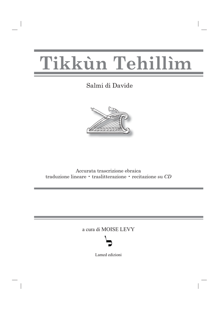 Tikkùn Tehillìm Salmi di Davide Accurata trascrizione ebraica traduzione lineare • traslitterazione • recitazione su CD a cura di MOISE LEVY Lamed edizioni Tikkùn Tehillìm VII ק''ק רומא יע''א COMUNITÀ EBRAICA DI ROMA הרבנות הראשית ב''ה Roma, Shevàt 5765 - Gennaio 2005 .......................................................................... L,tevere Cenci Tel 06-68400651-2 Fax 06 68400655 IL RABBINO CAPO Con questa edizione del libro dei Tehillìm, Moisè Levy aggiunge un ulteriore merito a una lista di sue opere prestigiose, dalla traduzione del Kitzùr Shulchàn Arùch alla Torà con traduzione secondo il commento di Rashi. C’è da chiedersi che necessità ci sia oggi di una nuova edizione italianaebraica dei Tehillìm, rispetto a quanto abbiamo ereditato di buone opere in passato, quando più recentemente, anche in questi giorni, compaiono nuove edizioni. La risposta appare evidente osservando le caratteristiche del tutto particolari di questo libro: il testo ebraico in caratteri tipografici ben leggibili, accompagnato da speciali segnali che ne facilitano la lettura (dove cade l’accento, dove si deve raddoppiare la consonante, dove si legge lo shevà ecc.), una nuova accurata traduzione italiana, la traslitterazione dell’ebraico per aiutare chi non ha sufficiente familiarità con il testo ebraico ma vuole comunque recitarlo con attenzione; titoli riassuntivi e note essenziali; il testo ebraico affiancato da quello italiano, verso per verso, per facilitare la comprensione immediata. Moisè Levy si inserisce in una nobile tradizione rabbinica italiana, che ha sempre sottolineato l’importanza della fedeltà alle caratteristiche linguistiche e grammaticali del testo e l’essenziale rilievo da dare alla corretta pronuncia così come è stata definita dai Masoreti con il loro sistema di punteggiatura e di segni aggiuntivi: l’essenza del testo si coglie prima di tutto rispettandone gli aspetti formali, che aprono la porta ai suoi molteplici significati, da quelli semplici a quelli più profondi, di cui specialmente il libro dei Tehillìm è tra i più ricchi nel Tanàch. È proprio questa ricchezza di contenuti che fa del libro dei Tehillìm una delle opere religiose più care all’animo del popolo ebraico e non solo del popolo ebraico. Essi offrono a ogni lettore identificazione, conforto, speranza, fiducia, gioia, senso del mistero e ogni nuova opera che contribuisca a diffondere questo libro è benvenuta. Grazie a Moisè Levy per questa grande fatica, che non rimarrà certamente senza frutti benefici. Riccardo Di Segni IX Tikkùn Tehillìm XI Tikkùn Tehillìm Introduzione ai salmi «Q uesto è il libro della genealogia dell’uomo» (Bereshìt 5, 1). Ciò t’insegna che il Santo, benedetto sia, mostrò ad Adamo la vita di ogni essere vivente. Egli vide che al re Davide erano destinati soli tre anni di vita. «Signore del mondo – disse – prendi dalla mia vita settant’anni e donali a Davide. Egli li adopererà per comporre i Salmi che allieteranno la vita dell’uomo di generazione in generazione» (Midràsh Yalkùt Shimonì Bereshìt 41). Davide compose parte del Salterio nei momenti più difficili della sua vita quando, nascosto nelle grotte del deserto per scappare dai nemici, ripose tutta la sua fede nell’aiuto di Dio. Ma lo stesso Davide, attraverso i Salmi, dichiarò anche la sua infinita gioia e il proprio ringraziamento al Signore nei momenti di massima felicità. Nel comporre il suo libro Davide non si soffermò solo a considerare la propria situazione, bensì cercò di esaminare la condizione e il sentimento di ogni uomo partendo dalla propria esperienza personale (Pesachìm 117 a). In un certo senso egli fu, come dicono i Maestri, il primo shalìach tzibbùr (rappresentante del pubblico durante la preghiera) del popolo ebraico. Non è dunque un caso che il siddùr tefillà (prontuario di preghiere) sia formato in gran parte da Tehillìm (Salmi). Al tempo del Santuario, l’offerta dei sacrifici quotidiani era accompagnata dalla lettura dei Salmi, ma è da tempo immemorabile che con le loro parole l’ebreo esprime a Dio il proprio dolore e il proprio sconforto, la sua fede e la ricerca di sostegno e di protezione oppure la sua felicità per gli avvenimenti più allegri della propria vita. I Tehillìm e la Torà Lungi dall’essere solo un libro di inni e poesie, i Tehillìm si possono annoverare tra i libri profetici del canone biblico. Già Iosèf Chaìm (Spagna XV secolo) nella sua lunga prefazione al commento ai Salmi, scrisse infatti: «Re Davide ebbe la capacità di comporre la sua opera in quanto era un uomo integro e pervaso dallo spirito divino com’è scritto: “Detto di Davide figlio di Ishài…Lo spirito divino parlò in me e la Sua parola fu sulla mia bocca”» (II Samuele 23, 1-2). È interessante notare che l’espressio- ִתּקּוּן ְתּ ִה ִלּים XII ne «la Sua parola fu sulla mia bocca» ben ricorda le parole di Bemidbàr 12, 8: «Bocca a bocca mi rivolgo a lui» attraverso le quali Dio stesso rivela a Miriàm e Aròn la particolarità della profezia di Moshè. In effetti, la tradizione ebraica accomuna spesso la persona di Moshè e quella di Davide. Se Moshè è il grande tra i profeti, Davide lo è tra i re d’Israele (Midràsh Tehillìm). Entrambi morirono di Shabbàt e, secondo una fonte rabbinica, l’anima di entrambi salì in paradiso il 7 di Adàr. Toràt Moshè e Tehillà leDavìd, la Torà di Moshè e i Salmi di Davide, sono opere che si completano a vicenda e che devono convivere nel cuore di ogni ebreo. Israele per sopravvivere ha bisogno di entrambe. La lettura dei Salmi, se effettuata con il giusto sentimento e la necessaria concentrazione, sviluppa il senso di iràt shamàim, di timore reverenziale di Dio, senza il quale lo studio della Torà e l’osservanza dei precetti perderebbe gran parte del suo senso (Èretz Hachaiìm). D’altro canto, l’uomo che si limita alla so