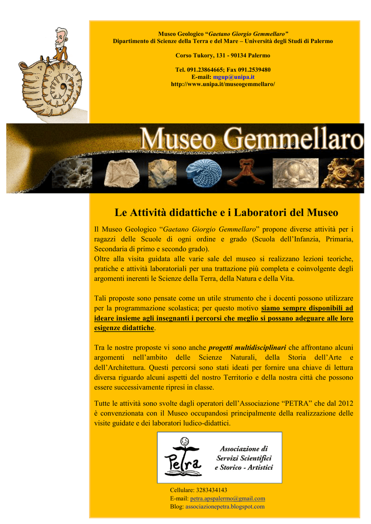 Museo Geologico “Gaetano Giorgio Gemmellaro” Dipartimento di Scienze della Terra e del Mare – Università degli Studi di Palermo Corso Tukory, 131 - 90134 Palermo Tel. 091.23864665; Fax 091.2539480 E-mail: [email protected] http://www.unipa.it/museogemmellaro/ Le Attività didattiche e i Laboratori del Museo Il Museo Geologico “Gaetano Giorgio Gemmellaro” propone diverse attività per i ragazzi delle Scuole di ogni ordine e grado (Scuola dell’Infanzia, Primaria, Secondaria di primo e secondo grado). Oltre alla visita guidata alle varie sale del museo si realizzano lezioni teoriche, pratiche e attività laboratoriali per una trattazione più completa e coinvolgente degli argomenti inerenti le Scienze della Terra, della Natura e della Vita. Tali proposte sono pensate come un utile strumento che i docenti possono utilizzare per la programmazione scolastica; per questo motivo siamo sempre disponibili ad ideare insieme agli insegnanti i percorsi che meglio si possano adeguare alle loro esigenze didattiche. Tra le nostre proposte vi sono anche progetti multidisciplinari che affrontano alcuni argomenti nell’ambito delle Scienze Naturali, della Storia dell’Arte e dell’Architettura. Questi percorsi sono stati ideati per fornire una chiave di lettura diversa riguardo alcuni aspetti del nostro Territorio e della nostra città che possono essere successivamente ripresi in classe. Tutte le attività sono svolte dagli operatori dell’Associazione “PETRA” che dal 2012 è convenzionata con il Museo occupandosi principalmente della realizzazione delle visite guidate e dei laboratori ludico-didattici. Cellulare: 3283434143 E-mail: [email protected] Blog: associazionepetra.blogspot.com VISITA GUIDATA L’itinerario didattico si svolge attraverso un percorso all’interno delle sale espositive del Museo che illustra la storia geo-paleontologica del nostro pianeta, in modo semplice, accattivante ma con rigore scientifico, ponendo particolare attenzione alla Sicilia. La durata di una visita guidata è di circa un’ora - un’ora e mezza. Costo Ingresso ridotto per scolaresche 2,00 € ad alunno LABORATORI Le attività di laboratorio consistono in giochi ed esercitazioni di gruppo volti all’osservazione e alla manipolazione diretta di materiali e reperti. Le attività si svolgono nei laboratori del Museo. Di seguito viene presentato l’elenco di tutte le nostre proposte differenziate per ordine e grado scolastico: Scuola dell’Infanzia Scuola Primaria Scuola Secondaria di Primo Grado Scuola Secondaria di Secondo Grado Costo singolo laboratorio per scolaresche 3,00 € ad alunno “GEOGIOCHIAMO” (durata 30-45 minuti per una sola attività a scelta) Ripercorriamo le nozioni apprese durante la visita attraverso dei divertenti giochi didattici a premi come la “Tombola dei fossili”, “Di Era… in Era”, il “Memo: Impariamo dai Cartoni” o il “Quizzone Gemmellaro”. “L’EVOLUZIONE DELLA VITA SULLA TERRA” (durata 1 ora) Studiando i fossili e le loro caratteristiche ricostruiamo le tappe fondamentali della storia della vita sulla Terra. Cos’è un fossile, come e dove si forma? Quanti e quali sono i processi di fossilizzazione? Osservando alcuni reperti andiamo alla scoperta dei segreti del passato custoditi nelle rocce e collochiamoli in una colonna stratigrafica. “CREA IL TUO FOSSILE” (durata 1 ora) Ripercorriamo le Ere Geologiche attraverso delle divertenti attività di manipolazione. Impariamo a realizzare i calchi di alcuni tra i fossili più rappresentativi della lunga storia del nostro pianeta. “UN GIORNO DA PALEONTOLOGO” (durata 1 ora) Un percorso completo alla scoperta dell’affascinante mondo dei fossili che coinvolgerà gli studenti nella simulazione di uno scavo paleontologico. Dal recupero al riconoscimento di alcuni fossili scopriamo quanto è divertente il mestiere del paleontologo. “INCONTRIAMO THEA” (durata 1 ora) Scopriamo come viveva l’uomo primitivo attraverso le sue principali espressioni artistiche. Sono previste tre diverse tipologie di laboratorio a scelta tra: realizzazione di manufatti in argilla; realizzazione di graffiti. “DA UN OSSO POSSIAMO SCOPRIRE CHE…” (durata 1 ora) Impariamo a riconoscere le ossa e i denti degli animali più comuni utilizzando i reperti delle Collezioni osteologiche del Museo e le tavole di confronto. Osserviamoli e scopriamo insieme qual è la struttura di ossa e denti, le loro forme, abitudini alimentari partendo dall’analisi dei crani e tante altre particolarità. “INFINITAMENTE PICCOLO: IL MONDO INVISIBILE” (durata 1 ora) Un percorso dedicato ai microfossili che spesso si rivelano fondamentali per la datazione delle rocce. Armati di microscopio e pinzette andiamo alla ricerca dei minuscoli fossili che si possono trovare in una manciata di sabbia. Scopriremo un mondo sconosciuto. “CONOSCIAMO INSIEME LE ROCCE E I MINERALI” (durata 1 ora) Con l’ausilio delle collezioni petrografiche e mineralogiche del Museo impariamo a riconoscere i principali gruppi di rocce e i minerali più caratteristici e insieme andiamo alla scoperta della loro rilevanza nell’economia e nella nostra vita quotidiana. Prenotazioni e Informazioni Per le scolaresche e per i gruppi è obbligatoria la prenotazione da effettuare chiamando il numero 091.23864665 Il modulo per confermare la vostra prenotazione di visite guidate e/o delle attività laboratoriali viene di seguito allegato e dovrà farsi pervenire almeno 10 giorni prima dello svolgimento delle attività al numero di FAX 091.2539480 Agli stessi recapiti e a quelli riportanti in copertina sarà possibile contattare per qualsiasi vostra altra informazione il Museo e l’Associazione “PETRA”. … VI ASPETTIAMO PER FARE INSIEME UNO STRAORDINARIO “VIAGGIO NEL TEMPO” … MODULO PRENOTAZIONE Museo Geologico “Gaetano Giorgio Gemmellaro” Dipartimento di Scienze della Terra e del Mare Corso Tukory, 131 90134 Palermo Tel. 091.23864665; Fax 091.2539480 E-m