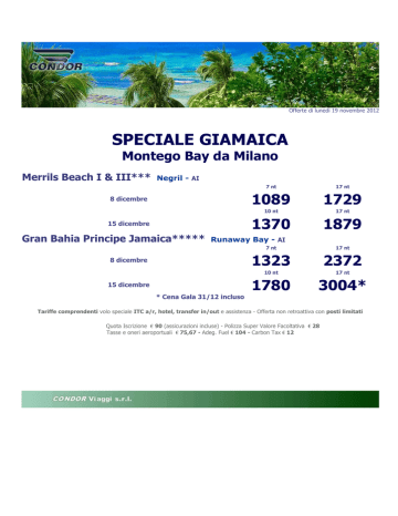 Offerte di lunedì 19 novembre 2012 SPECIALE GIAMAICA Montego Bay da Milano Merrils Beach I & III*** Negril - AI 8 dicembre 15 dicembre Gran Bahia Principe Jamaica***** 7 nt 17 nt 1089 1729 10 nt 17 nt 1370 1879 Runaway Bay - AI 8 dicembre 15 dicembre 7 nt 17 nt 1323 2372 10 nt 17 nt 1780 3004* * Cena Gala 31/12 incluso Tariffe comprendenti volo speciale ITC a/r, hotel, transfer in/out e assistenza - Offerta non retroattiva con posti limitati Quota Iscrizione € 90 (assicurazioni incluse) - Polizza Super Valore Facoltativa € 28 Tasse e oneri aeroportuali € 75,67 - Adeg. Fuel € 104 - Carbon Tax € 12