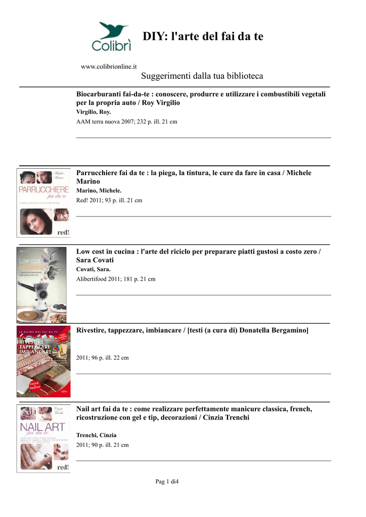 DIY: l'arte del fai da te www.colibrionline.it Suggerimenti dalla tua biblioteca Biocarburanti fai-da-te : conoscere, produrre e utilizzare i combustibili vegetali per la propria auto / Roy Virgilio Virgilio, Roy. AAM terra nuova 2007; 232 p. ill. 21 cm Parrucchiere fai da te : la piega, la tintura, le cure da fare in casa / Michele Marino Marino, Michele. Red! 2011; 93 p. ill. 21 cm Low cost in cucina : l'arte del riciclo per preparare piatti gustosi a costo zero / Sara Covati Covati, Sara. Alibertifood 2011; 181 p. 21 cm Rivestire, tappezzare, imbiancare / [testi (a cura di) Donatella Bergamino] 2011; 96 p. ill. 22 cm Nail art fai da te : come realizzare perfettamente manicure classica, french, ricostruzione con gel e tip, decorazioni / Cinzia Trenchi Trenchi, Cinzia 2011; 90 p. ill. 21 cm Pag 1 di4 Cooperativa Colibri – Bibliografia Settembre DIY: l'arte del fai da te - Suggerimenti dalla tua biblioteca Stampato il : 01/09/2014 Restaurare e riparare mobili 2012; 95 p. ill. color. 24 cm Design fai da te 2.0 : nuove idee contro la crisi / Recession Design ; prefazione di Alessandro Mendini Recession Design 2013; 311 p. ill. 25 cm Io ricreo : manunale di riciclo creativo / Francesco Di Biaso ; illustrazioni Maddalena Gerli Di Biaso, Francesco 2013; Makers : il ritorno dei produttori : per una nuova rivoluzione industriale / Chris Anderson Anderson, Chris 2013; VIII, 311 p. 22 cm Nails, nails, nails! : 25 strepitosi look fai da te / Madeline Poole ; fotografie di Lara Rossignol Poole, Madeline 2013; 127 p. ill. 16 cm Pag 2 di4 Cooperativa Colibri. Bibliografia Settembre DIY: l'arte del fai da te - Suggerimenti dalla tua biblioteca Stampato il : 01/09/2014 Pulizie creative : detersivi e cosmetici naturali fai-da-te : 25 ricette per la casa e la cura di sé / Elisa Nicoli Nicoli, Elisa 2013; 96 p. 15 cm 500 piccoli progetti : da realizzare all'uncinetto, a maglia, con il feltro e con il cucito / Nguyen Le Le, Nguyen 2013; 288 p. ill. 15 cm Facciamoci le feste : manuale dell'ecofesta fai da te : dal matrimonio al compleanno, dagli inviti ai regali / Massimo Acanfora Acanfora, Massimo Altreconomia 2013; 143 p. ill. 19 cm 100 cult in padella : succede solo a casa tua! : come reinventare "i classici" del cibo industriale : 100 ricette fai-da-te, ecologiche e sane / Elisa Nicoli Nicoli, Elisa 2013; 96 p. 15 cm Autoproduzione in cucina : fai da te quello che di solito acquisti per risparmiare e mangiare bene / Lisa Casali ; fotografie di Francesca Brambilla e Serena Serrani Casali, Lisa 2013; 193 p. fotografie 24 cm Pag 3 di4 Cooperativa Colibri. Bibliografia Settembre DIY: l'arte del fai da te - Suggerimenti dalla tua biblioteca Stampato il : 01/09/2014 La società dei makers : la creatività dal fai da te al web 2.0 / David Gauntlett ; prefazione di Stefano Micelli Gaunlett, David 2013; 318 p. 21 cm Saponi e cosmetici fai da te : manuale completo di formule, ricette e segreti per una bellezza facile e naturale / Tatiana Maselli Maselli, Tatiana 2014; 161 p. 21 cm Io lo faccio da me : il meglio del fai da te ecologico, dai detersivi alla tinteggiatura, senza dimenticare conserve, giocattoli e piccole riparazioni con un occhio al portafoglio e uno all'ambiente / Giovanna Olivieri Olivieri, Giovanna 2014; 200 p. ill. 24 cm Made by me : [una guida di cucito, maglia e ricamo... punto per punto] / Jane Bull Bull, Jane 2014; 63 p. 29 cm Shooting yourself : l'autoritratto ai tempi dei social network / Haje Jan Kamps Kamps, Haje Jan 2013; 160 p. ill. 16 cm Pag 4 di4 Bibliograf Bi
