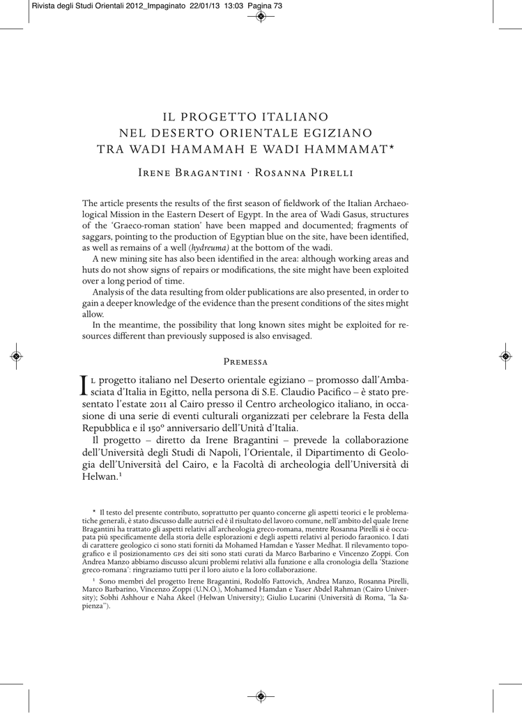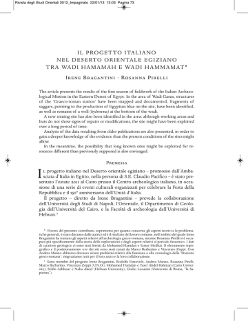Rivista degli Studi Orientali 2012_Impaginato 22/01/13 13:03 Pagina 73 IL PROGET TO ITA L IA N O NEL DESERTO ORIE N TA L E E G IZ IA N O TR A WADI HAMAMAH E WA D I H A M M A M AT * Irene Bragantini · Rosanna Pirelli The article presents the results of the first season of fieldwork of the Italian Archaeological Mission in the Eastern Desert of Egypt. In the area of Wadi Gasus, structures of the ‘Graeco-roman station’ have been mapped and documented; fragments of saggars, pointing to the production of Egyptian blue on the site, have been identified, as well as remains of a well (hydreuma) at the bottom of the wadi. A new mining site has also been identified in the area: although working areas and huts do not show signs of repairs or modifications, the site might have been exploited over a long period of time. Analysis of the data resulting from older publications are also presented, in order to gain a deeper knowledge of the evidence than the present conditions of the sites might allow. In the meantime, the possibility that long known sites might be exploited for resources different than previously supposed is also envisaged. Premessa I l progetto italiano nel Deserto orientale egiziano – promosso dall’Ambasciata d’Italia in Egitto, nella persona di S.E. Claudio Pacifico – è stato presentato l’estate 2011 al Cairo presso il Centro archeologico italiano, in occasione di una serie di eventi culturali organizzati per celebrare la Festa della Repubblica e il 150º anniversario dell’Unità d’Italia. Il progetto – diretto da Irene Bragantini – prevede la collaborazione dell’Università degli Studi di Napoli, l’Orientale, il Dipartimento di Geologia dell’Università del Cairo, e la Facoltà di archeologia dell’Università di Helwan.1 * Il testo del presente contributo, soprattutto per quanto concerne gli aspetti teorici e le problematiche generali, è stato discusso dalle autrici ed è il risultato del lavoro comune, nell’ambito del quale Irene Bragantini ha trattato gli aspetti relativi all’archeologia greco-romana, mentre Rosanna Pirelli si è occupata più specificamente della storia delle esplorazioni e degli aspetti relativi al periodo faraonico. I dati di carattere geologico ci sono stati forniti da Mohamed Hamdan e Yasser Medhat. Il rilevamento topografico e il posizionamento gps dei siti sono stati curati da Marco Barbarino e Vincenzo Zoppi. Con Andrea Manzo abbiamo discusso alcuni problemi relativi alla funzione e alla cronologia della ‘Stazione greco-romana’: ringraziamo tutti per il loro aiuto e la loro collaborazione. 1 Sono membri del progetto Irene Bragantini, Rodolfo Fattovich, Andrea Manzo, Rosanna Pirelli, Marco Barbarino, Vincenzo Zoppi (U.N.O.), Mohamed Hamdan e Yaser Abdel Rahman (Cairo University); Sobhi Ashhour e Naha Akeel (Helwan University); Giulio Lucarini (Università di Roma, “la Sapienza”). Rivista degli Studi Orientali 2012_Impaginato 22/01/13 13:03 Pagina 74 74 irene bragantini · rosanna pirelli [2] La prima stagione, prevista per il mese di ottobre 2011, è stata effettuata con notevole ritardo a causa delle condizioni generali del Paese:2 l’incertezza sulle date e sulla disponibilità dei permessi militari ha inoltre comportato un notevole ridimensionamento della missione sia in termini di durata sia per ciò che concerne il numero dei partecipanti.3 La missione è stata finanziata dall’Università degli Studi Napoli, l’Orientale e dal Ministero degli Affari Esteri. La strumentazione tecnica per la documentazione grafica e fotografica è stata fornita dal c.i.s.a. (Centro Interdipartimentale di servizi per l’Archeologia) dello stesso Ateneo.4 L’area interessata dal progetto è quella parte di Deserto Orientale che si estende immediatamente a est della regione tebana (Fig. 1.A), un territorio estremamente importante in quasi tutte le epoche della storia d’Egitto, non solo in virtù della sua posizione strategica per le vie di comunicazione che legavano la Valle del Nilo al Mar Rosso (nel punto di massima vicinanza tra i due), ma anche per la natura geologica del territorio, caratterizzato da un consistente affioramento del basamento pre-cambriano, da cui la localizzazione di numerosissime cave di rocce (soprattutto ignee) utilizzate per l’architettura e la statuaria egiziana e quella di miniere d’oro e altri minerali.5 In età romana, per sfruttare le ricche risorse naturali dell’area e controllarne il potenziale economico, di importanza strategica per i beni di lusso in arrivo dall’Oriente, qui – come nel resto dell’impero – l’amministrazione romana ha creato e mantenuto una complessa rete di siti, che la missione intende indagare, articolando la lettura del paesaggio a partire dalle risorse naturali che esso offre. Il limite settentrionale della concessione include il Wadi Hamamah, mentre quello meridionale passa a nord del Wadi Hammamat (Fig. 1.B), una via che – per la sua importanza e il gran numero di iscrizioni e incisioni rupestri che la caratterizzano lungo buona parte del suo percorso – è stata oggetto di numerosi studi, nel passato come anche in tempi più recenti.6 Possiamo quindi considerare la nostra area come limitata a nord e a sud dai molti progetti di ricerca condotti da Istituzioni di diversi Paesi: basti ricordare i lavori e le pubblicazioni relative al Mons Claudianus e al Mons Porphyrites, mentre a 2 La missione si è svolta tra la fine di dicembre 2011 e l’inizio di gennaio 2012. Vi hanno preso parte Irene Bragantini, Marco Barbarino, Vincenzo Zoppi, Rosanna Pirelli, Mohamed Hamdan e Yaser Abdel Rahman Desideriamo ringraziare il Supreme Council of Antiquities, rappresentato dal Dr. Amer Abdelkarim Abu el Hassan, che ha fattivamente collaborato alle nostre attività. 3 Siamo estremamente grati al Ministero di Stato per le Antichità e alle Autorità militari per l’autorizzazione a condurre ricerche nell’area e per il sostegno fornito alle attività della mission