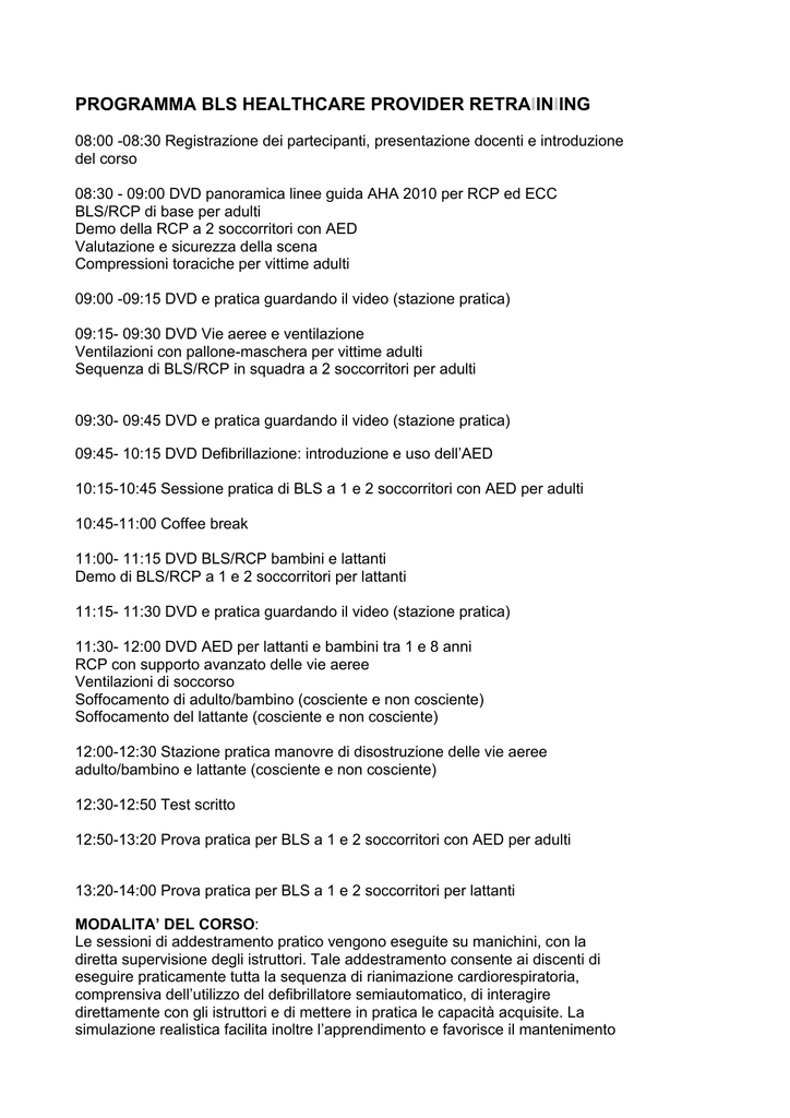 PROGRAMMA BLS HEALTHCARE PROVIDER RETRAIINIING 08:00 -08:30 Registrazione dei partecipanti, presentazione docenti e introduzione del corso 08:30 - 09:00 DVD panoramica linee guida AHA 2010 per RCP ed ECC BLS/RCP di base per adulti Demo della RCP a 2 soccorritori con AED Valutazione e sicurezza della scena Compressioni toraciche per vittime adulti 09:00 -09:15 DVD e pratica guardando il video (stazione pratica) 09:15- 09:30 DVD Vie aeree e ventilazione Ventilazioni con pallone-maschera per vittime adulti Sequenza di BLS/RCP in squadra a 2 soccorritori per adulti 09:30- 09:45 DVD e pratica guardando il video (stazione pratica) 09:45- 10:15 DVD Defibrillazione: introduzione e uso dell’AED 10:15-10:45 Sessione pratica di BLS a 1 e 2 soccorritori con AED per adulti 10:45-11:00 Coffee break 11:00- 11:15 DVD BLS/RCP bambini e lattanti Demo di BLS/RCP a 1 e 2 soccorritori per lattanti 11:15- 11:30 DVD e pratica guardando il video (stazione pratica) 11:30- 12:00 DVD AED per lattanti e bambini tra 1 e 8 anni RCP con supporto avanzato delle vie aeree Ventilazioni di soccorso Soffocamento di adulto/bambino (cosciente e non cosciente) Soffocamento del lattante (cosciente e non cosciente) 12:00-12:30 Stazione pratica manovre di disostruzione delle vie aeree adulto/bambino e lattante (cosciente e non cosciente) 12:30-12:50 Test scritto 12:50-13:20 Prova pratica per BLS a 1 e 2 soccorritori con AED per adulti 13:20-14:00 Prova pratica per BLS a 1 e 2 soccorritori per lattanti MODALITA’ DEL CORSO: Le sessioni di addestramento pratico vengono eseguite su manichini, con la diretta supervisione degli istruttori. Tale addestramento consente ai discenti di eseguire praticamente tutta la sequenza di rianimazione cardiorespiratoria, comprensiva dell’utilizzo del defibrillatore semiautomatico, di interagire direttamente con gli istruttori e di mettere in pratica le capacità acquisite. La simulazione realistica facilita inoltre l’apprendimento e favorisce il mantenimento nel tempo delle conoscenze e delle abilità pratiche acquisite. ı_VALUTAZIONE FINALE: I partecipanti verranno valutati per le loro conoscenze teoriche attraverso un test scritto; la valutazione riguarderà anche l’acquisizione di abilità pratiche attraverso una prova con simulazione pratica delle diverse fasi della sequenza di rianimazione cardiorespiratoria. ı_CERTIFICAZIONE: Ai partecipanti che raggiungeranno un adeguato score di valutazione nella prova teorica (minimo 84%) verrà rilasciato un attestato ed una Card di “Esecutore BLS - LL. Guida AHA” (BLS Provider). Tale certificazione ha validità di due anni ed è riconosciuta a livello nazionale ed internazionale. Inoltre, tale corso viene accreditato secondo il sistema ECM italiano