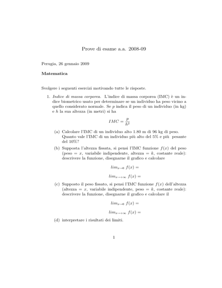 Prove di esame a.a. 2008-09 Perugia, 26 gennaio 2009 Matematica Svolgere i seguenti esercizi motivando tutte le risposte. 1. Indice di massa corporea. L’indice di massa corporea (IMC) è un indice biometrico usato per determinare se un individuo ha peso vicino a quello considerato normale. Se p indica il peso di un individuo (in kg) e h la sua altezza (in metri) si ha IM C = p h2 (a) Calcolare l’IMC di un individuo alto 1.80 m di 96 kg di peso. Quanto vale l’IMC di un individuo più alto del 5% e più pesante del 10%? (b) Supposta l’altezza fissata, si pensi l’IMC funzione f (x) del peso (peso = x, variabile indipendente, altezza = k, costante reale): descrivere la funzione, disegnarne il grafico e calcolare limx→0 f (x) = limx→+∞ f (x) = (c) Supposto il peso fissato, si pensi l’IMC funzione f (x) dell’altezza (altezza = x, variabile indipendente, peso = k, costante reale): descrivere la funzione, disegnarne il grafico e calcolare il limx→0 f (x) = limx→+∞ f (x) = (d) interpretare i risultati dei limiti. 1 2. Neurone artificiale. la funzione f (x) = 1 1 + e−x è nota con il nome di sigmoide e viene utilizzata per simulare ls risposta di un neurone artificiale ad uno stimolo x. (a) Calcolare limx→−∞ f (x) = limx→0 f (x) = limx→+∞ f (x) = (b) Disegnare il grafico di f (x). (c) Determinare per quali valori di x la risposta f (x) è superiore a 1/2. 3. Televisori. Sia C(x) = 3000 + 3x + 0.02x2 la funzione di costo che un’azienda affronta per produrre x unità di televisori. (a) Determinare la variazione media del costo negli intervalli [400, 450], [400, 420] e darne il significato geometrico ed economico. (b) Trovare il costo marginale al livello di produzione di 400 televisori e interpretarne il significato geometrico ed economico. (c) Tracciare il grafico di C(x) e riportare le rette secanti e la retta tangente. 4. Palla di ghiaccio. Una palla di ghiaccio si scioglie cosı̀ che il suo raggio diminuisce da 5 cm a 4,97 cm. Utilizzare il differenziale per approssimare di quanto diminuisce il volume della palla. (a) Studiando la concavità della funzione, stabilire se si tratta di un’approssimazione per difetto o per eccesso. (b) Visualizzare graficamente l’approssimazione lineare disegnando il grafico della funzione e l’opportuna retta tangente. 2 Perugia, 10 febbraio 2009 Matematica Svolgere i seguenti esercizi motivando tutte le risposte. 1. Cavie. Dopo aver somministrato diverse dosi di una sostanza a tre gruppi di cavie affette da una certa malattia, si constatata la seguente correlazione tra le dosi somministrate e le percentuali di mortalità. dose mortalità 2 16% 4 10% 8 22% Supponendo che la percentuale di mortalità dipenda in modo quadratico dalla dose somministrata, (a) determinare la legge e disegnare il grafico, (b) calcolare la dose ottimale, cioè quella che rende minima la percentuale di mortalità delle cavie, (c) interpretare il modello (intersezione con gli assi, andamento della parabola, vertice). 2. Scippi1. Dati statistici hanno evidenziato che il numero di scippi ai danni di persone anziane nelle grandi città tende a raddoppiare ogni 4 mesi. (a) Supponendo che tale andamento si mantenga nel tempo, indicato con N0 il numero attuale di scippi, modellare il processo e individuare la legge (ricorsiva, esplicita e reale) che rappresenta il numero N (t) di scippi fra t mesi. Disegnare il grafico. (b) Seguendo il modello matematico costruito, determinare dopo quanti mesi N (t) dovrebbe triplicare. (c) Calcolare limt→0+ N (t) = 3 limt→+∞ N (t) = (d) In quale intervallo di tempo ritenete che questo modello sia attendibile? 3. Scippi2. Relativamente alla funzione dell’esercizio precedente (a) Determinare il tasso medio di accrescimento negli intervalli [4,8], [12,16], [20,24] e darne il significato geometrico. (b) Trovare il tasso istantaneo di crescita dopo 8, 16 e 24 mesi e interpretarne il significato geometrico. Confrontare e spiegare i tre risultati. (c) Tracciare il grafico della derivata prima N 0 (t). 4. Scatola di vetro. Si vuole costruire una scatola di legno a base quadrata, della capienza di 54cm3 , con uno del lati di vetro per permettere di controllare il contenuto senza aprire la scatola. Determinare le dimensioni che minimizzano il costo di produzione supposto che il rapporto tra i prezzi unitari del legno e del vetro pari a 5/3. Perugia, 23 febbraio 2009 Matematica 1. Medicina. 10 ml di una medicina sono iniettati per endovena ad un paziente in 5 minuti. Durante la somministrazione la quantità di medicina nel sangue cresce linearmente, appena si cessa la somministrazione essa diminuisce con velocità esponenziale. (a) Individuare la legge (lineare in [0, 5], poi esponenziale in [5, +∞[) che meglio rappresenta l’andamento della quantità di medicina nel sangue in funzione del tempo e tracciarne il grafico. 4 (b) Descrivere le proprietà caratterizzanti il grafico individuato ( C.E., codominio, asintoti, continuità, derivabilità, punti di massimo o minimo relativo, concavità). (c) Determinare la legge e/o il grafico della derivata prima. 2. Rimbalzi. Una palla rossa lasciata cadere da un’altezza di 2 metri rimbalza verticalmente raggiungendo ad ogni rimbalzo i 9/10 della quota precedente. Una palla gialla, meno gonfia, lasciata cadere da un’altezza di 3 metri rimbalza verticalmente raggiungendo ad ogni rimbalzo i 7/10 della quota precedente. (a) Modellare il processo e individuare la legge (ricorsiva, esplicita e reale) che rappresenta l’altezza raggiunta dalle due palle all’nesimo rimbalzo. Disegnare il grafico. (b) Determinare dopo quanti rimbalzi la palla rossa rimbalza più in alto della gialla. 3. (a) Calcolare i seguenti limiti: 3−x = x log(1 + x) lim = x→0 x 1+x lim− = x→1 x − 1 sen(x − 1) lim+ = x→1 x−1 √ |x| lim x = x→+∞ x (b) Disegnare il grafico di una funzione che ammetta i limiti sopra calcolati. lim x→−∞ 4. Antica Roma. La percentuale P (t) delle per