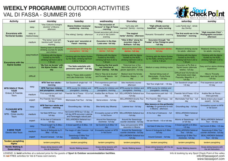 WEEKLY PROGRAMME OUTDOOR ACTIVITIES VAL DI FASSA - SUMMER 2016 Activity Level easy Excursions with Territorial Guides easy or medium/easy medium easy/medium Excursions with the Alpine Guides monday "Viac Cultural e boteghe storiche" of Moena afternoon medium MTB SINGLE TRAIL TOUR Enduro & Freeride Tours PLEASURE MTB TOUR MTB - Cross country Tours E-BIKE TOUR Electric bike Tours Tandem paragliding flights Nordic Walking & Grass skiing Moena Outdoor muscular awakening - morning “The milking" (family) - afternoon wednesday “The excursion of flavours" in Vigo di Fassa - morning thursday friday saturday sunday “Let’s play with marmots” (family) - morning "High altitude sunrise breakfast” - early morning Lusia Family day! - whole day (family) Sunset excursion with dinner “The magical “The first world war in the Romantic “Enrosadira" - evening in a hut in Val Contrin herbs" (family) - afternoon Dolomites" - morning evening “High mountain Click" Photographic excursion afternoon “The fairies’ wood with barefoot path” (family) morning “la gran vera” excursion at Fanch - morning Excursion in the Alpe Lusia area - full day "Hike & Bike" along the mountain ridge of Buffaure - full day Excursion through “Val Fredda” at San Pellegrino pass - full day Starting base or advanced climbing courses for adults and children Introduction to climbing for youngsters - full day Around the mountain dairies - full day Around the mountain dairies - full day Around the mountain dairies full day Weekend climbing course for adults - afternoon Weekend climbing course for adults - morning Climbing with the Alpine Guides by the ADEL climbing hall from 5.30 to 7.30 pm Climbing with the Alpine Guides by the ADEL climbing hall from 5.30 to 7.30 pm Climbing with the Alpine Guides by the ADEL climbing hall from 5.30 to 7.30 pm Climbing with the Alpine Guides by the ADEL climbing hall from 5.30 to 7.30 pm Climbing with the Alpine Guides by the ADEL climbing hall from 5.30 to 7.30 pm Climbing with the Alpine Guides by the ADEL climbing hall from 5.30 to 7.30 pm Climbing with the Alpine Guides by the ADEL climbing hall from 5.30 to 7.30 pm Excursion at Piz Boè or Vajolet towers (alternate weeks) - full day Easy and fun alpine climbing experience! “My first via ferrata" with the Alpine Guides - full day difficult easy tuesday MTB Test tour adults morning MTB Test tour children and youngsters - morning “The Sella waterfalls with panoramic aperitif" - full day “Exploring the first world war trenches at Padon" (family) - full day “Historical tour of the Marmolada glacier" (first glacier approach) - full day Medium or easy climbing routes Hike to “Passo delle scalette” and Lake Antermoia - full day Hike to “Sas da le doudes” and Forcella Valacia - full day Medium level Via ferrata: (Tridentina, Majarè...) - full day Normal hiking route of Marmolada - Punta Penia (3342m) - full day Sot Sasslench single trail - 1/2 day First experience park trail 1/2 day bike mechanics course afternoon Test Tour single trail - 1/2 day Difficult level Via ferrata (es: Hike to “Forcella Marmolada west ridge, Marmolada” and Val Contrin Piazzetta, Magnifici 4…) - full day full day Sot Sasslench single trail 1/2 day First experience park trail 1/2 day MTB course for children and youngsters - morning MTB course for children and MTB course for children and youngsters - morning youngsters - morning MTB course for children and youngsters - morning Arabba Bec de Roces - full SELLARONDA Sellatrail tour day - full day First experience park trail - 1/2 day Freeride Val di Fassa -1/2 or full day Arabba Bec de Roces intera giornata Pro Freeride Val di Fassa - full day Marmolada Trail Tour - full day Serrai enduro plus (super expert) - full day Groundhog day - full day Enrosadira sunset on MTB in Val Duron medium First experience park trail 1/2 day Freeride Val di Fassa - 1/2 or full day expert Pro Freeride Val di Fassa full day Marmolada Trail Tour - full day Serrai enduro - full day SELLARONDA Gravity Tour - full day easy MTB Test tour adults and children - morning Groundhog day - full day Bike family day (Moena) Latemar tour - full day medium Val Salei MTB tour - 1/2 or full day Val Contrin MTB tour 1/2 day - or full day MTB excursion Latemar and Paneveggio natural park expert At the feet of Catinaccio full day SELLARONDA Sellatrail tour full day Around the Sassolungo clockwise - full day easy “Piccoli borghi” by E-Bike 1/2 day A forest aperitif on E-Bike - 1/2 day medium Serrai di Sottoguda by EBike - full day The magic of Lake Carezza - full day expert Around Canazei - full day Sassolungo E-Bike Tour clockwise - full day tandem paragliding tandem paragliding Grass skiing lessons with the ski instructors Nordic Walking lesson Enrosadira sunset on MTB SELLARONDA Sellatrail tour in Val Duron - full day Bike lessons on the go!(family) - full day. Or gymkhana for kids in Moena - afternoon. At the feet of Catinaccio - full day SEALLARONDA Sellatrail Tour Around the Sassolungo counter clockwise - full day Val san Nicolò - 1/2 or full day Attorno al Sassolungo - 1/2 or full day SEALLARONDA Sellatrail Tour - full day Val Contrin by E-Bike 1/2 day Easy and panoramic MTB excursion in Moena Val Salei E-bike tour 1/2 day A forest aperitif on E-Bike 1/2 day Val Contrin E-Bike - 1/2 dau Enrosadira sunset on MTB in Val Duron Around the Sassolungo counter clockwise - full day Serrai di Sottoguda by E-Bike full day SEALLARONDA Sellatrail Tour - full day Sassolungo E-Bike Tour counter clockwise - full day SELLARONDA Sellatrail tour - full day Around Canazei - full day Sassolungo E-Bike Tour clockwise - full day SEALLARONDA Sellatrail Tour - full day tandem paragliding tandem paragliding tandem paragliding tandem paragliding tandem paragliding Grass skiing lessons with the ski instructors Nordic Walking lesson Grass skiing lessons with the ski instructors Nordic Walking lessons Grass skiing lessons with the ski instructors