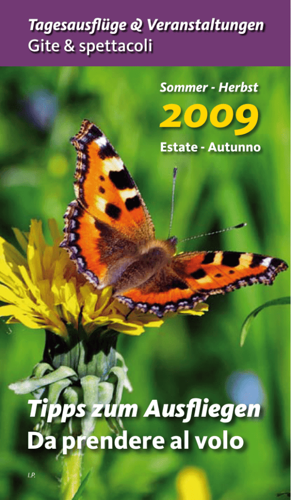 Tagesausflüge & Veranstaltungen Gite & spettacoli Sommer - Herbst 2009 Estate - Autunno Tipps zum Ausfliegen Da prendere al vol0 I.P. Sehenswerte Orte & Städte Luoghi & città d’eccezione in Tirol & Rattenberg (A) > Achensee Lago Achensee nel Tirolo & cittadina di Rattenberg (Aut) ........ 6 > Altötting & Marktl am Inn Südbayern (D)/Bavaria (GER) ............ 7 KZ-Gedenkstätte & München (D) > Dachau Dachau Luogo storico di commemorazione & Monaco di Baviera (GER) 8 > Große Dolomitenfahrt/Dolomiti - grande giro panoramico ....... 9 > Großglockner & Lienz Osttirol (A)/Tirolo dell’Est (AUT) ............. 10 > Königsschloss Herrenchiemsee Castello reale (D/GER) ................ 11 & Swarovski Kristallwelten (A) > Innsbruck Innsbruck & Mondi di Cristallo Swarovski (AUT) .............................. 12 (Nationalpark Berchtesgaden - D) > Königssee Lago Königssee (Parco nazionale Berchtesgaden - GER) ............ 13 & Millstätter See (A) > Maltatal Maltatal - La valle dell’acqua (Carinzia - AUT) ..............................14 > Mayrhofen & Hintertux Zillertal (A)/Valle Zillertal (AUT) .......... 15 & Gärten Schloss Trauttmansdorff > Meran Merano & Giardini Castel Trauttmansdorff ..................................16 Fluss-Schifffahrt & Fischessen > Mincio Crociera panoramica sul Mincio & pranzo con specialità pesce 17 > München (D)/Monaco di Baviera (GER) ......................................... 18 > Königsschloss Neuschwanstein Castello reale (D/GER) ................ 19 > Nonsberg & Die Deutsche Gemeinde Val di Non & l’isola linguistica tedesca ......................................... 20 Neu Nuovo Riva & Limone & Malcesine (Gardasee/Lago di Garda) .............. 21 Neu Nuovo Neu Nuovo Verona & Sirmione .............................................................................. 25 Vinschgau & Meran/Val Venosta & Merano ................................ 26 Weißensee/Lago Weissensee Kärnten (A)/Carinzia (AUT) ........ 27 Berchtesgaden & Kitzbühel (A) > Salzbergwerk Miniera salina di Berchtesgaden & Kitzbühel (AUT) ................. 22 > Salzburg (A)/Salisburgo (AUT) ........................................................ 23 > Venedig/Venezia ................................................................................. 24 > > Wien (A)/Vienna (AUT) ...................................................................... 28 Wien (A) „Haydn Jahr 2009“ ........................................................... 29 > Wörthersee & Minimundus Kärnten (A)/Carinzia (AUT) ............ 30 Neu Nuovo 2 Le destinazioni in un colpo d’occhio Spiel & Spaß Gioco & divertimento 6 - 30 31 - 37 > Alpenzoo Innsbruck mit/con Hungerburg-Bahn (A/AUT) .......... 31 > Bavaria Filmstadt/Cinecittà (München/Monaco di B.) ...............32 > Gardaland .............................................................................................. 33 > Ötzidorf - Ötztal (A)/Paese di Ötzi (AUT) ..................................... 34 Neu Nuovo Neu Nuovo > Salzburger Zoo & Schloss Hellbrunn (A) Zoo di Salisburgo & Castello Hellbrunn (AUT) ............................ 35 Sea Life München (D)/Sea Life Monaco di Baviera (GER) ......... 36 Tierpark Hellabrunn (München - D) Parco zoologico di Hellabrunn (Monaco di Baviera -GER) ........ 37 Wanderausflüge Escursioni guidate 38 - 39 > Ferchensee - Lautersee im Wetterstein (D) ................................... 38 > Monte Castello - Gardasee ................................................................ 39 Events & Veranstaltungen Eventi & spettacoli 40 - 48 > Arena Verona ....................................................................................... 40 > Elisabeth - Das Musical (München - D) ........................................... 41 > Gauder Fest - Zell am Ziller (A/AUT) ................................................ 42 > Grand Prix der Volksmusik Finale (München - D) ........................ 43 > Hänsel & Gretel (München - D) ........................................................ 44 Ritt (Bad Tölz - D) > Leonhardi “Cavalcata di S. Leonardo” (Bad Tölz - GER) ................................ 45 > Meraner Traubenfest/Festa dell’uva a Merano .......................... 46 > Oberkrainerfest (Bled - SLO) ............................................................. 47 > Oktoberfest (München - D/Monaco di Baviera - GER) ................ 48 > Ermäßigungen/Riduzioni .............................................................. 4 - 5 > Vorschau Winter 2009/10 ................................................................. 49 > Vorschau Mehrtagesreisen 2009/10 ............................................... 50 > Wissenswertes/Condizioni generali ............................................... 51 Titelbild: Kurt Lempfrecher Alle Ziele auf einen Blick 3 Riduzioni Ermäßigungen Più divertente, più conveniente! Mehr Freu(n)de, mehr sparen! Per una gita in famiglia oppure con gli amici, approfittate delle nostre riduzioni „Una giornata in compagnia“: Genießen Sie einen Tag mit Familie oder Freunden und nutzen Sie den Vorteil unserer Ermäßigungsstaffel „Ein Tag mit Freunden“: 3 - 5 persone:- 5 % 6 persone:- 6 % 7 persone:- 7 % 8 persone:- 8 % 9 persone:- 9 % 10 - 14persone: - 10 % 15 - 20persone:- 15 % a. p. 21persone: su richiesta 3 - 5 Personen: - 5 % 6 Personen: - 6 % 7 Personen: - 7 % 8 Personen: - 8 % 9 Personen: - 9 % 10 - 14 Personen: - 10 % 15 - 20 Personen: - 15 % ab 21 Personen: auf Anfrage Condizioni generali: >Reservierung und Bezahlung für die gesamte Gruppe muss durch >Il tasso di riduzione applicabile dipende dal numero di persone >Zur Ermittlung des Ermäßigungssatzes gilt die Gesamt-Anzahl >Il pagamento dell’importo totale deve essere effettuato al più >Die Bezahlung des Gesamtbetrages muss spätestens 2 Arbeitstage persona per tutto il gruppo. che partecipano effettivamente alla gita (bambini paganti compresi). Il tasso di riduzione rispettivo viene applicato esclusivamente ai 