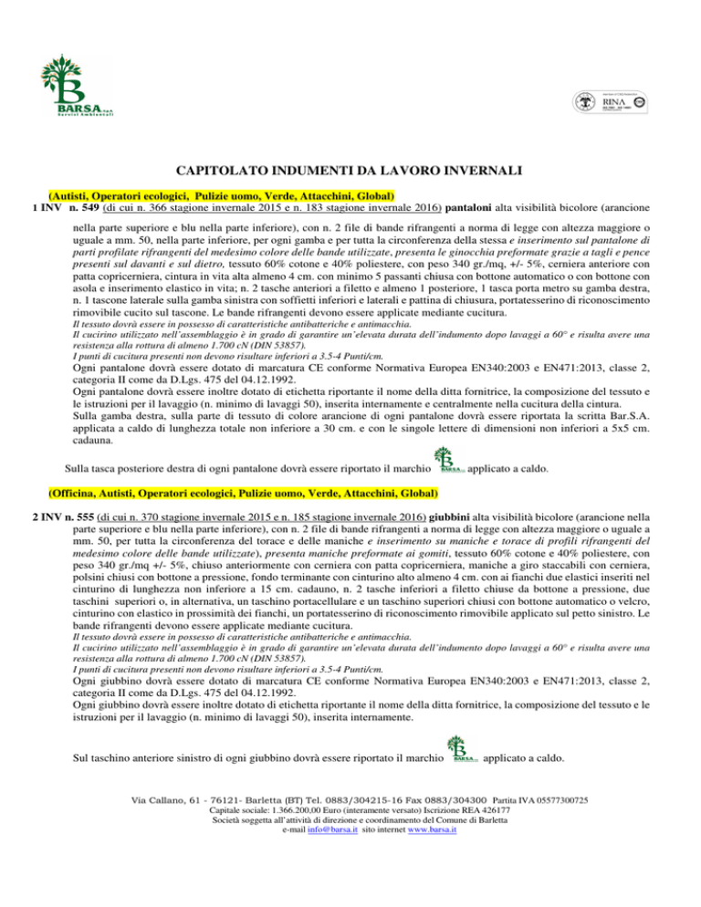 CAPITOLATO INDUMENTI DA LAVORO INVERNALI (Autisti, Operatori ecologici, Pulizie uomo, Verde, Attacchini, Global) 1 INV n. 549 (di cui n. 366 stagione invernale 2015 e n. 183 stagione invernale 2016) pantaloni alta visibilità bicolore (arancione nella parte superiore e blu nella parte inferiore), con n. 2 file di bande rifrangenti a norma di legge con altezza maggiore o uguale a mm. 50, nella parte inferiore, per ogni gamba e per tutta la circonferenza della stessa e inserimento sul pantalone di parti profilate rifrangenti del medesimo colore delle bande utilizzate, presenta le ginocchia preformate grazie a tagli e pence presenti sul davanti e sul dietro, tessuto 60% cotone e 40% poliestere, con peso 340 gr./mq, +/- 5%, cerniera anteriore con patta copricerniera, cintura in vita alta almeno 4 cm. con minimo 5 passanti chiusa con bottone automatico o con bottone con asola e inserimento elastico in vita; n. 2 tasche anteriori a filetto e almeno 1 posteriore, 1 tasca porta metro su gamba destra, n. 1 tascone laterale sulla gamba sinistra con soffietti inferiori e laterali e pattina di chiusura, portatesserino di riconoscimento rimovibile cucito sul tascone. Le bande rifrangenti devono essere applicate mediante cucitura. Il tessuto dovrà essere in possesso di caratteristiche antibatteriche e antimacchia. Il cucirino utilizzato nell’assemblaggio è in grado di garantire un’elevata durata dell’indumento dopo lavaggi a 60° e risulta avere una resistenza alla rottura di almeno 1.700 cN (DIN 53857). I punti di cucitura presenti non devono risultare inferiori a 3.5-4 Punti/cm. Ogni pantalone dovrà essere dotato di marcatura CE conforme Normativa Europea EN340:2003 e EN471:2013, classe 2, categoria II come da D.Lgs. 475 del 04.12.1992. Ogni pantalone dovrà essere inoltre dotato di etichetta riportante il nome della ditta fornitrice, la composizione del tessuto e le istruzioni per il lavaggio (n. minimo di lavaggi 50), inserita internamente e centralmente nella cucitura della cintura. Sulla gamba destra, sulla parte di tessuto di colore arancione di ogni pantalone dovrà essere riportata la scritta Bar.S.A. applicata a caldo di lunghezza totale non inferiore a 30 cm. e con le singole lettere di dimensioni non inferiori a 5x5 cm. cadauna. Sulla tasca posteriore destra di ogni pantalone dovrà essere riportato il marchio applicato a caldo. (Officina, Autisti, Operatori ecologici, Pulizie uomo, Verde, Attacchini, Global) 2 INV n. 555 (di cui n. 370 stagione invernale 2015 e n. 185 stagione invernale 2016) giubbini alta visibilità bicolore (arancione nella parte superiore e blu nella parte inferiore), con n. 2 file di bande rifrangenti a norma di legge con altezza maggiore o uguale a mm. 50, per tutta la circonferenza del torace e delle maniche e inserimento su maniche e torace di profili rifrangenti del medesimo colore delle bande utilizzate), presenta maniche preformate ai gomiti, tessuto 60% cotone e 40% poliestere, con peso 340 gr./mq +/- 5%, chiuso anteriormente con cerniera con patta copricerniera, maniche a giro staccabili con cerniera, polsini chiusi con bottone a pressione, fondo terminante con cinturino alto almeno 4 cm. con ai fianchi due elastici inseriti nel cinturino di lunghezza non inferiore a 15 cm. cadauno, n. 2 tasche inferiori a filetto chiuse da bottone a pressione, due taschini superiori o, in alternativa, un taschino portacellulare e un taschino superiori chiusi con bottone automatico o velcro, cinturino con elastico in prossimità dei fianchi, un portatesserino di riconoscimento rimovibile applicato sul petto sinistro. Le bande rifrangenti devono essere applicate mediante cucitura. Il tessuto dovrà essere in possesso di caratteristiche antibatteriche e antimacchia. Il cucirino utilizzato nell’assemblaggio è in grado di garantire un’elevata durata dell’indumento dopo lavaggi a 60° e risulta avere una resistenza alla rottura di almeno 1.700 cN (DIN 53857). I punti di cucitura presenti non devono risultare inferiori a 3.5-4 Punti/cm. Ogni giubbino dovrà essere dotato di marcatura CE conforme Normativa Europea EN340:2003 e EN471:2013, classe 2, categoria II come da D.Lgs. 475 del 04.12.1992. Ogni giubbino dovrà essere inoltre dotato di etichetta riportante il nome della ditta fornitrice, la composizione del tessuto e le istruzioni per il lavaggio (n. minimo di lavaggi 50), inserita internamente. Sul taschino anteriore sinistro di ogni giubbino dovrà essere riportato il marchio applicato a caldo. Via Callano, 61 - 76121- Barletta (BT) Tel. 0883/304215-16 Fax 0883/304300 Partita IVA 05577300725 Capitale sociale: 1.366.200,00 Euro (interamente versato) Iscrizione REA 426177 Società soggetta all’attività di direzione e coordinamento del Comune di Barletta e-mail [email protected] sito internet www.barsa.it 2 (Officina, Autisti, Operatori ecologici, Pulizie uomo, Verde, Attacchini, Global, Elettricisti/Idraulici) 3 INV n. 585 (di cui n. 390 stagione invernale 2015 e n. 195 stagione invernale 2016) maglioni in pile tipo polo con zip rovesciata di chiusura, di colore blu di peso non inferiore a 280 gr./mq senza elastico al fondo. Cuciture impunturate a due aghi necessari per garantire una maggiore resistenza. Il materiale utilizzato è in possesso di caratteristiche antibatteriche. Ogni maglione dovrà avere l’etichetta riportante il nome della ditta fornitrice, la composizione del tessuto e le istruzioni per il lavaggio inserita internamente e centralmente nella cucitura di assemblaggio del collo. Sul lato sinistro anteriore di ogni maglione dovrà essere riportato il marchio applicato a caldo (Officina, Autisti, Operatori ecologici, Pulizie uomo, Verde, Attacchini, Global, Elettricisti/Idraulici) 4 INV n. 390 (di cui n. 195 stagione invernale 2015 e n. 195 stagione invernale 2016) berretti tipo fantino in lana, di colore blu. Su ogni berretto sarà riportato, frontalmente, il marchio applicato a caldo (officina) 5 INV n.12 (di cui n. 6 stagione invernale 2015 