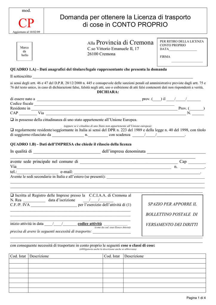 mod. CP Domanda per ottenere la Licenza di trasporto di cose in CONTO PROPRIO Aggiornato al 10/02/09 Marca da bollo Alla Provincia di Cremona C.so Vittorio Emanuele II, 17 26100 Cremona PER RITIRO DELLA LICENZA CONTO PROPRIO DATA_________________ FIRMA ___________________ QUADRO 1.A) - Dati anagrafici del titolare/legale rappresentante che presenta la domanda Il sottoscritto ________________________________________________________________________________ ai sensi degli artt. 46 e 47 del D.P.R. 28/12/2000 n. 445 e consapevole delle sanzioni penali ed amministrative previste dagli artt. 75 e 76 del testo unico, in caso di dichiarazioni false, falsità negli atti, uso o esibizione di atti falsi contenenti dati non rispondenti a verità, DICHIARA: di essere nato a ____________________________________________________ prov. (____) il ____/_____/_______ Codice fiscale ______________________________________________________________________ Residente in _________________________________________________________________________ Prov. (_______) CAP _________ Via ______________________________________________________________________ N. ______ in possesso della cittadinanza di uno stato appartenente all’Unione Europea. (oppure se è cittadino di uno Stato non appartenente all’Unione europea): regolarmente residente/soggiornante in Italia ai sensi del DPR n. 223 del 1989 e della legge n. 40 del 1998, con titolo di soggiorno rilasciato da ________________ n.__________ con scadenza ______/_____/______________. QUADRO 1.B) - Dati dell’IMPRESA che chiede il rilascio della licenza In qualità di _______________________________ dell’impresa denominata ___________________________ _____________________________________________________________________________________ avente sede principale nel comune di _____________________________________________ Cap ________ Via_______________________________________________________________________ n. ___________. tel.:___________________ e-mail: __________________________________________________________. Avente le sedi secondarie in Italia e all’estero (se presenti): _________________________________________________ _________________________________________________________________________________________________ _________________________________________________________________________________________________ ________________________________________________________________________________________________ Iscritta al Registro delle Imprese presso la C.C.I.A.A. di Cremona al N. Rea ___________ data d’iscrizione ___/____/_______ SPAZIO PER APPORRE IL C.F./P. IVA _______________________ per l’esercizio dell’attività di (1) ____________________________________________________________ ____________________________________________________________ BOLLETTINO POSTALE DI ____________________________________________________________ inizio attività in data ____/____/_______ codice attività ________________ VERSAMENTO DEI DIRITTI (come da cod. istat Elenco Attività) precisa di avere le seguenti necessità di trasporto: ___________________ ________________________________________________________________________________________________ ________________________________________________________________________________________________ con conseguente necessità di trasportare in conto proprio le seguenti cose o classi di cose: (obbligatoria anche la descrizione anche se abbreviata) Cod. Istat Descrizione Cod. Istat Descrizione Pagina 1 di 4 QUADRO 1.C) - DICHIARA (2) (barrare l’ipotesi che ricorre) che il trasporto delle merci non costituisce attività prevalente rispetto alle attività economiche dell’impresa; di non essere titolare di licenza per il trasporto in conto proprio; di essere già titolare di licenza per il trasporto in conto proprio N. CR ________________________ del ____/_____/_______, posizione meccanografica ___________ rilasciata ai sensi della Legge n. 298/74; che le merci trasportate non sono classificate rifiuti; che le merci trasportate sono classificate rifiuti e quindi di essere iscritta all’Albo Gestori Ambientali al n. ________________ scad. ___________________; - che il proprio parco veicolare è composto dai seguenti veicoli già muniti di licenza (3): Targa Categoria Fabbrica e tipo, carrozzeria Portata kg 1 2 3 4 5 N.B.: Indicare anche i Rimorchi ed i Semirimorchi. Se i veicoli sono più di 5 fare un elenco a parte completo di tutti i dati richiesti. CHIEDE QUADRO 2.A) ai sensi dell’art. 32 della legge n. 298/74 e successive modificazioni, il rilascio di una licenza per l’autotrasporto di cose in conto proprio per (vedi legenda causali) ______________________________________________________________ _________________________________________________________________________________________________ da utilizzarsi sul seguente autoveicolo di cui si dichiara (2): proprietario usufruttuario locatario con facoltà di acquisto (in tal caso specificare): data di stipulazione del contratto ____/_____/_______ data di scadenza del contratto ____/_____/_______ società di leasing stipulante ________________________________________________________________________ che non è sottoposto a pignoramento o sequestro: che non è sottoposto a pignoramento o sequestro: Marca __________________________________________________________________ Modello _____________________________________Categoria ____________________________________________ N. di targa ________________ N. di TELAIO ___________________________________________________________ Carrozzeria _______________________________________________________________________________________ (Se trattasi di trattore per semirimorchio o motrice per rimorchio indicare il veicolo che traina) avente PORTATA UTILE di kg _____________ non superiore a 3000 kg. superiore a 3000 kg. avente massa complessiva di kg ______________________ massa rimorchiabile di kg _____________________ QUADRO 2.B) DICHIARA (4) inoltre che: •