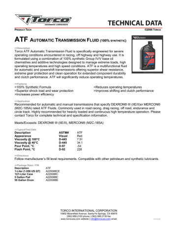 PRODUCT TECH ©2006 TORCO ATF AUTOMATIC TRANSMISSION FLUID (100% SYNTHETIC) >>Description Torco ATF Automatic Transmission Fluid is specifically engineered for severe operating conditions encountered in racing, off highway and highway use. It is formulated using a combination of 100% synthetic Group IV/V base oil chemistries and additive technologies designed to manage extreme loads, high operating temperatures and high speed conditions. ATF is a multifunctional fluid for automatic and powershift transmissions offering superior shear resistance, extreme gear protection and clean operation for extended component durability and clutch performance. ATF will significantly reduce operating temperatures. >>Features >100% Synthetic Formula >Superior shock load and wear protection >Increases power efficiency >Reduces operating temperatures >Improves shifting and clutch performance >>Application Recommended for automatic and manual transmissions that specify DEXRON® III (IIE/II)or MERCON® (M2C-185A) rated ATF Fluids. Commonly used in road racing, drag racing, off road, endurance and circle track. Highly recommended for heavily loaded and continuous high temperature operation. Please contact Torco for complete technical and specification information. Meets/Exceeds: DEXRON® III (IIE/II), MERCON® (M2C-185A) >>Typical/Test Data Description Appearance Viscosity @ 100°C Viscosity @ 40°C Pour Point, °C Flash Point, °C ASTM# Visual D-445 D-445 D-97 D-92 ATF Red 7.51 34.1 -54 228 >>Directions Follow manufacturer’s fill level requirements. Compatible with other petroleum and synthetic lubricants. >>Package Sizes / P/N Description 1-Liter (1.056 US QT) 12/1-Liter Case 5 Gallon Pail 55 Gallon Drum ATF A220088CE A220088C A220088E A220088B TORCO INTERNATIONAL CORPORATION 10652 Bloomfield Avenue, Santa Fe Springs, CA 90670 (562) 906.2120 phone | (562) 906.2130 fax www.torcousa.com website | [email protected] email 2/6/2006