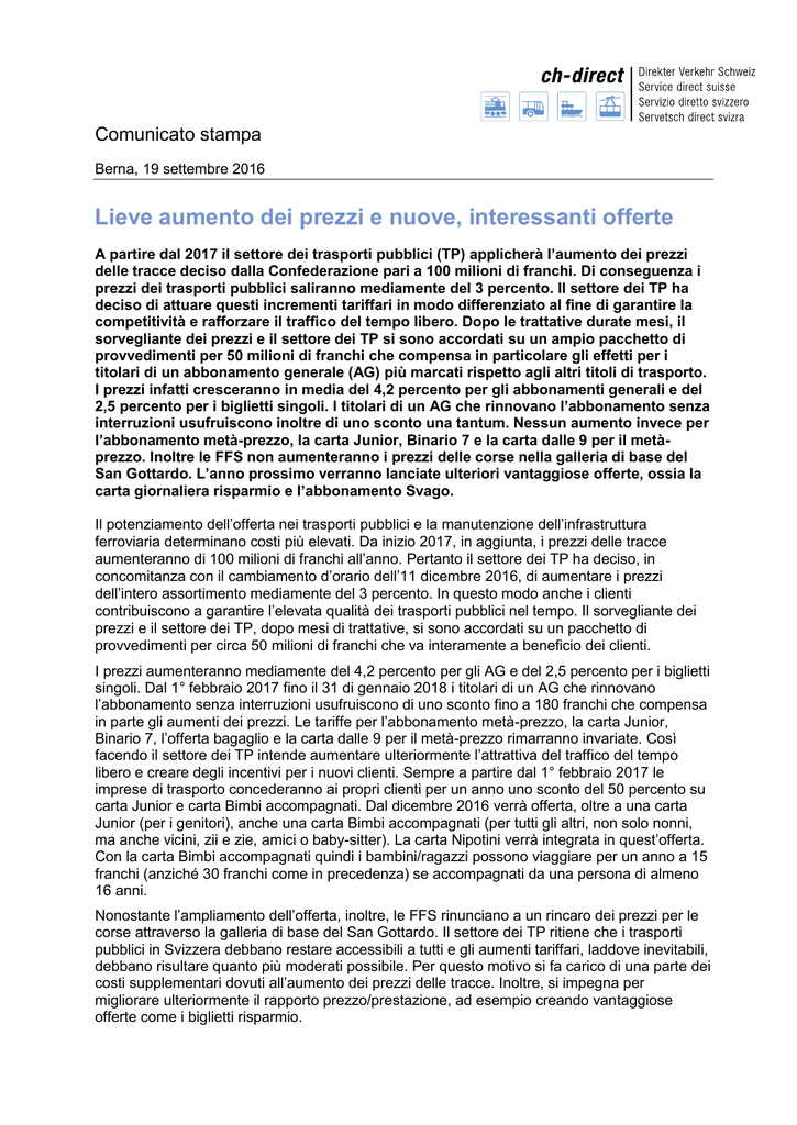 Comunicato stampa Berna, 19 settembre 2016 Lieve aumento dei prezzi e nuove, interessanti offerte A partire dal 2017 il settore dei trasporti pubblici (TP) applicherà l’aumento dei prezzi delle tracce deciso dalla Confederazione pari a 100 milioni di franchi. Di conseguenza i prezzi dei trasporti pubblici saliranno mediamente del 3 percento. Il settore dei TP ha deciso di attuare questi incrementi tariffari in modo differenziato al fine di garantire la competitività e rafforzare il traffico del tempo libero. Dopo le trattative durate mesi, il sorvegliante dei prezzi e il settore dei TP si sono accordati su un ampio pacchetto di provvedimenti per 50 milioni di franchi che compensa in particolare gli effetti per i titolari di un abbonamento generale (AG) più marcati rispetto agli altri titoli di trasporto. I prezzi infatti cresceranno in media del 4,2 percento per gli abbonamenti generali e del 2,5 percento per i biglietti singoli. I titolari di un AG che rinnovano l’abbonamento senza interruzioni usufruiscono inoltre di uno sconto una tantum. Nessun aumento invece per l’abbonamento metà-prezzo, la carta Junior, Binario 7 e la carta dalle 9 per il metàprezzo. Inoltre le FFS non aumenteranno i prezzi delle corse nella galleria di base del San Gottardo. L’anno prossimo verranno lanciate ulteriori vantaggiose offerte, ossia la carta giornaliera risparmio e l’abbonamento Svago. Il potenziamento dell’offerta nei trasporti pubblici e la manutenzione dell’infrastruttura ferroviaria determinano costi più elevati. Da inizio 2017, in aggiunta, i prezzi delle tracce aumenteranno di 100 milioni di franchi all’anno. Pertanto il settore dei TP ha deciso, in concomitanza con il cambiamento d’orario dell’11 dicembre 2016, di aumentare i prezzi dell’intero assortimento mediamente del 3 percento. In questo modo anche i clienti contribuiscono a garantire l’elevata qualità dei trasporti pubblici nel tempo. Il sorvegliante dei prezzi e il settore dei TP, dopo mesi di trattative, si sono accordati su un pacchetto di provvedimenti per circa 50 milioni di franchi che va interamente a beneficio dei clienti. I prezzi aumenteranno mediamente del 4,2 percento per gli AG e del 2,5 percento per i biglietti singoli. Dal 1° febbraio 2017 fino il 31 di gennaio 2018 i titolari di un AG che rinnovano l’abbonamento senza interruzioni usufruiscono di uno sconto fino a 180 franchi che compensa in parte gli aumenti dei prezzi. Le tariffe per l’abbonamento metà-prezzo, la carta Junior, Binario 7, l’offerta bagaglio e la carta dalle 9 per il metà-prezzo rimarranno invariate. Così facendo il settore dei TP intende aumentare ulteriormente l’attrattiva del traffico del tempo libero e creare degli incentivi per i nuovi clienti. Sempre a partire dal 1° febbraio 2017 le imprese di trasporto concederanno ai propri clienti per un anno uno sconto del 50 percento su carta Junior e carta Bimbi accompagnati. Dal dicembre 2016 verrà offerta, oltre a una carta Junior (per i genitori), anche una carta Bimbi accompagnati (per tutti gli altri, non solo nonni, ma anche vicini, zii e zie, amici o baby-sitter). La carta Nipotini verrà integrata in quest’offerta. Con la carta Bimbi accompagnati quindi i bambini/ragazzi possono viaggiare per un anno a 15 franchi (anziché 30 franchi come in precedenza) se accompagnati da una persona di almeno 16 anni. Nonostante l’ampliamento dell’offerta, inoltre, le FFS rinunciano a un rincaro dei prezzi per le corse attraverso la galleria di base del San Gottardo. Il settore dei TP ritiene che i trasporti pubblici in Svizzera debbano restare accessibili a tutti e gli aumenti tariffari, laddove inevitabili, debbano risultare quanto più moderati possibile. Per questo motivo si fa carico di una parte dei costi supplementari dovuti all’aumento dei prezzi delle tracce. Inoltre, si impegna per migliorare ulteriormente il rapporto prezzo/prestazione, ad esempio creando vantaggiose offerte come i biglietti risparmio. Abbonamenti modulari: nuove allettanti offerte per i pendolari Presumibilmente a partire dal cambiamento d’orario 2016 saranno disponibili nuove offerte. Ad esempio l’abbonamento modulare, che sarà offerto in tutta la Svizzera e consentirà di combinare tratte e zone in modo flessibile. Si tratta della soluzione ideale per i pendolari che si spostano tra più comunità o nelle regioni non coperte dalle comunità e che desiderano utilizzare anche i trasporti urbani. L’abbonamento modulare sarà disponibile come abbonamento mensile e annuale per giovani e adulti. Il prezzo dipenderà dalla tratta e dal numero di zone. L’abbonamento modulare sostituirà l’attuale abbonamento interregionale. L’anno prossimo il settore lancerà anche la carta giornaliera risparmio, un conveniente prodotto che potrà essere impiegato su tutta la rete ferroviaria analogamente all’AG. Sempre nel corso del 2017 verrà introdotta un’altra vantaggiosa offerta: l’abbonamento Svago, che includerà un set di 20 o 30 AG giornalieri da utilizzare con un metà-prezzo. In una prima fase questi due nuovi prodotti verranno testati nel quadro di progetti pilota. Il rispetto dell’accordo amichevole raggiunto con il sorvegliante dei prezzi nel 2014 è garantito Da dicembre 2016 il settore dei TP attuerà le misure tariffarie decise nel quadro dell’accordo amichevole raggiunto con il sorvegliante dei prezzi. Che cos’è il prezzo della traccia? Ogni corsa treno genera dei costi per i gestori dell’infrastruttura. Le rotaie si usurano, gli scambi e i segnali necessitano di assistenza e manutenzione. Le imprese di trasporto ferroviario pagano ai gestori dell’infrastruttura una controprestazione per l’utilizzo delle rete ferroviaria: il prezzo della traccia, che viene fissato dal Consiglio federale. Dal 1° gennaio 2017 i prezzi delle tracce aumenteranno di 100 milioni di franchi. Per ulteriori informazioni Roger Baumann, Comunicazione ch-direct | 031 359 23 15 | 079 270