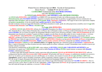 1 P.A.S. Percorsi Abilitanti Speciali 2014 – Facoltà di Giurisprudenza Ettore Peyron - Lezione N°1 C del 24-4-2014 CATEGORIE fondamentali della MACROECONOMIA tratte dalla MICROECONOMIA Le LEGGI della DOMANDA e dell’OFFERTA nella MICROECONOMIA Le LEGGI della DOMANDA e dell’OFFERTA nel MERCATO sono parametri di fondo, che la Microeconomia offre anche alla Sistematizzazione della MACROECONOMIA. Il pensiero economico nel suo fluire le specifica e le approfondisce ed esse costituiscono sue importanti chiavi di lettura, nelle tre dimensioni.dell’Economia: Reale, Monetaria e Finanziaria. Tali Leggi trovano la loro espressione compiuta nel pensiero marginalista, rivisto dai modelli degli equilibri parziali di Alfred Marshall. Secondo la dizione corrente per leggi della Domanda e dell’Offerta intendonsi in realtà quelle che nella proposizione scientifica sono le Leggi delle Variazioni della Domanda e dell’Offerta o Seconde Leggi. La Legge della DOMANDA La PRIMA LEGGE della DOMANDA afferma che la Quantità Domandata di un Bene è inversamente proporzionale al suo Prezzo. A Prezzo Alto, Domanda Bassa; a Prezzo Basso Domanda Alta; se il Prezzo sale, la Domanda scende; se il Prezzo scende la Domanda sale. Ciò è dovuto alla causa di Reddito, per cui il potere di acquisto dei domandanti dipende in modo inverso dal prezzo del Bene, e dalla causa di Sostituzione per cui i domandanti sono incentivati a sostituire l’acquisto del Bene in oggetto con altro Bene che non abbia subito la stessa vicenda di rialzo; e viceversa. L’ELASTICITA’ della DOMANDA è la reattività della QUANTITA’ Domandata di un BENE all’incremento, o decremento, del suo PREZZO sul Mercato di Libera Concorrenza. Essa è il Rapporto puntuale tra la Variazione relativa della QUANTITA’ e la Variazione relativa del PREZZO (per il detto di segno inverso)( -∆Q/Q / ∆P/P ). La DOMANDA è Elastica se ad una piccola variazione del Prezzo corrisponde una grande variazione della Quantità Domandata, Rigida se ad una grande variazione del Prezzo corrisponde una minima variazione della Quantità Domandata; Unitaria se le due variazioni relative sono uguali. Importante per l’elasticità il grado di necessarietà o voluttuarietà del Bene; è rigida la Domanda di un Bene di prima necessità, elastica quella di un Bene voluttuario, essendo il domandante meno sensibile al prezzo per il primo e più per il secondo Tale Elasticità è fondamentale nel QUALIFICARE, come vedremo, la SECONDA LEGGE della VARIAZIONE dell’OFFERTA; per determinare cioè quanto una VARIAZIONE (ad es. positiva) della Funzione di Offerta INCIDA rispettivamente su aumento della Quantità prodotta e diminuizione del Prezzo. La Prima Legge della Domanda enunciata è inoltre espressione della più generale LEGGE dei RENDIMENTI DECRESCENTI, nella sua configurazione specifica della Decrescenza delle Utilità marginali. Nel procedere dell’Atto di Consumo, le soddisfazioni ottenibili con successive dosi è via via minore, per la estinzione successiva del Bisogno, via via minore, sino al punto di sazietà. Per la Logica del Dare e dell’Avere (uguaglianza), propria a tutte le discipline economiche, quindi l’acquirente è disposto a pagare via via Prezzi minori per dosi successive del Bene. Ciò vale sia per il singolo (Domanda individuale) che per la collettività dei Domandanti (Domanda collettiva). Con una ulteriore generalizzazione possiamo notare come la Prima Legge della Domanda è espressione del VALORE SCARSITA'. Alto è il valore di ciò che è scarso, Basso il valore di ciò che è abbondante. Valore rappresentato dal Prezzo che gli acquirenti sono disposti a sborsare, sulla base dell’entità del bisogno da soddisfare, ovverossia l’Utilità del Bene. 2 La Funzione di DOMANDA nella MICROECONOMIA Legge dei Rendimenti Decrescenti Valore Scarsità Utilità Marginale Funzione di Domanda Prezzo Bene Bene Domanda Rigida Prezzo Domanda Elastica Prezzo Bene Bene 3 La Legge dell’OFFERTA La PRIMA LEGGE dell’OFFERTA afferma che la Quantità Offerta di un Bene è direttamente proporzionale al suo Prezzo. A Prezzo Alto, Offerta Alta; a Prezzo Basso offerta Bassa; se il Prezzo sale, l’Offerta sale; se il Prezzo scende l’Offerta scende. Ciò è dovuto al fatto che la funzione di Offerta e quindi la relativa curva riproducono l’andamento dei Costi marginali, o unitari medi, configurando l’andamento dei Prezzi (o Ricavi unitari medi) che il produttore è disposto a subire dal mercato per coprire i propri costi. L’andamento dei Costi marginali ed unitari medi sono espressione della LEGGE dei RENDIMENTI DECRESCENTI, riproducendo nel BREVE PERIODO la necessità del produttore di scostarsi dalla composizione ottimale dei fattori di produzione, per lo più incrementando il lavoro diretto, per aumentare la produzione. Ciò vale sia per l’Offerta individuale, che pareggia il bilancio a Costo marginale maggiore (Ricavo marginale uguale a Costo marginale), che per l’Offerta collettiva di settore, somma delle Offerte individuali nel breve periodo. Inoltre nel MEDIO PERIODO, vengono interessate alla produzione e vendita a prezzi maggiori anche imprese meno efficienti con maggiori costi: la Curva di inviluppo delle configurazioni di equilibrio delle imprese del settore, è la curva d’Offerta crescente delle stesse. I RENDIMENTI DECRESCENTI espressi dall’andamento crescente dei Costi, riproducono la Produttività marginale decrescente dei singoli fattori della produzione. Matematico è il rapporto tra la Produttività marginale del Fattore incrementato con il relativo Costo marginale delle unità aggiuntive del prodotto ottenuto. Nel LUNGO PERIODO l’Offerta può avere un andamento costante se tutte le imprese entranti nel settore riescono ad adeguarsi all’equilibrio del Costo minimo dell’impresa più efficiente, crescente se l’aumento della produzione induce scarsità dei fattori e, quindi incremento dei relativi Costi. Altre variabili poi
