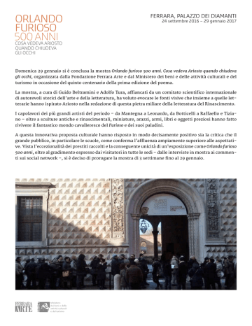 ORLANDO FURIOSO 500 ANNI COSA VEDEVA ARIOSTO FERRARA, PALAZZO DEI DIAMANTI 24 settembre 2016 – 29 gennaio 2017 QUANDO CHIUDEVA GLI OCCHI Domenica 29 gennaio si è conclusa la mostra Orlando furioso 500 anni. Cosa vedeva Ariosto quando chiudeva gli occhi, organizzata dalla Fondazione Ferrara Arte e dal Ministero dei beni e delle attività culturali e del turismo in occasione del quinto centenario della prima edizione del poema. La mostra, a cura di Guido Beltramini e Adolfo Tura, affiancati da un comitato scientifico internazionale di autorevoli storici dell’arte e della letteratura, ha voluto evocare le fonti visive che insieme a quelle letterarie hanno ispirato Ariosto nella redazione di questa pietra miliare della letteratura del Rinascimento. I capolavori dei più grandi artisti del periodo – da Mantegna a Leonardo, da Botticelli a Raffaello e Tiziano – oltre a sculture antiche e rinascimentali, miniature, arazzi, armi, libri e oggetti preziosi hanno fatto rivivere il fantastico mondo cavalleresco del Furioso e dei suoi paladini. A questa innovativa proposta culturale hanno risposto in modo decisamente positivo sia la critica che il grande pubblico, in particolare le scuole, come conferma l’affluenza ampiamente superiore alle aspettative. Vista l’eccezionalità dei prestiti raccolti e la conseguente unicità di un’esposizione come Orlando furioso 500 anni, oltre al gradimento espresso dai visitatori in tutte le sedi – dalle interviste in mostra ai commenti sui social network –, si è deciso di prorogare la mostra di 3 settimane fino al 29 gennaio. Come di consueto, un programma di iniziative didattiche e culturali ha accompagnato l’esposizione, a partire dalla presentazione della mostra a cura di Guido Beltramini e Adolfo Tura presso il Ridotto del Teatro (134 presenze). Ricca anche l’agenda di conferenze tenute dai curatori e dallo staff delle Gallerie d’Arte Moderna e Contemporanea presso le sedi di varie istituzioni culturali e di formazione (1.310 presenze) sia a Ferrara che in altre città, come, tra le altre, Bologna, Milano, Venezia e Bergamo. Ulteriori suggestioni sono state offerte dalla collaborazione con il Conservatorio “G. Frescobaldi” e la Pinacoteca Nazionale di Ferrara in occasione dello spettacolo La furia di Orlando. Amore, gesta cavalleresche, poesia e musica a casa d’Este nel 1516 (230 presenze in occasione delle 2 repliche), e dalla proiezione dello sceneggiato televisivo del 1974 Orlando furioso di Luca Ronconi, in collaborazione con Arci Ferrara (80 presenze). Culmine delle attività organizzate in occasione della mostra è stata la Maratona Orlando, 38 ore di lettura integrale e continuativa del poema, ideata dalla Fondazione Ferrara Arte e organizzata insieme all’Associazione Ferrara Off e alla Pinacoteca Nazionale. L’evento, svoltosi tra il 2 e il 3 dicembre 2016, ha visto la partecipazione di un pubblico nutrito, di ferraresi e non: quasi 1.000 lettori – classi di studenti, associazioni, cittadini che hanno letto da soli e in gruppo – e circa 1.400 spettatori che l’hanno seguita dal vivo, a cui si aggiungono oltre 70.000 persone raggiunte dai canali social di Palazzo dei Diamanti o che hanno seguito la Maratona Orlando in streaming. Anche se la rassegna stampa finale non è ancora disponibile, si può comunque dire che la mostra ha ottenuto ampio consenso da parte della stampa, nazionale e internazionale. Tra le testate nazionali figurano quotidiani e riviste come, tra gli altri, Il Corriere della Sera, La Stampa, Il Sole 24 Ore, Il Fatto Quotidiano, Il Messaggero, L’Unità, Il Venerdì di Repubblica, Panorama, Il Giornale dell’Arte, Art e Dossier. L’esposizione ha riscosso inoltre l’interesse anche di alcune prestigiose testate internazionali come The Burlington Magazine, l’International New York Times, Weltkunst e la Süddeutsche Zeitung. Anche radio e televisioni hanno dedicando a Orlando furioso 500 anni numerosi servizi nei telegiornali (Tg5, Tg3R) o spazi all’interno di rubriche di arte e di cultura (Bell’Italia su Rai3, Sereno Variabile su Rai2, Quante Storie di Corrado Augias su Rai3, Provincia Capitale su Rai 3, TG2 Storie, Save the date su Rai5, Rai International). Per aver dato particolare risalto all’iniziativa desideriamo ringraziare i media locali: Il Resto del Carlino –Redazione di Ferrara, La Nuova Ferrara, Estense.com, Listone Mag, Ferrara Italia e Telestense Cultura. Com’è andata Risultato: 146.567 visitatori in 128 giorni di apertura con una media giornaliera di 1.145 biglietti staccati. L’andamento economico della mostra è stato il seguente: Bilancio provvisorio preconsuntivo 1. Costo della mostra: € 1.819.147,02 2. Entrate nette di mostra: € 1.827.681,72 3. Sponsorizzazioni: € 200.000,00 4. Contributi regionali: € 70.000,00 Attività editoriale Molto rilevanti da un punto di vista culturale e al contempo di grandissimo successo sono le pubblicazioni realizzate da Ferrara Arte, una delle poche istituzioni che non affida a editori esterni questo aspetto essenziale nell’organizzazione di un’esposizione e della diffusione dei suoi contenuti. La mostra è stata accompagnata da un importante catalogo, che ha riscosso un così ampio successo da rendere necessaria la ristampa per ben tre volte; nonostante questo tutte le copie sono state esaurite pochi giorni prima della fine della mostra. La media di acquisto è stata pari a 1 copia ogni 23 visitatori per un totale di 6.731 copie vendute, che lo rendono uno dei best seller di Palazzo dei Diamanti. È stato molto alto anche il gradimento degli altri materiali direttamente prodotti da Ferrara Arte in occasione della mostra: in particolare quello di Orlando Pazzo nel Magico Palazzo, il libro per bambini di Luigi Dal Cin e Pia Valentinis, che ha ottenuto un risultato senza precedenti (oltre 2.000 copie vendute) e dell’album di mostra, che ha un’ottima media di vendita di 1 copia ogni 15 visitatori per un totale di quasi