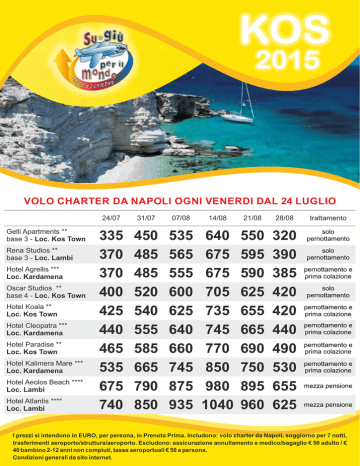 KOS 2015 VOLO CHARTER DA NAPOLI OGNI VENERDI DAL 24 LUGLIO Gelli Apartments ** base 3 - Loc. Kos Town Rena Studios ** base 3 - Loc. Lambi Hotel Agrellis *** Loc. Kardamena Oscar Studios ** base 4 - Loc. Kos Town Hotel Koala ** Loc. Kos Town Hotel Cleopatra *** Loc. Kardamena Hotel Paradise ** Loc. Kos Town Hotel Kalimera Mare *** Loc. Kardamena Hotel Aeolos Beach **** Loc. Lambi Hotel Atlantis **** Loc. Lambi 24/07 31/07 07/08 14/08 21/08 28/08 trattamento 335 370 370 400 425 440 465 535 675 740 450 485 485 520 540 555 585 665 790 850 535 565 555 600 625 640 660 745 875 935 640 675 675 705 735 745 770 850 980 1040 550 595 590 625 655 665 690 750 895 960 320 390 385 420 420 440 490 530 655 625 solo pernottamento solo pernottamento pernottamento e prima colazione solo pernottamento pernottamento e prima colazione pernottamento e prima colazione pernottamento e prima colazione pernottamento e prima colazione mezza pensione mezza pensione I prezzi si intendono in EURO, per persona, in Prenota Prima. Includono: volo charter da Napoli, soggiorno per 7 notti, trasferimenti aeroporto/struttura/aeroporto. Escludono: assicurazione annullamento e medico/bagaglio € 50 adulto / € 40 bambino 2-12 anni non compiuti, tasse aeroportuali € 50 a persona. Condizioni generali da sito internet.