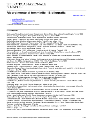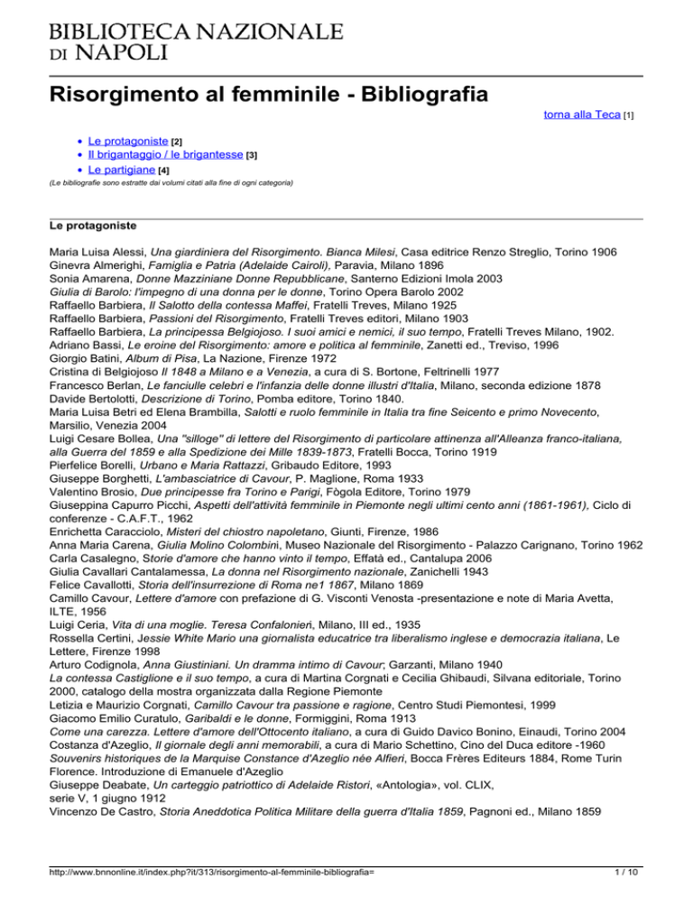 Risorgimento al femminile - Bibliografia torna alla Teca [1] Le protagoniste [2] Il brigantaggio / le brigantesse [3] Le partigiane [4] (Le bibliografie sono estratte dai volumi citati alla fine di ogni categoria) Le protagoniste Maria Luisa Alessi, Una giardiniera del Risorgimento. Bianca Milesi, Casa editrice Renzo Streglio, Torino 1906 Ginevra Almerighi, Famiglia e Patria (Adelaide Cairoli), Paravia, Milano 1896 Sonia Amarena, Donne Mazziniane Donne Repubblicane, Santerno Edizioni Imola 2003 Giulia di Barolo: l'impegno di una donna per le donne, Torino Opera Barolo 2002 Raffaello Barbiera, Il Salotto della contessa Maffei, Fratelli Treves, Milano 1925 Raffaello Barbiera, Passioni del Risorgimento, Fratelli Treves editori, Milano 1903 Raffaello Barbiera, La principessa Belgiojoso. I suoi amici e nemici, il suo tempo, Fratelli Treves Milano, 1902. Adriano Bassi, Le eroine del Risorgimento: amore e politica al femminile, Zanetti ed., Treviso, 1996 Giorgio Batini, Album di Pisa, La Nazione, Firenze 1972 Cristina di Belgiojoso Il 1848 a Milano e a Venezia, a cura di S. Bortone, Feltrinelli 1977 Francesco Berlan, Le fanciulle celebri e l'infanzia delle donne illustri d'Italia, Milano, seconda edizione 1878 Davide Bertolotti, Descrizione di Torino, Pomba editore, Torino 1840. Maria Luisa Betri ed Elena Brambilla, Salotti e ruolo femminile in Italia tra fine Seicento e primo Novecento, Marsilio, Venezia 2004 Luigi Cesare Bollea, Una "silloge" di lettere del Risorgimento di particolare attinenza all'Alleanza franco-italiana, alla Guerra del 1859 e alla Spedizione dei Mille 1839-1873, Fratelli Bocca, Torino 1919 Pierfelice Borelli, Urbano e Maria Rattazzi, Gribaudo Editore, 1993 Giuseppe Borghetti, L'ambasciatrice di Cavour, P. Maglione, Roma 1933 Valentino Brosio, Due principesse fra Torino e Parigi, Fògola Editore, Torino 1979 Giuseppina Capurro Picchi, Aspetti dell'attività femminile in Piemonte negli ultimi cento anni (1861-1961), Ciclo di conferenze - C.A.F.T., 1962 Enrichetta Caracciolo, Misteri del chiostro napoletano, Giunti, Firenze, 1986 Anna Maria Carena, Giulia Molino Colombini, Museo Nazionale del Risorgimento - Palazzo Carignano, Torino 1962 Carla Casalegno, Storie d'amore che hanno vinto il tempo, Effatà ed., Cantalupa 2006 Giulia Cavallari Cantalamessa, La donna nel Risorgimento nazionale, Zanichelli 1943 Felice Cavallotti, Storia dell'insurrezione di Roma ne1 1867, Milano 1869 Camillo Cavour, Lettere d'amore con prefazione di G. Visconti Venosta -presentazione e note di Maria Avetta, ILTE, 1956 Luigi Ceria, Vita di una moglie. Teresa Confalonieri, Milano, III ed., 1935 Rossella Certini, Jessie White Mario una giornalista educatrice tra liberalismo inglese e democrazia italiana, Le Lettere, Firenze 1998 Arturo Codignola, Anna Giustiniani. Un dramma intimo di Cavour; Garzanti, Milano 1940 La contessa Castiglione e il suo tempo, a cura di Martina Corgnati e Cecilia Ghibaudi, Silvana editoriale, Torino 2000, catalogo della mostra organizzata dalla Regione Piemonte Letizia e Maurizio Corgnati, Camillo Cavour tra passione e ragione, Centro Studi Piemontesi, 1999 Giacomo Emilio Curatulo, Garibaldi e le donne, Formiggini, Roma 1913 Come una carezza. Lettere d'amore dell'Ottocento italiano, a cura di Guido Davico Bonino, Einaudi, Torino 2004 Costanza d'Azeglio, Il giornale degli anni memorabili, a cura di Mario Schettino, Cino del Duca editore -1960 Souvenirs historiques de la Marquise Constance d'Azeglio née Alfieri, Bocca Frères Editeurs 1884, Rome Turin Florence. Introduzione di Emanuele d'Azeglio Giuseppe Deabate, Un carteggio patriottico di Adelaide Ristori, «Antologia», vol. CLIX, serie V, 1 giugno 1912 Vincenzo De Castro, Storia Aneddotica Politica Militare della guerra d'Italia 1859, Pagnoni ed., Milano 1859 http://www.bnnonline.it/index.php?it/313/risorgimento-al-femminile-bibliografia= 1 / 10 Emilio Del Cerco, Giuseppe Mazzini e Giuditta Sidoli, S. T.E.N., Torino 1909 Emma Detti, M. Fuller e i suoi corrispondenti, Le Monnier, Firenze 1942 Henry d'Ideville, Il Re, il Conte, la Rosina, Milano 1959. Antonietta Drago, Donne e amori del Risorgimento, Palazzi ed., Milano 1960 Ludovico Fanfani, La principessa Clotilde di Savoia, Marietti, III ed., To-Roma 1930 Claudio Fracassi, La Ribelle e il Papa Re. Roma 1867: una storia vera, Mursia, Milano 2009 Margaret Fuller, Un'americana a Roma 1847-1849, Ed. Studio Tesi, Pordenone 1986 Rosetta Gaggero, Un'amica di Mazzini a Torino, Casale Monferrato 1931 Giuseppe Garibaldi, Memorie, Einaudi, Torino 1975 Niente zucchero nel calamaio. Lettere di Giuseppe Verdi a Clara Maffei, a cura di Cristina Gastel Chiarelli, Archinto, Milano 2005 Guido Gerosa, "Introduzione" all'opera di Jessie White, Vita di Garibaldi, Edizioni Studio Tesi, Pordenone 1986 Vittorio Giglio, Donne celebri - Prima raccolta di brevi monografie, coordinate da Vittorio Giglio, Mi - Sei 1950 Vincenzo Gioberti, Del primato morale e civile degli Italiani, IV, Dei doveri civili, Utet, Torino 1920, II vol. Luca Goldoni, Maria Luigia donna in carriera, Rizzoli, Milano 1991 Terenzio Grandi, Incontro con Giuditta Sidoli a cura de «II pensiero mazziniano», Torino 1942 Elena Herisch - Costantino Nigro, Virginia di Castiglione. La contessa della leggenda, Marzocco, Firenze 1939 Ludovico Incisa - Alberica Trivulzio, Cristina di Belgioioso, Rusconi, Milano 1984 Giovanni Lanza, La marchesa Giulia Falletti di Barolo nata Colbert, Torino 1892 Frederic Loliée, Le roman d'une favorite. La comtesse de Castiglione, Paris, 1925 Giacomo Maria Lombardo, Bianca Milesi, Firenze 1904 Eteocle Lorini, La baronessa Olimpia Savio, Torino 1890. Alessandro Luzio, Profili biografici e bozzetti storici, Milano 1906 Maria Magni, Adelaide Cairoli, Soc. Subalpina ed., Torino 1943. Gemma Giovannini Magonio, Italiane benemerite del Risorgimento Nazionale -Tipog. Ed. Cogliati, Milano 1907 Aldobrandino Malvezzi, Cristina di Belgiojoso. Le prime armi (1808-1832) 1. vol.; La seduttrice (1833- 1842) 2. vol.; Pen