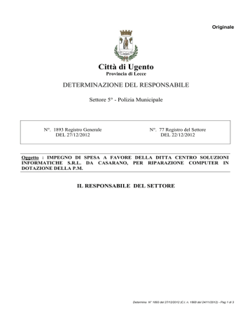Originale Città di Ugento Provincia di Lecce DETERMINAZIONE DEL RESPONSABILE Settore 5° - Polizia Municipale N°. 1893 Registro Generale DEL 27/12/2012 N°. 77 Registro del Settore DEL 22/12/2012 Oggetto : IMPEGNO DI SPESA A FAVORE DELLA DITTA CENTRO SOLUZIONI INFORMATICHE S.R.L. DA CASARANO, PER RIPARAZIONE COMPUTER IN DOTAZIONE DELLA P.M. IL RESPONSABILE DEL SETTORE Determina N° 1893 del 27/12/2012 (C.l. n. 1668 del 24/11/2012) - Pag 1 di 3 PREMESSO che l’ufficio di Polizia Municipale ha urgente necessità di riparare tre alimentatori atx, una batteria 12V e uno switch 8 porte 10/100 di tre personal computer in dotazione al Comando di Polizia Municipale; VISTA l’urgenza si è provveduto ad interpellare telefonicamente la ditta CENTRO SOLUZIONI INFORMATICHE SRL da Casarano, la quale, tempestivamente è intervenuta ed ha preventivato che per riparare i computer bisogna sostituire gli alimentatori, la batteria e lo switch, quantificando la spesa pari ad € 158,90 IVA compresa, così come risulta dal preventivo di spesa avente prot. n. 26516 del 27.11.2012, necessaria per il ripristino delle postazioni informatiche; RITENUTO pertanto di dover assumere impegno di spesa per l’importo di € 158,90 IVA compresa, sull’intervento 1030102 cap. 470 art. 1 “Acquisto beni di consumo e/o materie prime – Spese generali di funzionamento” del bilancio 2012, al fine di soddisfare, successivamente la regolare chiusura economica, a presentazione di fattura; VISTO il D. Lgs n. 267/2000 DETERMINA - DI ASSUMERE impegno di spesa di € 158,90 IVA compresa per la fornitura degli alimentatori e dello switch necessario per la riparazione dei Personal computer, in dotazione all’Ufficio di Polizia Municipale, a favore della ditta CENTRO SOLUZIONI INFORMATICHE SRL da Casarano partita iva 03470860754; - DI IMPUTARE la somma sull’intervento 1030102 cap. 470 art. 1 “Acquisto beni di consumo e/o materie prime – Spese generali di funzionamento” del bilancio 2012; - DI PROVVEDERE alla liquidazione su presentazione di fattura, con successivo e separato atto, previo accertamento della regolarità della prestazione di che trattasi. Riferimenti contabili e attestazioni di cui alla Delibera G.M. n. 229 del 23/12/2009 Importo impegnato: euro 158,90 (centocinquantottovirgolanovanta); Soggetto Beneficiario: ditta CENTRO SOLUZIONI INFORMATICHE SRL - Codice Fiscale/P.IVA ( 03470860754 ); Causale: impegno di spesa per sostituzione alimentatore necessario al ripristino del Personal Computer. Imputazione contabile: intervento 1030102, capitolo 470 art. 1, “Acquisto beni di consumo e/o materie prime – Spese generali di funzionamento” – Bilancio esercizio 2012, impegno di spesa assunto con la seguente Determina Dirigenziale. Il Responsabile del Servizio attesta che: 1) esiste disponibilità sul capitolo di spesa innanzi indicato; 2) la spesa impegnata con il presente atto è disponibile, in conformità all’art. 183 del D.Lgs. n. 267 del 2000, ed è certa, ; 3) la spesa impegnata con la presente determinazione risulta compatibile con ogni vincolo vigente in materia di finanza pubblica, ivi compresi quelli in materia di Patto di Stabilità; 4) il presente provvedimento rispetta gli adempimenti previsti dalla legge n. 136/2010 e ss.mm.ii. in materia di tracciabilità dei flussi finanziari (n. CIG Z76075E72E). Determina N° 1893 del 27/12/2012 (C.l. n. 1668 del 24/11/2012) - Pag 2 di 3 N°. 1893 Registro Generale DEL 27/12/2012 N° 77 Registro del Servizio DEL 22/12/2012 Oggetto : IMPEGNO DI SPESA A FAVORE DELLA DITTA CENTRO SOLUZIONI INFORMATICHE S.R.L. DA CASARANO, PER RIPARAZIONE COMPUTER IN DOTAZIONE DELLA P.M. Il Responsabile del Settore Musio Cosimo VISTO DI REGOLARITA' CONTABILE ATTESTANTE LA COPERTURA FINANZIARIA. La presente determinazione diviene esecutiva in data odierna. Art.151, c.4 - D.Lgs. 18/08/2000, N° 267. Riferimenti Contabili Cap. Art. 470 1 Anno Descrizione 2012 SPESE GENERALI DI FUNZIONAMENTO Impegno Subimp. Importo 2061 158,90 Ugento, lì 27/12/2012 Il Responsabile del Settore Finanziario Dott. Giovanni BOCCO ( FIRMA DIGITALE ) CERTIFICATO DI PUBBLICAZIONE Copia della presente determinazione viene pubblicata mediante affissione all 'Albo Pretorio del Comune in data odierna per rimanervi quindici giorni consecutivi. Ugento, lì 27/12/2012 Il Messo Comunale ____________________ Determina N° 1893 del 27/12/2012 (C.l. n. 1668 del 24/11/2012) - Pag 3 di 3