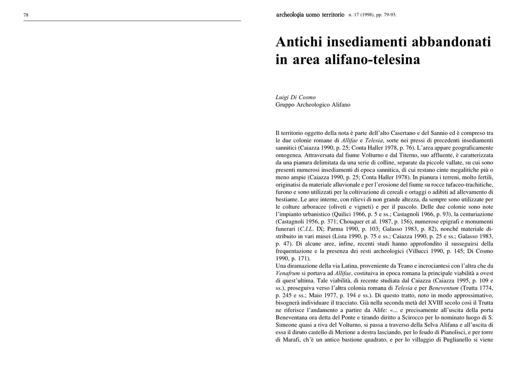 78 n. 17 (1998), pp. 79-93. Antichi insediamenti abbandonati in area alifano-telesina Luigi Di Cosmo Gruppo Archeologico Alifano Il territorio oggetto della nota è parte dell’alto Casertano e del Sannio ed è compreso tra le due colonie romane di Allifae e Telesia, sorte nei pressi di precedenti insediamenti sannitici (Caiazza 1990, p. 25; Conta Haller 1978, p. 76). L’area appare geograficamente omogenea. Attraversata dal fiume Volturno e dal Titerno, suo affluente, è caratterizzata da una pianura delimitata da una serie di colline, separate da piccole vallate, su cui sono presenti numerosi insediamenti di epoca sannitica, di cui restano cinte megalitiche più o meno ampie (Caiazza 1990, p. 25; Conta Haller 1978). In pianura i terreni, molto fertili, originatisi da materiale alluvionale e per l’erosione del fiume su rocce tufaceo-trachitiche, furono e sono utilizzati per la coltivazione di cereali e ortaggi o adibiti ad allevamento di bestiame. Le aree interne, con rilievi di non grande altezza, da sempre sono utilizzate per le colture arboracee (oliveti e vigneti) e per il pascolo. Delle due colonie sono note l’impianto urbanistico (Quilici 1966, p. 5 e ss.; Castagnoli 1966, p. 93), la centuriazione (Castagnoli 1956, p. 371; Chouquer et al. 1987, p. 156), numerose epigrafi e monumenti funerari (C.I.L. IX; Parma 1990, p. 103; Galasso 1983, p. 82), nonché materiale distribuito in vari musei (Lista 1990, p. 75 e ss.; Caiazza 1990, p. 25 e ss.; Galasso 1983, p. 47). Di alcune aree, infine, recenti studi hanno approfondito il susseguirsi della frequentazione e la presenza dei resti archeologici (Villucci 1990, p. 145; Di Cosmo 1990, p. 171). Una diramazione della via Latina, proveniente da Teano e incrociantesi con l’altra che da Venafrum si portava ad Allifae, costituiva in epoca romana la principale viabilità a ovest di quest’ultima. Tale viabilità, di recente studiata dal Caiazza (Caiazza 1995, p. 109 e ss.), proseguiva verso l’altra colonia romana di Telesia e per Beneventum (Trutta 1774, p. 245 e ss.; Maio 1977, p. 194 e ss.). Di questo tratto, noto in modo approssimativo, bisognerà individuare il tracciato. Già nella seconda metà del XVIII secolo così il Trutta ne riferisce l’andamento a partire da Alife: «... e precisamente all’uscita della porta Beneventana ora detta del Ponte e tirando diritto a Scirocco per lo nominato luogo di S. Simeone quasi a riva del Volturno, si passa a traverso della Selva Alifana e all’uscita di essa il diruto castello di Merione a destra lasciando, per lo feudo di Pianolisci, e per torre di Marafi, ch’è un antico bastione quadrato, e per lo villaggio di Puglianello si viene 80 Di Cosmo all’antica Telesia» (Trutta 1774, p. 245 e ss.). L’acuta descrizione di uno dei più importanti precursori dell’archeologia è senza dubbio un’utile e stimolante testimonianza per lo studio dell’area. Nell’ambito di un’indagine di superficie su alcuni insediamenti minori scomparsi, di epoca medievale, ma di cui si conserva il toponimo, sono emersi elementi utili per individuare la frequentazione dell’area. Di tale indagine si presentano i primi risultati. Questi siti, posti in vicinanza del fiume Volturno o del Titerno, suo affluente, furono sicuramente favoriti dalla presenza dell’antica viabilità e, tranne quelli di natura prettamente militare, si disposero, a quanto sembra, su preesistenti insediamenti di epoca romana. AREA S. PIETRO - S. SIMEONE È sita nei pressi del fiume Volturno, alla confluenza con il Torano, in area pianeggiante, nei pressi della Selva di Alife. I due toponimi indicano un’area molto vasta, attualmente sottoposta a lavori agricoli intensivi. Soprattutto in località S. Simeone sono stati effettuati notevoli interventi di bonifica tali da distruggere qualsiasi traccia di insediamento. Le fonti storiche sono comunque interessanti. Di un convento di S. Pietro, fondato nel 719 dall’abate Taccone, al tempo di Romualdo di Benevento, e che fu sotto la giurisdizione del duca Gisulfo (Marrocco 1979, p. 126), è nota ancora l’esistenza nel 1137 (Bloch 1986, p. 145). In S. Simeone, località contigua, era presente nel XIII secolo un insediamento ospedaliero dell’ordine di S. Giovanni Gerosolimitano (Marrocco 1979, p. 130). Nel 1373 in un atto notarile è citata tra i beni dell’ordine la precettoria o domus di S. Simeone, appartenente al Priorato di Capua e che «antiquitus fuit et est dicti hospitalis» (Capolongo 1996, p. 27). L’intera area è, quindi, interessata da un insediamento monastico longobardo e da una precettoria templare e gerosolimitana. Quest’ultima presenza, insieme ad altre dell’ordine in area alifana, sono indice di una importante viabilità. In superficie non si evidenziano tracce di mura attribuibili con sicurezza a edifici. Notevole è la presenza di frammenti ceramici di varie epoche, dalla vernice nera alla sigillata africana, all’invetriata e smaltata medievale. Il materiale proveniente da S. Pietro, di particolare importanza, è stato edito in studi recenti, di cui si ricorda quello pubblicato in «Archeologia Uomo Territorio» n. 13 (Di Cosmo 1994, p. 172). Pertanto qui si presentano solo due frammenti ceramici inediti che ben rappresentano l’ampia continuità di frequentazione dell’area. Antichi insediamenti in area alifano-telesina trova confronti in ambito napoletano (Ventrone Vassallo 1984, tav. CXIV, n. 414 e p. 284), venga modificato a livello locale. AREA COMPOSTELLA - TORRE DEL DUCA Caratterizzata da un piccolo tratto di pianura, è sita tra il Volturno e i rilievi collinari di Colle Alto e Colle de Sugli, i quali si portano quasi a lambire il letto del fiume, determinando una stretta gola. Qui quasi sicuramente doveva passare una diramazione della via Latina e vi doveva essere un guado del fiume per permettere di raggiungere l’area opposta sita nel territorio degli attuali comuni di Ruviano e Alvignano e interessata da insediamenti di epoca romana e 