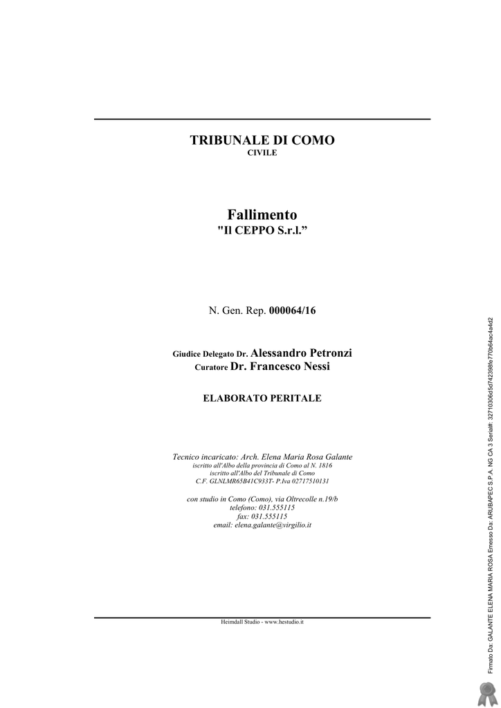 TRIBUNALE DI COMO CIVILE Fallimento "Il CEPPO S.r.l.” Giudice Delegato Dr. Alessandro Petronzi Curatore Dr. Francesco Nessi ELABORATO PERITALE Tecnico incaricato: Arch. Elena Maria Rosa Galante iscritto all'Albo della provincia di Como al N. 1816 iscritto all'Albo del Tribunale di Como C.F. GLNLMR65B41C933T- P.Iva 02717510131 con studio in Como (Como), via Oltrecolle n.19/b telefono: 031.555115 fax: 031.555115 email: [email protected] Heimdall Studio - www.hestudio.it Firmato Da: GALANTE ELENA MARIA ROSA Emesso Da: ARUBAPEC S.P.A. NG CA 3 Serial#: 32710306d5d742398fe770b64ac4a4d2 N. Gen. Rep. 000064/16 Fallimento N.000064/16 IL CEPPO Sr.l. Beni in Grandate (Como) via Repubblica n. 26 1.IDENTIFICAZIONE DEI BENI IMMOBILI OGGETTO DELLA VENDITA: A.Piena proprietà per la quota di 1000/1000 di appartamento mansardato (di tipo economico), posto al piano sottotetto di un immobile di tre piani fuori terra, sito in Grandate (Como), via Repubblica n. 26. L’unità immobiliare è composta da: disimpegno, cucina, soggiorno, camera, bagno 1, bagno 2, locale di sgombero. L'esposizione dell'unità immobiliare è in lato sud, est ed ovest; la parete rivolta verso nord divide l’appartamento da un’altra unità abitativa proprietà di terzi (mappale 2434 sub 712) e dal vano scala comune ai mappali 2434 sub 711 e 712. Le superfici calpestabili dei locali che compongono l'appartamento sono le seguenti: disimpegno mq. 5.67, cucina mq. 10.80, soggiorno mq. 23.23, camera mq. 15.16, bagno 1 mq. 4.93, bagno 2 mq. 3.24, locale di sgombero mq. 9.09. Tutti i locali hanno una altezza variabile: soggiorno e cucina h. 200-314, nel locale di sgombero h. h.226-312 cm, camera h. 200-315 cm., bagno 1 h. 200-273 cm., disimpegno h. 280-313 cm. La superficie calpestabile totale dell'unità immobiliare è di mq. 72,10. Posto al piano sottotetto sviluppa una superficie lorda complessiva, esclusi gli accessori, di circa mq 85,14. Identificato al Catasto Fabbricati con scheda intestata a IL CEPPO S.r.l. (con sede in Como, c.f. 02771230139) per la quota di 1/1 di proprietà, registrata all’UTE del comune di Grandate, foglio 4, mappale 2434 subalterno 711, classe 2, categoria A/3, composto da vani 4.5, superficie catastale 91 mq., posto al piano 2, - rendita: euro 325,37 (variazione del 09.11.2015 inserimento in visura dei dati di superficie). Coerenze: da nord in senso orario vano scale (dal piano primo al piano sottotetto) di proprietà esclusiva dell’immobile unitamente al mappale 2434 sub 712, pianerottolo mappale 2424 sub 713 di proprietà esclusiva dell’immobile e del mappale 2434 sub 712, altra unità immobiliare al mappale 2434 sub 712, prospetto su beni comuni mappale 2434 sub 718, prospetto su mappale 2434 sub 710, 709 (lastrico solare) e quindi mappale 2434 sub 718 (bene comune non censibile ai mappali 2434 sub 4, 7,8, 701, 702, 704, 705, 706, 707, 708, 709, 710, 711, 712, 713, 7, 14, 715, 716, 717), prospetto su bene comune mappale 2434 sub 718. B. Piena proprietà per la quota di 1000/1000 di posto auto coperto sito in Grandate (Como), via Repubblica n. 26. L’unità immobiliare è composta da un unico locale dalla forma trapezoidale; si accede all’unità attraverso l’area distinta al Catasto Terreni con il mappale 2433 di ha 0.02.07 (area che compete al fabbricato in cui è inserito l’immobile per la quota indivisa di una metà). Posto al piano seminterrato sviluppa una superficie lorda complessiva di circa mq. 24.09; la superficie calpestabile è di mq. 20,21. L’altezza del box è di cm.210-227. Identificato al Catasto Fabbricati con scheda (dichiarazione protocollo n. CO0139556 del 07.03.2005) intestata a IL CEPPO S.r.l. (con sede in Como, c.f. 02771230139) per la quota di 1/1 di proprietà, registrata all’UTE del comune di Grandate, foglio 4, mappale 2434 subalterno 706, categoria C/6, consistenza 21 mq, superficie catastale 25 mq., posto al piano seminterrato, rendita: euro 93,27 (variazione del 09.11.2015 inserimento in visura dei dati di superficie). Coerenze: da nord in senso orario terrapieno, unità di proprietà di terzi al mappale 2434 sub 707, scivolo di accesso comune (mappale 2434 sub 718). Giudice Dr. Alessandro Petronzi Curatore/Custode Dr. Francesco Nessi Perito: Arch.Elena Maria Rosa Galante 2 di 14 Firmato Da: GALANTE ELENA MARIA ROSA Emesso Da: ARUBAPEC S.P.A. NG CA 3 Serial#: 32710306d5d742398fe770b64ac4a4d2 Lotto UNICO C. Proprietà per 182/1000 di quota provvisoria da definirsi con atto pubblico di area urbana, in Grandate (Como), via Repubblica n. 26. L’area urbana è posta in lato nord ovest rispetto al fabbricato che ospita l’appartamento di cui al punto A. Identificato al Catasto Fabbricati con scheda (dichiarazione protocollo n. CO0134458 del 23.10.2015) intestata a IL CEPPO S.r.l. (con sede in Como, c.f. 02771230139) per la quota provvisoria di 182/1000 di proprietà, registrata all’UTE del comune di Grandate, foglio 4, mappale 2434 subalterno 715, piano terra, categoria area urbana, consistenza 14 mq.; dati derivanti da unità afferenti edificate su aree di corte del 16.02.2012 protocollo n. CO0028272 in atti dal 16.02.2012; unità afferenti edificate su aree di corte (n. 609.1/2012). Coerenze: da nord in senso orario mappale 2433, mappale 2434 sub 718, mappale 2434 sub 716 e quindi ancora mappale 2434 sub 718. D. Proprietà per 182/1000 di quota provvisoria da definirsi con atto pubblico di area urbana, in Grandate (Como), via Repubblica n. 26. L’area urbana è posta in lato nord ovest rispetto al fabbricato che ospita l’appartamento di cui al punto A. Identificato al Catasto Fabbricati con scheda (dichiarazione protocollo n. CO0134458 del 23.10.2015) intestata a IL CEPPO S.r.l. (con sede in Como, c.f. 02771230139) per la quota provvisoria di 182/1000 di proprietà, registrata all’UTE del comune di Grandate, foglio 4, mappale 2434 subalterno 716, piano terra, categoria area urbana, consistenza 12 mq.; dati derivanti da unità afferenti edificate su are