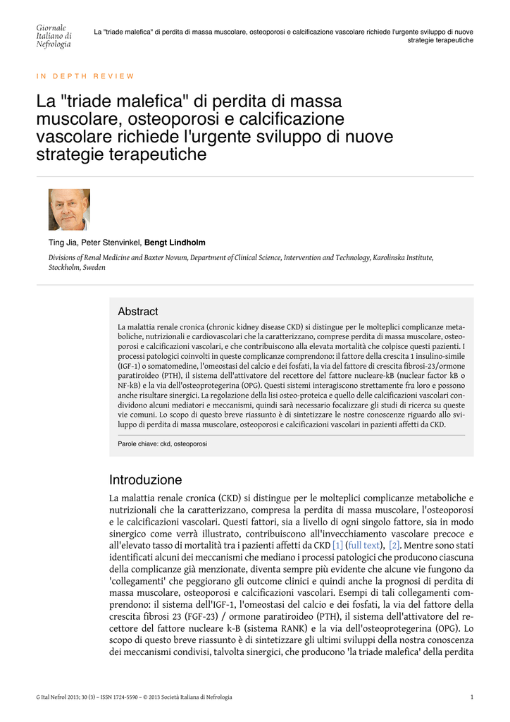 La "triade malefica" di perdita di massa muscolare, osteoporosi e calcificazione vascolare richiede l'urgente sviluppo di nuove strategie terapeutiche IN DEPTH REVIEW La "triade malefica" di perdita di massa muscolare, osteoporosi e calcificazione vascolare richiede l'urgente sviluppo di nuove strategie terapeutiche Ting Jia, Peter Stenvinkel, Bengt Lindholm Divisions of Renal Medicine and Baxter Novum, Department of Clinical Science, Intervention and Technology, Karolinska Institute, Stockholm, Sweden Abstract La malattia renale cronica (chronic kidney disease CKD) si distingue per le molteplici complicanze metaboliche, nutrizionali e cardiovascolari che la caratterizzano, comprese perdita di massa muscolare, osteoporosi e calcificazioni vascolari, e che contribuiscono alla elevata mortalità che colpisce questi pazienti. I processi patologici coinvolti in queste complicanze comprendono: il fattore della crescita 1 insulino-simile (IGF-1) o somatomedine, l'omeostasi del calcio e dei fosfati, la via del fattore di crescita fibrosi-23/ormone paratiroideo (PTH), il sistema dell'attivatore del recettore del fattore nucleare-kB (nuclear factor kB o NF-kB) e la via dell'osteoprotegerina (OPG). Questi sistemi interagiscono strettamente fra loro e possono anche risultare sinergici. La regolazione della lisi osteo-proteica e quello delle calcificazioni vascolari condividono alcuni mediatori e meccanismi, quindi sarà necessario focalizzare gli studi di ricerca su queste vie comuni. Lo scopo di questo breve riassunto è di sintetizzare le nostre conoscenze riguardo allo sviluppo di perdita di massa muscolare, osteoporosi e calcificazioni vascolari in pazienti affetti da CKD. Parole chiave: ckd, osteoporosi Introduzione La malattia renale cronica (CKD) si distingue per le molteplici complicanze metaboliche e nutrizionali che la caratterizzano, compresa la perdita di massa muscolare, l'osteoporosi e le calcificazioni vascolari. Questi fattori, sia a livello di ogni singolo fattore, sia in modo sinergico come verrà illustrato, contribuiscono all'invecchiamento vascolare precoce e all'elevato tasso di mortalità tra i pazienti affetti da CKD [1] (full text), [2]. Mentre sono stati identificati alcuni dei meccanismi che mediano i processi patologici che producono ciascuna della complicanze già menzionate, diventa sempre più evidente che alcune vie fungono da 'collegamenti' che peggiorano gli outcome clinici e quindi anche la prognosi di perdita di massa muscolare, osteoporosi e calcificazioni vascolari. Esempi di tali collegamenti comprendono: il sistema dell'IGF-1, l'omeostasi del calcio e dei fosfati, la via del fattore della crescita fibrosi 23 (FGF-23) / ormone paratiroideo (PTH), il sistema dell'attivatore del recettore del fattore nucleare k-B (sistema RANK) e la via dell'osteoprotegerina (OPG). Lo scopo di questo breve riassunto è di sintetizzare gli ultimi sviluppi della nostra conoscenza dei meccanismi condivisi, talvolta sinergici, che producono 'la triade malefica' della perdita G Ital Nefrol 2013; 30 (3) – ISSN 1724-5590 – © 2013 Società Italiana di Nefrologia 1 La "triade malefica" di perdita di massa muscolare, osteoporosi e calcificazione vascolare richiede l'urgente sviluppo di nuove strategie terapeutiche di massa muscolare, osteoporosi e calcificazioni vascolari in pazienti affetti da CKD. Nuove strategie terapeutiche sono necessarie per migliorare tale situazione. La perdita di massa muscolare nella ckd Pazienti affetti da CKD possiedono scorte insufficienti di proteine, sia a livello viscerale (cioè bassi livelli sierici) sia a livello somatico (perdita di massa muscolare). Tale situazione è causata o da una riduzione nella sintesi di proteine o da un aumento nella degradazione di proteine, oppure da entrambe le cose. Studi osservazionali evidenziano come la riduzione della massa muscolare scheletrica, una componente importante nel depauperamento del bilancio proteico (protein-energy wasting o PEW) [3] frequente nella CKD e nei pazienti sottoposti a dialisi [4] (full text), sia associata ad un'elevata mortalità e morbilità in pazienti affetti da CKD [5] (full text), [6] (full text). In condizioni di catabolismo, la massa corporea magra, in maggior parte costituita dai muscoli scheletrici, viene rapidamente distrutta producendo una condizione di sarcopenia (atrofia muscolare) e di dinapenia (perdita di forza muscolare). I pazienti uremici hanno un'inefficiente utilizzo delle proteine, causato sia da un apporto inadeguato di proteine con la dieta [7] sia dall'aumentata distruzione o dalla ridotta sintesi delle proteine, tutti fattori che provocano l'atrofia muscolare [8] (full text). Studi del metabolismo muscolare e delle proteine corporee in pazienti stabili con CKD, dimostrano costantemente come la malattia produca una riduzione equilibrata sia della sintesi che della distruzione delle proteine. Tuttavia, nella malattia renale terminale (end stage renal disease o ESRD), e soprattutto in pazienti sottoposti a dialisi, il catabolismo proteico diventa preponderante [9], [10], risultando in una netta perdita di massa muscolare [11]. Il trattamento dialitico è associato a fattori catabolici come la perdita cronica di sangue e di nutrienti, compresi glucosio, aminoacidi, peptidi, proteine e vitamine solubili: tutto ciò contribuisce alla perdita delle scorte proteiche nell'ESRD. Tuttavia, la concentrazione intracellulare di aminoacidi può rimanere stabile durante l'emodialisi (HD) mediante un rilascio aumentato di aminoacidi dal catabolismo delle proteine muscolari [12] (full text). Il sistema dell'ubiquitina-proteasoma nella perdita della massa muscolare Esiste evidenza che la perdita di massa corporea magra sia mediata dal sistema dell'ubiquitina-proteasoma (UPS) dipendente dall' adenosina trifosfato (ATP), presente nel muscolo [13]. Durante il digiuno, e nei pazienti affetti da diabete mellito scompensato, cachessia oncologica, sepsi o lo stato uremico, il catabolismo