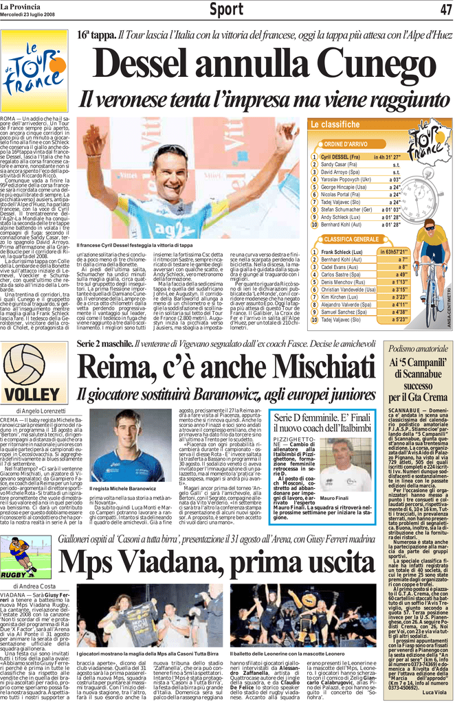 Sport La Provincia Mercoledì 23 luglio 2008 47 16ªtappa. Il Tourlascia l’Italia con la vittoria delfrancese, oggi la tappa più attesa con l'Alpe d'Huez Dessel annulla Cunego Il veronese tenta l’impresa ma viene raggiunto Le classifiche ORDINE D'ARRIVO 1 2 3 4 5 6 7 8 9 10 Cyril DESSEL (Fra) in 4h 31' 27" Sandy Casar (Fra) s.t. David Arroyo (Spa) s.t. Yaroslav Popovych (Ukr) a 03" George Hincapie (Usa) a 24" Nicolas Portal (Fra) a 24" Tadej Valjavec (Slo) a 24" Stefan Schumacher (Ger) a 01' 03" Andy Schleck (Lux) a 01' 28" Bernhard Kohl (Aut) a 01' 28" CLASSIFICA GENERALE Il francese Cyril Dessel festeggia la vittoria di tappa un'azione solitaria che si conclude a poco meno di tre chilometri dalla cima della Bonette. Ai piedi dell'ultima salita, Schumacher ha undici minuti sulla maglia gialla, circa quattro sul gruppetto degli inseguitori. La prima flessione importante è quella di Damiano Cunego. Il veronese della Lampre cede a circa otto chilometri dalla vetta perdendo progressivamente il vantaggio sul leader, così come il tedesco in fuga che viene raggiunto a tre dallo scollinamento. I migliori sono tutti insieme: la fortissima Csc detta il ritmo con Sastre, sempre incaricato di testare le gambe degli avversari con qualche scatto, e Andy Schleck, vero metronomo della formazione. Ma la faccia della sedicesima tappa è quella del sudafricano John-Lee Augustyn. Il corridore della Barloworld allunga a meno di un chilometro e si toglie la soddisfazione di scollinare in solitaria sul tetto del Tour de France (2.800 metri). Augustyn inizia la picchiata verso Jausiers, ma sbaglia a imposta- re una curva verso destra e finisce nella scarpata perdendo la bicicletta. Nella discesa, la maglia gialla è guidata dalla squadra e giunge al traguardo con i migliori. Per quanto riguarda Riccò sono di ieri le dichiarazioni pubblicate da ‘Le Monde’, con il corridore modenese che ha negato di aver assunto Epo. Oggi la tappa più attesa di questo Tour de France. Il Galibier, la Croix de Fer e l'arrivo in salita all'Alpe d'Huez, per un totale di 210 chilometri. 1 2 3 4 5 6 7 8 9 10 in 63h57'21'' Frank Schleck (Lux) a 7'' Bernhard Kohl (Aut) a 8'' Cadel Evans (Aus) a 49'' Carlos Sastre (Spa) a 1'13'' Denis Menchov (Rus) a 3'15'' Christian Vandevelde (Usa) a 3'23'' Kim Kirchen (Lux) a 4'11'' Alejandro Valverde (Spa) a 4'38'' Samuel Sanchez (Spa) a 5'23'' Tadej Valjavec (Slo) Serie 2 maschile. Il ventenne di Vigevano segnalato dall’ex coach Fasce. Decise le amichevoli Reima, c’è anche Mischiati Il giocatore sostituirà Baranowicz, agli europei juniores di Angelo Lorenzetti CREMA — Il baby regista Michele Baranowicz sarà presente il giorno del raduno in programma il 18 agosto alla 'Bertoni', ma saluterà tecnici, dirigenti e compagni a distanza di qualche ora per ritornare in nazionale juniores con la quale parteciperà ai campionati europei in Cecoslovacchia. Si aggregherà definitivamente ai blues solamente il 7 di settembre. Nel frattempo? «Ci sarà il ventenne Giacomo Mischiati, un alzatore di Vigevano segnalatoci da Giampiero Fasce, ex coach della Reima per un lungo periodo - argomenta il direttore sportivo Michele Rota - Si tratta di un ispiratore promettente che vuole dimostrare il suo valore ed a noi in quel periodo va benissimo. Ci darà un contributo prezioso e per questo dobbiamo essere riconoscenti al condottiero che ha portato la nostra realtà in serie A per la Il regista Michele Baranowicz prima volta nella sua storia a metà anni Novanta». Da subito quindi Luca Monti e Marco Camperi potranno lavorare a ranghi compatti. Intanto si sta delineando il quadro delle amichevoli. Già a fine agosto, precisamente il 27 la Reima andrà a fare visita al Piacenza, appuntamento che si rinnova quindi. Anche lo scorso anno Finazzi e soci sono andati a trovare il complesso emiliano, che in primavera ha dato filo da torcere sino all'ultimo a Trento per lo scudetto. «Piacenza con ogni probabilità ricambierà durante il campionato - osserva il diesse Rota - E' invece saltata la trasferta a Bassano in programma il 30 agosto. Il sodalizio veneto ci aveva invitato per l'imnaugurazione di un palazzetto, ma al momento la 'pratica' resta sospesa, magari si andrà più avanti». Magari ancor prima del torneo ‘Angelo Galli’ ci sarà l'amichevole, alla Bertoni, con il Segrate, compagine allenata da Vito Verderio. «In settembre ci sarà tra l'altro la conferenza stampa di presentazione di alcuni nuovi sponsor. A proposito, è sempre ben accetto chi vuol darci una mano». Serie D femminile. E’ Finali il nuovo coach dell’Italbimbi PIZZIGHETTONE — Cambio di allenatore alla Italbimbi di Pizzighettone, formazione femminile retrocessa in serie D. Al posto di coach Mosconi, costretto ad abbandonare per impegni di lavoro, è ar- Mauro Finali rivato l’esperto Mauro Finali. La squadra si ritroverà nelle prossime settimane per iniziare la stagione. Gialloneriospitial‘Casoniatuttabirra’,presentazioneil31agostoall’Arena,conGiusyFerrerimadrina Mps Viadana, prima uscita di Andrea Costa VIADANA — Sarà Giusy Ferreri a tenere a battesimo la nuova Mps Viadana Rugby. La cantante, rivelazione dell’estate 2008 con la canzone ‘Non ti scordar di me’ e protagonista del programma di Rai Due ‘X Factor’, sarà all’Arena di via Al Ponte il 31 agosto per animare la serata di presentazione ufficiale della squadra giallonera. Una festa cui sono invitati tutti i tifosi della palla ovale: «Abbiamo scelto Giusy Ferreri perché è prima in tutte le classifiche sia rispetto alle vendite che in quella dei brani più ascoltati per radio, proprio come speriamo possa fare la nostra squadra. Aspettiamo tutti i nostri supporter a I giocatori mostrano la maglia della Mps alla Casoni Tutta Birra braccia aperte», dicono dal club viadanese. Quella del 31 agosto sarà la prima passerella della nuova Mps, squadra costruita per puntare al massimi traguardi. Con l’inizio della nuova stagione, tra l’altro, far