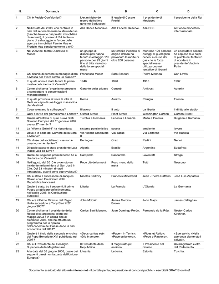 N. Domanda A L'ex ministro del tesoro dell'ultimo governo Berlusconi B Chi è Fedele Confalonieri? 2 Nell'estate del 2008, con l'entrata in Alla Banca Mondiale. crisi del settore finanziario statunitense (banche travolte dai prestiti immobiliari dissennati), il governo USA tenta un piano di salvataggio in favore delle agenzie immobiliari Fannie Mae e Freddie Mac congiuntamente a chi? Alla Federal Reserve. Alla BCE. Al Fondo monetario internazionale. 3 Nel 2002 nel teatro Dubrovka di Mosca: un terribile incendio di origine dolosa ha provocato la morte di oltre 200 persone morirono 129 persone ostaggi di guerriglieri ceceni a causa dei gas che le forze speciali russe utilizzarono nel tentativo di liberarli un attentatore ceceno ha esploso due colpi di pistola nel tentativo di uccidere il presidente Vladimir Putin 4 Chi rischiò di perdere la medaglia d'oro Francesco Moser a Mosca per avere alzato un braccio? Sara Simeoni Pietro Mennea Carl Lewis 5 In quale anno è stata tenuta la prima mostra del cinema di Venezia? 1946 1920 1915 1932 6 Come si chiama l'organismo preposto a combattere le concentrazioni monopolistiche? Garante della privacy Consob Antitrust Autority 7 In quale provincia si trova la villa di Gelli, ex capo di una loggia massonica clandestina? Roma Arezzo Perugia Firenze 8 Cosa volevano le suffragette? Il lavoro Il voto La libertà Il diritto allo studio 9 Qual è la via del giornalismo a Londra? Oxford Street Fleet Street Washington Garden Gordon Street 10 Grazie all'entrata di quali nuovi Stati l'Unione Europea dal 1° gennaio 2007 aveva 27 membri? Turchia e Romania. Lettonia e Lituania. Malta e Polonia. Bulgaria e Romania. 11 La "riforma Gelmini" ha riguardato: sistema pensionistico scuola ambiente lavoro 12 Dove è la sede del Corriere della Sera a Milano? Via Vittorio Emanuele Via Tasso II Via Solferino Via Rasella 13 Chi disse del socialismo: «se non è umano, non è niente»? Berlinguer Craxi Pertini Nenni 14 Di quale paese è stato presidente Luiz Inácio Lula da Silva? Algeria Brasile Argentina Sudafrica 15 Quale dei seguenti premi letterari ha a che fare con Venezia? Campiello Bancarella Lovecraft Strega 16 Nell'agosto del 2010 è avvenuto un Poco più della metà incidente nella miniera di San Josè in Cile. Dei 33 minatori rimasti intrappolati, quanti sono sopravvissuti? Poco meno della metà Tutti Nessuno 17 Chi è stato il successore di Jacques Chirac come Presidente della Repubblica francese? Nicolas Sarkozy Francois Mitterrand Jean - Pierre Raffarin José Luis Zapatero 18 Quale è stato, tra i seguenti, il primo Paese a ratificare definitivamente, nell'aprile 2005, la Costituzione europea? L'Italia La Francia L'Olanda La Germania 19 Chi era il Primo Ministro del Regno Unito succeduto a Tony Blair il 27 giugno 2007? John McCain. James Gordon Brown. John Major. James Callaghan. 20 Come si chiama il presidente della Repubblica argentina, eletto nel maggio 2003 e in carica fino al dicembre 2007, che ha attuato un programma per la ripresa dell'economia del Paese dopo la crisi economica del 2001? Carlos Saúl Menem. Juan Domingo Perón. Fernando de la Rúa. Néstor Carlos Kirchner. 21 Quale è il titolo della seconda enciclica «Deus caritas est»: del Papa Benedetto XVI pubblicata nel «Dio è amore». 2007? «Pacem in Terris»: «Pace sulla terra». «Fides et Ratio»: «Fede e Ragione». «Spe salvi»: «Nella speranza siamo stati salvati». 22 Chi è il Presidente del Consiglio Superiore della Magistratura? Il magistrato più anziano Il Presidente del Senato Un magistrato eletto dal Parlamento 23 Alla data del 30 giugno 2008, quale dei Lituania. seguenti paesi non fa parte dell'Unione Europea? Lettonia. Estonia. Turchia. Il Presidente della Repubblica Il presidente di Mediaset D 1 un gruppo di disoccupati hanno tenuto in ostaggio 110 persone per 23 giorni fino al blitz risolutivo delle forze speciali russe Il legale di Cesare Previti C Il presidente della Rai Documento scaricato dal sito mininterno.net - il portale per la preparazione ai concorsi pubblici - esercitati GRATIS on-line! N. Domanda A B C D 24 Alla data del 30 giugno 2004, quale dei Svizzera seguenti paesi non fa parte dell'Unione Europea? Lussemburgo Polonia Repubblica Ceca 25 Quale delle seguenti attrici ha interpretato il ruolo di Ilaria Alpi in un film? Vittoria Belvedere Margherita Buy Giovanna Mezzogiorno Cristiana Capotondi 26 Dove è la sede della stazione televisiva americana CNN? Atlanta New York Dallas Denver 27 Come si chiama la leader della cosiddetta "Rivoluzione Arancione", liberata nel febbraio 2014? Julia Tymosenko Ludmila Telegina Mata Hari Yevhenia Tymosenko 28 Cosa si intende con «dissesto idrogeologico»? La rarefazione dello strato atmosferico di ozono Lo sconvolgimento L'insieme degli dell'assetto dei terreni sconvolgimenti e dei corsi d'acqua provocati dai terremoti L'innalzamento del livello dei mari 29 Nel 2003 durante un conflitto a fuoco a della brigatista Nadia bordo del treno Roma-Firenze muore il Desdemona Lioce sovrintendente di polizia Emanuele Petri e avviene la cattura: di Matteo Boe evaso dal carcere di Nuoro del terrorista islamico Ayman Zawahiri del boss mafioso Pietro Aglieri 30 Chi era il Capo dello Stato britannico al Margaret Thatcher. luglio 2008? Gordon Brown. Elisabetta II. Tony Blair. 31 Quale referendum si è svolto in Italia il 25 e il 26 giugno 2006? Il referendum sulla riforma costituzionale varata nella XIV legislatura inerente i cambiamenti nell'assetto istituzionale nazionale della seconda parte della Costituzione. Il referendum abrogativo della legge Gasparri sulle concessioni televisive. Per la privatizzazione della RAI, conclusosi con un nulla di fatto a causa dell'altissima astensione. Il referendum abrogativo della legge sulla fecondazione assistita. 32 Quale dei seguenti Paesi è divenuto solo di recente membro dell'Organizzazione Mondiale del Commercio? Francia Cina Giappone Spagna 33 Chi, tra i seguenti, è il medico italiano che fu il pr