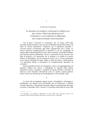1 COSTANZO CARGNONI IL SIGNIFICATO STORICO, TEOLOGICO E SPIRITUALE DEL TITOLO “DOCTOR APOSTOLICUS” CONFERITO A SAN LORENZO DA BRINDISI, NEL CINQUANTESIMO ANNIVERSARIO ∗ Con il breve «Celsitudo ex humilitate» del 19 marzo 1959 papa Giovanni XXIII proclamava san Lorenzo da Brindisi dottore della chiesa, col titolo di “doctor apostolicus”. Esprimere qui il significato profondo e rievocare questo avvenimento oggi dopo cinquant’anni non è facile. La storia è trascorsa vertiginosamente, la memoria si è un po’ arrugginita, la cultura della modernità preferisce forse altre ricorrenze, e potrebbe sembrare una forzatura questa celebrazione. Invece è necessaria sia per ritrovare una linfa di pensiero e di ispirazione che la dottrina e la santità di Lorenzo offrono in abbondanza, sia per animare la nostra vita e il nostro apostolato con lo slancio spirituale del santo. Infatti si tratta di eccelsa e solida dottrina e di apostolato ardente e missionario, di evangelizzazione apostolica ed ecclesiale. Senza pretendere di dire cose peregrine e nuove, ma appoggiandomi ad eminenti studiosi del settore e affondando lo sguardo nella triplice dimensione storica, teologica e spirituale di questa memoria ecclesiale di salvezza, vorrei ricordare velocemente come si è giunti a questo glorioso titolo e come esso diventa per noi un programma e una consegna vitali. I La storia che ha preparato questo evento è frastagliata e incomincia a manifestarsi con ripetuti inviti nell’Ordine già nel burrascoso e difficile secondo Ottocento; e diventa più insistente, dopo la canonizzazione del santo avvenuta l’8 dicembre 1881 e fissata il 15 dicembre nella bolla di Leone XIII —————— ∗ Si riproduce, col permesso dell’autore, il testo della lectio magistralis svolta il 10 dicembre 2009 nell’Aula Magna del Palazzo Arcivescovile in Brindisi. 2 Infelices mundi1, e particolarmente durante il capitolo generale del 1884. Ma era assolutamente necessaria una condizione preliminare, ossia preparare un’edizione di tutti gli scritti del Santo, assai numerosi, per documentare e giustificare la richiesta di un suo dottorato nella Chiesa. Tanto è vero che alcuni vescovi erano contrari perché i suoi scritti erano rimasti inediti e sconosciuti. Si fecero vari tentativi per iniziare questo lavoro, da alcuni consideratoma l’affare ristagnò e la prima guerra mondiale smorzò per un po’ questa fiamma, che rimase nascosta sotto le ceneri. Quando la guerra si trovava ormai alle sue ultime battute, prese consistenza l’idea di affidare il lavoro di trascrizione dei codici di san Lorenzo a un professore della Biblioteca Estense di Modena il sig. Giuseppe Perugi che il 20 novembre 1917 firmava a Venezia un legale contratto di lavoro per 6000 lire. Un lavoro che presto risultò assai difficile e complicato anche a livello legale sia per le incoerenti esigenze economiche del professore, sia per l’inganno e trascuratezza dimostrati nel lavoro perchè questo strano professore faceva perdere le sue tracce e dopo tre anni non aveva ancora trascritto e e riconsegnato i codici2. Si cercò allora una via nuova e intanto si ricuperarono i manoscritti consegnati. La storia del ricupero dei manoscritti laurenziani divenne come un giallo e una traccia di queste avventure di ricerca e della tenacia da segugio del segretario provinciale p. Venceslao da S. Martino si legge in una documentazione curiosa conservata sia presso l’Archivio Generale che nell’Archivio della Provincia veneta. Ma non possiamo seguire tutti gli intrecci di questa curiosa vicenda che durò oltre tre anni dal 1918 al 1921. Ricuperati i volumi (le parziali trascrizioni che il professore aveva fatto risultarono piuttosto lacunose), il min. Prov. di Venezia p. Vigilio da Valstagna si diede totalmente all’edizione delle opere di S. Lorenzo e segnalò alla Provincia questo impegno come un punto programmatico del suo gioverno. Il p. Generale, Giuseppe Antonio da Persiceto, lodandolo gli consigliava di mettere «ogni diligenza e tutta quella accuratezza e decoro che si —————— Cf. Anal. O.F.M. Cap. 3 (1887) 65-75. La corrispondenza che citeremo nel costruire la storia della edizione dei manoscritti di san Lorenzo si trova a Roma, nell’Archivio Generale dell’Ordine (AGO), cart. G 142/9: Editio Operum Omnium S. Laurentii Brundusini. I fogli non sono numerati per cui non possiamo dare una segnatura precisa ai singoli documenti. 1 2 3 richiede». E suggerì di porre tutto «sotto l’alta direzione dei due ill.mi e rev.mi confratelli” vescovi, mons. Andrea Longhin, vesc. di Treviso, e mons. Luca Pasetto, vesc. tit. di Gerra. Il 9 dic. 1925 rispondeva mons. Luca Ermenegildo Pasetto dicendosi onorato di avere «l’alta direzione dell’edizione», anche se è un incarico «superiore alle mie forze», ma lo fa per amore verso il Santo e verso la Provincia e per ubbidienza al Generale. Mons. Longhin (oggi dichiarato Beato) da parte sua si schermiva dicendo: «Non so quale contributo potrò portare all’opera di edizione degli scritti di S. Lorenzo: non sono un critico io, né sono specializzato in simili studi. Ad ogni modo non voglio mancare di gentilezza alla sua così delicata e benevola preghiera…»3. Nella seduta definitoriale del 24 giugno 1926 il ministro provinciale p. Vigilio da Valstagna aveva destinato i Padri per l’edizione delle opere di S. Lorenzo e fissò un contratto con la tipografia del Seminario di Padova che si assumeva anche la direzione della parte letteraria continuando così le sue gloriose tradizioni. Dopo le umili rimostranze dei due vescovi, i revisori vennero cambiati e il nuovo ministro generale Melchiorre da Benisa scelse P. Edoardo d’Alençon archivista dell’Ordine e p. Ilarino da Lucerna, il meglio allora in campo scientifico nell’Ordine. L’edizione avrebbe comportato circa 12 volumi in folio, e alla fine una “critica disquisitio”. [Sappiamo che quando l’edizione si concluse nel 