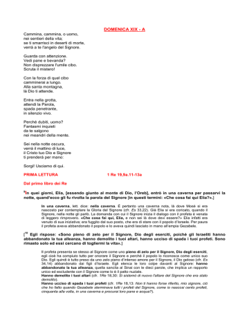 DOMENICA XIX - A Cammina, cammina, o uomo, nei sentieri della vita; se ti smarrisci in deserti di morte, verrà a te l'angelo del Signore. Guarda con attenzione. Vedi pane e bevanda? Non disprezzare l'umile cibo. Scruta il mistero! Con la forza di quel cibo camminerai a lungo. Alla santa montagna, là Dio ti attende. Entra nella grotta, attendi la Parola, spada penetrante, in silenzio vivo. Perché dubiti, uomo? Fantasmi inquieti da te salgono nei meandri della mente. Sei nella notte oscura, verrà il mattino di luce, il Cristo tuo Dio e Signore ti prenderà per mano: Sorgi! Usciamo di qui. PRIMA LETTURA 1 Re 19,9a.11-13a Dal primo libro dei Re 9 In quei giorni, Elia, [essendo giunto al monte di Dio, l’Oreb], entrò in una caverna per passarvi la notte, quand’ecco gli fu rivolta la parola del Signore [in questi termini: «Che cosa fai qui Elia?».] In una caverna, lett. dice: nella caverna. È pertanto una caverna nota, là dove Mosè si era nascosto per contemplare la Gloria del Signore (cfr. Es 33,22). Già Elia si era coricato, quando il Signore, nella notte gli parlò. La domanda con cui il Signore inizia il dialogo con il profeta è venata di leggero rimprovero. «Che cosa fai qui, Elia, e non sei là dove devi essere?» Elia infatti era venuto di sua iniziativa; era fuggito dal suo posto, che era di stare con il popolo d’Israele. Per paura il profeta aveva abbandonato il popolo e lo aveva quindi lasciato in mano all’empia Gezabele. 10 [ Egli rispose: «Sono pieno di zelo per il Signore, Dio degli eserciti, poiché gli Israeliti hanno abbandonato la tua alleanza, hanno demolito i tuoi altari, hanno ucciso di spada i tuoi profeti. Sono rimasto solo ed essi cercano di togliermi la vita».] Il profeta presenta se stesso al Signore come uno pieno di zelo per il Signore, Dio degli eserciti, egli cioè ha compiuto tutto per onorare il Signore e perché il popolo lo riconosca come unico suo Dio. Egli quindi è tutto preso da uno zelo pieno d’intenso amore per il Signore, il Dio geloso (cfr. Es 34,14) abbandonato dai figli d’Israele. Egli elenca le loro colpe davanti al Signore: hanno abbandonato la tua alleanza, quella sancita al Sinai con le dieci parole, che implica un rapporto unico ed escludente con il Signore come lo è il patto nuziale. Hanno demolito i tuoi altari (cfr. 1Re 18,30: Si sistemò di nuovo l'altare del Signore che era stato demolito). Hanno ucciso di spada i tuoi profeti (cfr. 1Re 18,13: Non ti hanno forse riferito, mio signore, ciò che ho fatto quando Gezabele sterminava tutti i profeti del Signore, come io nascosi cento profeti, cinquanta alla volta, in una caverna e procurai loro pane e acqua?). Sono rimasto solo ed essi cercano di togliermi la vita, davanti al Signore il profeta dichiara di essere l’unico rimasto a difendere la signoria di Dio sul suo popolo. Tutti i profeti del Signore si sono nascosti intimoriti dalla regina e non profetizzano più in nome del Signore. Elia sta quindi davanti al Signore come colui che accusa i peccati del suo popolo e quindi implicitamente chiede al Signore che compia la sua vendetta. 11 Gli disse: «Esci e fermati sul monte alla presenza del Signore». Ed ecco che il Signore passò. Esci dalla grotta e fermati sul monte cioè all’ingresso della grotta. Vi è un intenzionale rapporto con la visione di Mosè sulla stessa montagna. «Ecco un luogo vicino a me. Tu starai sopra la rupe» (Es 33,21). Questo esplicito riferimento mette in rapporto le due visioni nella stessa montagna, quella di Mosè e quella di Elia. Ed ecco che il Signore passò. Continuano le corrispondenze con la visione di Mosè: «quando passerà la mia Gloria» (Es 33,22); Il Signore passò davanti a lui (Es 34,6). Il Signore è preceduto dai suoi messaggeri: il vento impetuoso, il terremoto, il fuoco (cfr. Sal 104,4: Fai dei venti i tuoi messaggeri, delle fiamme guizzanti i tuoi ministri). Ci fu un vento impetuoso e gagliardo da spaccare i monti e spezzare le rocce davanti al Signore, ma 12 il Signore non era nel vento. Dopo il vento, un terremoto, ma il Signore non era nel terremoto. Dopo il terremoto, un fuoco, ma il Signore non era nel fuoco. Il vento impetuoso annuncia la venuta del Signore anche nella visione del Carro della Gloria in Ez 1,4: Io guardavo ed ecco un uragano avanzare dal settentrione, una grande nube e un turbinìo di fuoco, che splendeva tutto intorno. Ma il Signore non era nel vento. Ma Elia non vide nel vento la Gloria del Signore. Dopo il vento ci fu un terremoto. Anche questo è un segno che appartiene alla teofania del Sinai, come precisa il Sal 68,9: la terra tremò, stillarono i cieli davanti al Dio del Sinai, davanti a Dio, il Dio d’Israele. Ma anche qui Elia non vide la Gloria del Signore. Dopo il terremoto ci fu un fuoco. Anche nella manifestazione al popolo nel dono della Legge ci fu il fuoco: Il monte Sinai era tutto fumante, perché su di esso era sceso il Signore nel fuoco e il suo fumo saliva come il fumo di una fornace: tutto il monte tremava molto (Es 19,18). Il Signore non passa attraverso questi segni di potenza e di giudizio perché vuole fare misericordia al suo popolo. Egli pertanto manifesta ad Elia questi segni della sua potenza ma non facendosi presente in essi Egli fa comprendere al profeta che non qui ma altrove Elia deve cercare la presenza del Signore. Dopo il fuoco, il sussurro di una brezza leggera. Il sussurro di una brezza leggera lett.: una voce silenziosa sottile. La voce del Signore non si confonde con quella dei suoi messaggeri (vento, terremoto,fuoco), che tanto impressionano noi uomini, ma essa si esprime nel silenzio e si fa penetrante. Egli vuol fare udire la sua Parola non incutendo a noi timore quale suscitano i suoi messaggeri ma vuole incontrarci in un profondo silenzio e vuole penetrare nel nostro intimo e incidere in noi la sua Parola. Non nel fuoco del Carmelo e non nella spada vendicatrice, Elia incontra il Signore, ma solo dopo un cammino di purificazione nel deserto. Dopo a