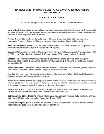 59° EDIZIONE - PREMIO FEDELTA’ AL LAVORO E PROGRESSO ECONOMICO “LA NOSTRA STORIA” tributo ai protagonisti storici del territorio nell’anno del Bicentenario Luigi Alberini giornalista, uomo politico, studioso di questioni sociali, direttore del Corriere della Sera dal 1900 al 1925, lungimirante ideatore di prodotti editoriali che sono entrati nel patrimonio culturale e civile di generazioni di italiani Franco Corelli titanica figura tenorile che in 25 anni di carriera lirica internazionale ha inaugurato 7 volte la Scala di Milano e 13 volte il Metropolitan Opera di New York Gino De Dominicis pittore, scultore, filosofo e architetto, una delle personalità più poliedriche, provocatorie e stimolanti dell’Arte italiana del XX secolo Augusto Elia, militare e politico, Presidente della Camera di Commercio di Ancona tra dal 1877 al 1892, fu a Calatafimi tra i Mille e lì, il 15 maggio del 1860, salvò la vita a Garibaldi. Giorgio Fuà grande economista, maestro di economia politica, analista dello sviluppo, fondatore della facoltà di Economia dell'Università degli Studi di Ancona e dell'ISTAO Istituto Adriano Olivetti Mario Giacomelli - fotografo, pittore, poeta e tipografo, ha raccontato il paesaggio marchigiano oltre i confini nazionali traducendone i segni in idee ed emozioni Aristide Merloni imprenditore, fondatore della Merloni s.p.a., artefice dell’industrializzazione dell’area interna dell’Appennino Marchigiano Maria Montessori, grande pedagogista e prima donna laureata in Medicina in Italia, educatrice, strenua sostenitrice della potenza dell’alfabeto, la più importante conquista dell’umanità, veicolo di messaggi, emozioni capaci di superare il tempo e lo spazio. Valeria Moriconi prim’attrice e intensa protagonista della scena cinematografica e teatrale italiana del 900, direttrice artistica del Teatro Stabile delle Marche Galliano detto Liano Rossini tiratore olimpionico anconetano vincitore della medaglia d’oro a Melbourne 1956 e della medaglia d’argento a Roma 1960 Franco Scataglini poeta e pittore, ha fatto dell’idioma anconetano il suono e il canto di una affettività domestica e del fenomenale essere al mondo