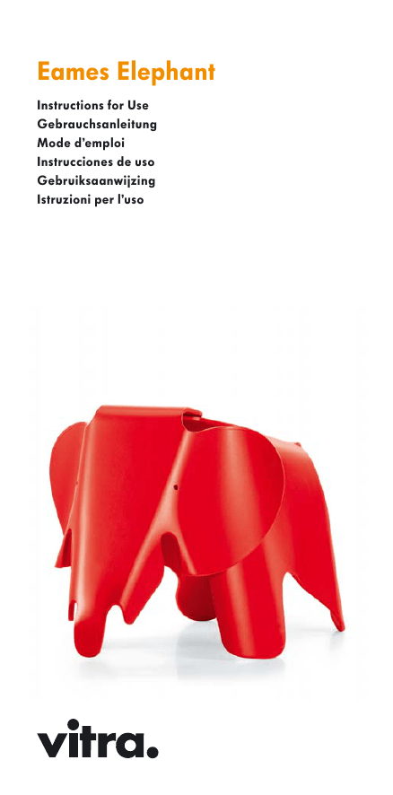 Eames Elephant Instructions for Use Gebrauchsanleitung Mode d’emploi Instrucciones de uso Gebruiksaanwijzing Istruzioni per l’uso You have decided to purchase a Vitra quality product. The Vitra mark is a guarantee that you own an original product by Charles & Ray Eames. Eames Elephant complies with the standards EN71, ASTM F 963-07. Sie haben sich für ein Vitra-Qualitätsprodukt entschieden. Die Marke Vitra garantiert Ihnen, dass Sie ein OriginalProdukt von Charles & Ray Eames besitzen. Eames Elephant entspricht den Normen EN71, ASTM F 963-07. Vous avez choisi un produit de qualité Vitra. La marque Vitra vous garantit de posséder un produit authentique de Charles & Ray Eames. Eames Elephant répond aux exigences des normes EN71, ASTM F 963-07. Acaba de adquirir un producto de calidad Vitra. La marca Vitra le garantiza que ha adquirido un producto original de Charles & Ray Eames. Eames Elephant cumple las normas EN71, ASTM F 963-07. Gefeliciteerd met uw aankoop van een Vitra-kwaliteitsproduct. Het merk Vitra verschaft u de zekerheid dat u een origineel product van Charles & Ray Eames in uw bezit heeft. Eames Elephant voldoet aan de normen EN71, ASTM F 963-07. Avete scelto un prodotto di qualità Vitra. Il marchio Vitra vi garantisce di essere in possesso di un prodotto originale di Charles & Ray Eames. Eames Elephant è conforme alle norme EN71, ASTM F 963-07. Charles (1907-1978) and Ray (1912-1988) Eames number among the most important figures in twentieth-century design. During the four decades of their work together, the Eameses produced not only many groundbreaking furniture designs, but also significant architectural works, exhibitions, films, graphics and photographs. Vitra‘s collaboration with Charles and Ray Eames began in 1957. For over 50 years, Vitra has worked closely with the Eames Office in the production of Eames furniture with guaranteed standards of high quality and authenticity. Charles (1907-1978) y Ray (1912-1988) Eames se encuentran entre las figuras más destacadas del diseño del siglo XX. En sus cuatro décadas de colaboración, además de diseños de muebles que abrieron nuevos horizontes, también crearon importantes construcciones, exposiciones, películas, gráficos y fotografías. La colaboración de Charles y Ray Eames con Vitra comenzó en 1957. Vitra lleva 50 años garantizando una fabricación auténtica y de gran calidad de los muebles de los Eames de acuerdo con la Eames Office Charles (1907-1978) und Ray (1912-1988) Eames zählen zu den bedeutendsten Persönlichkeiten des Designs im 20. Jahrhundert. In den vier Jahrzehnten ihrer Zusammenarbeit entstanden neben wegweisenden Möbelentwürfen auch bedeutende Bauten, Ausstellungen, Filme, Grafiken und Fotografien. Im Jahr 1957 begann die Zusammenarbeit von Charles und Ray Eames mit Vitra. Seit nunmehr 50 Jahren garantiert Vitra in Abstimmung mit dem Eames Office die authentische und hochwertige Umsetzung von Eames Möbeln. Charles (1907-1978) en Ray (1912-1988) Eames behoren tot de belangrijkste persoonlijkheden van het 20ste-eeuwse design. In de vier decennia dat zij samenwerkten, kwamen niet alleen tal van baanbrekende meubelontwerpen, maar ook belangrijke gebouwen, tentoonstellingen, films, grafiek en foto‘s tot stand. In 1957 begon de samenwerking van Charles en Ray Eames met Vitra. Sinds meer dan 50 jaar staat Vitra in samenspraak met het Eames Office borg voor de productie van hoogwaardige meubelen naar authentiek ontwerp van de Eames. Charles (1907-1978) et Ray (1912-1988) Eames comptent parmi les plus importantes personnalités du design du 20e siècle. Au cours des quarante ans de leur collaboration, des créations mobilières innovatrices, des constructions, expositions, films, travaux graphiques et photographies remarquables virent le jour. La coopération de Charles et Ray Eames avec Vitra débuta en 1957. Depuis désormais 50 ans, Vitra garantit la fabrication de meubles Eames authentiques et de première qualité, en concertation avec l‘Eames Office. Charles (1907-1978) e Ray (1912-1988) Eames sono annoverati fra le personalità di maggior spicco del design del 20° secolo. Durante un sodalizio durato oltre quaranta anni gli Eames hanno realizzato progetti di mobili innovativi, oltre ad importanti opere, mostre, film, realizzazioni grafiche e fotografiche. L‘anno 1957 vide l‘inizio della collaborazione di Charles e Ray Eames con Vitra. Da oltre 50 anni Vitra, in accordo con l‘Eames Office, garantisce la realizzazione di mobili Eames autentici e di grande pregio. User information Advertencias para el usuario Read these instructions completely before using your new product and keep them close at hand for future reference. For service questions contact your authorized dealer or national affiliate. Your product should be used only whilst exercising the appropriate degree of care and in accordance with the manufacturer’s instructions. In line with its intended purpose your product may only be utilised as a toy; please pay due care to ensure its correct, safe use. The use of your product for any purpose other than the one intended by the manufacturer, will result in an increased risk of accidents. Lea usted con cuidado las presentes instrucciones de empleo antes de hacer uso de su nuevo producto y guárdelas en un lugar seguro con el fin de poder consultarlas posteriormente siempre que sea necesario. Para cuestiones de asistencia, diríjase a su establecimiento especializado a su sociedad nacional. Este producto se debe utilizar con la debida diligencia y de acuerdo con la finalidad para la que ha sido diseñado, es decir, como juguete infantil. De empleárselo con otra finalidad, se correrá un riesgo elevado de sufrir un accidente. Clean the surface of your Eames Elephant with a damp cloth and a mild cleaning solution. We recommend always using cleaning agents that are environmentfriendly. Dry carefully. Haga el favor de limpiar la superficie de su Eames Elephant con un trapo 