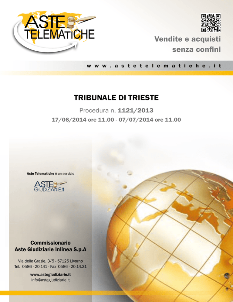 Vendite e acquisti senza confini w w w . a s t e t e l e m a t i c h e . i t TRIBUNALE DI TRIESTE Procedura n. 1121/2013 17/06/2014 ore 11.00 - 07/07/2014 ore 11.00 Aste Telematiche è un servizio Commissionario Aste Giudiziarie Inlinea S.p.A Via delle Grazie, 3/5 - 57125 Livorno Tel. 0586 - 20.141 - Fax 0586 - 20.14.31 www.astegiudiziarie.it [email protected] TRIBUNALE DI TRIESTE - Procedura n. 1121/2013 TRIBUNALE DI TRIESTE - Esecuzione Mobiliare 1121/2013 Asta Telematica INIZIO GARA: 17/06/2014 ore 11.00 MODALITà DI PARTECIPAZIONE TERMINE GARA: 07/07/2014 ore 11.00 Il Commissionario invita gli interessati a formulare la propria offerta di acquisto tramite l’area riservata del sito www.astetelematiche. it previa registrazione gratuita allo stesso. L’offerta è libera e si intende compresiva dell’Iva e dei diritti d’asta, salvo diversa ed espressa indicazione dell’offerente. L’eventuale comunicazione di avvenuta aggiudicazione, contenente la richiesta di versamento del prezzo offerto, sarà effettuata dal Commissionario all’indirizzo di posta elettronica comunicato dall’offerente in sede di registrazione al servizio. La consegna del bene sarà effettuata dal Commissionario presso i locali di Custodia, o presso altro luogo che verrà successivamente comunicato, previo versamento del prezzo offerto. Eventuali diritti e/o oneri fiscali connessi alla vendita del bene ed al suo pieno utilizzo sono ad esclusivo carico dell’aggiudicatario. LOTTO 1 Audio, Video, Elettronica LOTTO 2 Audio, Video, Elettronica Un B&D kit interfaccia Activekit 1636. Un video B&D 1615. invito a offrire invito a offrire LOTTO 3 Audio, Video, Elettronica LOTTO 4 Audio, Video, Elettronica N.4 kit interfaccia B&D XTRA-TV kit 2031. N.6 coppie tela casse B&D 6037 (€ 35,00 x 6). invito a offrire invito a offrire w w w . a s t e t e l e m a t i c h e . i t Aste Telematiche è un servizio TRIBUNALE DI TRIESTE - Procedura n. 1121/2013 TRIBUNALE DI TRIESTE - Esecuzione Mobiliare 1121/2013 LOTTO 5 Audio, Video, Elettronica LOTTO 6 Audio, Video, Elettronica N.9 coppie tela casse B&D 6036. N.2 prese a muro B&D Z210940. invito a offrire invito a offrire LOTTO 7 Audio, Video, Elettronica LOTTO 8 Audio, Video, Elettronica N.3 prese a muro B&D 8009947 pezzi 6. N.16 pezzi per giunzioni B&D 3132170. invito a offrire invito a offrire LOTTO 9 Audio, Video, Elettronica LOTTO 10 Audio, Video, Elettronica Un cavo AUX B&D 6270222 da1,5 mt. Un cavo “Power” B&D 6270118. invito a offrire invito a offrire w w w . a s t e t e l e m a t i c h e . i t Aste Telematiche è un servizio TRIBUNALE DI TRIESTE - Procedura n. 1121/2013 TRIBUNALE DI TRIESTE - Esecuzione Mobiliare 1121/2013 LOTTO 11 Audio, Video, Elettronica LOTTO 12 Audio, Video, Elettronica N.7 cavi master B&D. Un carrello B&D 4106. invito a offrire invito a offrire LOTTO 13 Audio, Video, Elettronica Un carrello B&D 4110. invito a offrire LOTTO 14 Audio, Video, Elettronica Un carrello B&D 4114. invito a offrire LOTTO 15 Audio, Video, Elettronica LOTTO 16 Audio, Video, Elettronica Un carrello B&D 2051. N.4 supporti per impianti HI FI. invito a offrire invito a offrire FOTO NON DISPONIBILE w w w . a s t e t e l e m a t i c h e . i t Aste Telematiche è un servizio TRIBUNALE DI TRIESTE - Procedura n. 1121/2013 TRIBUNALE DI TRIESTE - Esecuzione Mobiliare 1121/2013 LOTTO 17 Audio, Video, Elettronica LOTTO 18 Audio, Video, Elettronica Uno stand B&D 4108. N.2 antenne amplificate B&D. invito a offrire invito a offrire LOTTO 19 Audio, Video, Elettronica LOTTO 20 Audio, Video, Elettronica Un DVD ONKYO DV SP 800. Una telecamera AETHRA VEGA Pro Vega. invito a offrire invito a offrire LOTTO 21 Audio, Video, Elettronica LOTTO 22 Audio, Video, Elettronica Un flight case 8 unità. N.2 flight case 4 unità. invito a offrire invito a offrire w w w . a s t e t e l e m a t i c h e . i t Aste Telematiche è un servizio TRIBUNALE DI TRIESTE - Procedura n. 1121/2013 TRIBUNALE DI TRIESTE - Esecuzione Mobiliare 1121/2013 LOTTO 23 Audio, Video, Elettronica LOTTO 24 Audio, Video, Elettronica Un decoder I-CAN 111OSH. N.3 casse Boss Freespace. invito a offrire invito a offrire LOTTO 25 Audio, Video, Elettronica LOTTO 26 Audio, Video, Elettronica N.2 casse pannetto Wharfedale WXT04. N.3 macchine fumo Stage Line. invito a offrire invito a offrire LOTTO 27 Audio, Video, Elettronica LOTTO 28 Audio, Video, Elettronica Uno scanner DJ VDP Extreme 250. Un lettore CD Stage Line CD30. invito a offrire invito a offrire w w w . a s t e t e l e m a t i c h e . i t Aste Telematiche è un servizio TRIBUNALE DI TRIESTE - Procedura n. 1121/2013 TRIBUNALE DI TRIESTE - Esecuzione Mobiliare 1121/2013 LOTTO 29 Audio, Video, Elettronica LOTTO 30 Audio, Video, Elettronica Una macchina effetto luce Eurolite pro kaleido II. Un sistema casse Boss AM5. invito a offrire invito a offrire LOTTO 31 Audio, Video, Elettronica LOTTO 32 Audio, Video, Elettronica N.2 kit equalizzazione Bose Adapt CQ. Un tavolino GM per giradischi BCD. invito a offrire invito a offrire LOTTO 33 Audio, Video, Elettronica LOTTO 34 Audio, Video, Elettronica Un convertitore DELTEC PDM1. Una coppia casse B&W 683. invito a offrire invito a offrire w w w . a s t e t e l e m a t i c h e . i t Aste Telematiche è un servizio TRIBUNALE DI TRIESTE - Procedura n. 1121/2013 TRIBUNALE DI TRIESTE - Esecuzione Mobiliare 1121/2013 LOTTO 35 Audio, Video, Elettronica LOTTO 36 Audio, Video, Elettronica Una coppia casse B&W 685. Una coppia casse Indiana Line Diva 655. invito a offrire invito a offrire LOTTO 37 Audio, Video, Elettronica LOTTO 38 Audio, Video, Elettronica Un tavolino Solidsteel 7. Un lettore DVD ARCAM DVD88. invito a offrire invito a offrire LOTTO 39 Audio, Video, Elettronica LOTTO 40 Audio, Video, Elettronica Due supporti surround GM. Un supporto ARCAM surround AVR 200. invito a offrire invito a offrire w w w . a s t e t e l e m a t i c h e . i t Aste Telematiche è un servizio TRIBUNALE DI TRIESTE - Procedura n. 1121/2013 TRIBUNALE DI TRIESTE - Esecu