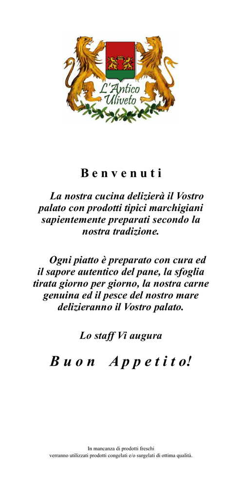 Benvenuti La nostra cucina delizierà il Vostro palato con prodotti tipici marchigiani sapientemente preparati secondo la nostra tradizione. Ogni piatto è preparato con cura ed il sapore autentico del pane, la sfoglia tirata giorno per giorno, la nostra carne genuina ed il pesce del nostro mare delizieranno il Vostro palato. Lo staff Vi augura B u o n A p p e t i t o! In mancanza di prodotti freschi verranno utilizzati prodotti congelati e/o surgelati di ottima qualità. … per iniziare …CARNE Arista al sale con rucola, pinoli e uvetta € 6,00 Bruschette fantasia € 8,00 Caprese €10,00 Crostini misti € 10,00 Crudo e Bufala € 12,00 Crudo e Scamorza € 12,00 Crudo e Frutta € 10,00 Formaggi, miele e marmellate € 12,00 Tagliere di salumi e grana € 12,00 Tavolozza “L’Antico Uliveto” (min. 2 prs.) €14,00 carne di maiale, rucola, pinoli e uvetta salsiccia, funghi, lardo di colonnata, panzanella mozzarella, pomodoro, basilico ▪ ▪ ▪ ▪▪ ▪▪ prosciutto cotto e mozzarella funghi e mozzarella carciofi e mozzarella alici e mozzarella goccia di passata di pomodoro e origano prosciutto crudo, mozzarella di bufala prosciutto crudo, scamorza affumicata alla piastra ▪ prosciutto crudo e melone ▪ prosciutto crudo e kiwi ▪ prosciutto crudo e ananas formaggi morbidi e stagionati, sedano e gorgonzola, miele e marmellate salame con i lardelli, ciauscolo, salame piccante, formaggio grana prosciutto crudo, lonza, ciauscolo, salame con i lardelli, salame piccante, ortaggi sott’olio … per iniziare …PESCE Carrellata di antipasti caldi e freddi € Cocktail di gamberi in salsa rosa €12,00 Fantasia di mare € 14,00 Gratin di molluschi € 11,00 Le ostriche (al pezzo) €2,50 Mare e Monti € Ostriche (al pezzo) €2,50 Salmone affumicato e crostini di pane € 11,00 Salmone marinato alle spezie al profumo di finocchietto € 11,00 Sautè di molluschi € 11,00 gamberi, salsa rosa insalata di seppioline, scampo alla catalana, insalata di polipo e patate, alici marinate, salmone capesante, cozze, cannelli vongole, salsiccia, patate salmone affumicato, pane tostato, burro 25,00 11,00 salmone marinato, finocchio, sedano, spezie cozze, vongole, pomodorini … i carpacci Carpaccio di bresaola € 11,00 Carpaccio di pesce affumicato € 14,00 Carpaccio di verdure € 10,00 Carpaccio di vitello € 12,00 Tartare di vitello € 14,00 € 7,00 € 7,00 € 7,00 ▪ rucola, formaggio grana e pachino ▪ rucola e ananas ▪ rucola, formaggio grana e carciofi ▪ spada agli agrumi ▪ tonno pere e melograno ▪ salmone ai quattro pepi ▪ funghi champignon e sedano ▪ zucchine, formaggio grana e pomodori secchi ▪ carote e pompelmo ▪ vitello, rucola, formaggio grana e pomodorini pachino ▪ Vitello, radicchio, pere e noci ▪ Vitello, rucola, funghi e formaggio grana carne di vitello, senape semipiccante, salsa Worcester, cipolla … le zuppe Crema di carote carote, pomodoro Minestrone di verdure zucchine, carote, patate, piselli, sedano, biete, fagioli Vellutata di patate e zucchine patate, zucchine, pane tostato … i primi ...di CARNE Chitarrine al cinghiale € 10,00 Crepes al coniglio e crema di formaggi € 12,00 Fettuccine alla papera € 10,00 Gnocchi spinaci e gorgonzola € 12,00 Ravioli saltati in padella con zucchine, speck e scamorza € 12,00 Strozzapreti ai carciofi e pancetta croccante € 10,00 Tagliatelle al sugo de nà orda € 10,00 Vincisgrassi € 12,00 pasta all’uovo, ragù bianco di carne di cinghiale uova, sugo bianco di coniglio, formaggio, erbe di campo pasta all’uovo, papera pasta di patate, spinaci, formaggio gorgonzola, panna pasta all’uovo con ripieno di ricotta e spinaci, speck, zucchine e scamorza pasta di acqua e farina, carciofi, panna e pancetta croccante pasta all’uovo, carne mista e macinato di manzo pasta all’uovo, carne di manzo, besciamella … i primi ...di PESCE Chitarrine allo scoglio € 12,00 Gnocchetti zucchine e gamberetti € 12,00 Linguine al pesto di pistacchio e vongole € 12,00 Mezzemaniche tonno fresco e olive € 12,00 Paccheri agli asparagi di mare e gamberetti € 12,00 Ravioli alla marinara € 14,00 Spaghetti alle vongole € 12,00 Tagliatelle agli scampi € 14,00 pasta all’uovo, molluschi, crostacei, calamari e pomodorini pachino pasta di patate, zucchine e gamberetti pasta secca, pistacchio e vongole pasta all’uovo, tonno fresco e olive pasta secca “paccheri”, asparagi di mare e gamberetti ravioli con ripieno di pesce (calamari, molluschi, crostacei, seppie, persico, e gallinella) pasta secca, vongole pasta all’uovo, scampi e pomodorini pachino … carne alla brace Arrosticini di castrato (pz. 12) €14,00 Bistecca e costarelle di maiale € 14,00 Braciole e costine di agnello € 16,00 Fegato all’alloro € 12,00 Filetto alla “Giulio Cesare” (cottura al sangue) €18,00 Fiorentina (all’etto) €5,00 Galletto €14,00 Grigliata mista € Lombata (all’etto) €4,00 Spiedini (n. 4 pezzi) €12,00 Spiedone (min. 2 prs cottura al sangue) €20,00 salsiccia, costarelle di maiale, puntina di vitello, agnello, arrosticino di castrato, pancetta salsiccia, tacchino ,verdure filetto di vitello, tacchino, salsiccia, peperoni 16,00 … ancora carne e... non solo Filetto di vitello € 20,00 Gran fritto di carne € 18,00 Parmigiana di melanzane € 10,00 Scaloppa di vitello € 12,00 Tagliata di pollo € 10,00 ▪ ai fiocchi di sale e rosmarino ▪ al pepe verde ▪ al vino rosso vitello, agnello, pollo, maiale, olive ripiene, cremini, carciofi, patate melanzane, formaggio, pomodoro e basilico ▪ ▪ ▪ ▪ ▪ ▪ ▪ ▪ al limone al vino bianco ai funghi alle verdure di stagione con rucola, grana e pomodorini all’aceto balsamico con rucola, funghi e pomodorini con rucola, grana e carciofi ... i secondi di pesce Frittura di pesce € 16,00 Grigliata di pesce € 18,00 Gallinella in potacchio € 16,00 Rombo al forno (all’etto) €5,00 Scampi al vino (n. 4 pezzi) €18,00 Spigola al ca