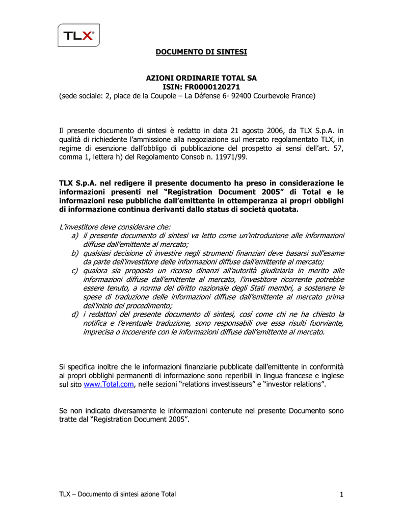 DOCUMENTO DI SINTESI AZIONI ORDINARIE TOTAL SA ISIN: FR0000120271 (sede sociale: 2, place de la Coupole – La Défense 6- 92400 Courbevole France) Il presente documento di sintesi è redatto in data 21 agosto 2006, da TLX S.p.A. in qualità di richiedente l’ammissione alla negoziazione sul mercato regolamentato TLX, in regime di esenzione dall’obbligo di pubblicazione del prospetto ai sensi dell’art. 57, comma 1, lettera h) del Regolamento Consob n. 11971/99. TLX S.p.A. nel redigere il presente documento ha preso in considerazione le informazioni presenti nel “Registration Document 2005” di Total e le informazioni rese pubbliche dall’emittente in ottemperanza ai propri obblighi di informazione continua derivanti dallo status di società quotata. L’investitore deve considerare che: a) il presente documento di sintesi va letto come un'introduzione alle informazioni diffuse dall’emittente al mercato; b) qualsiasi decisione di investire negli strumenti finanziari deve basarsi sull'esame da parte dell'investitore delle informazioni diffuse dall’emittente al mercato; c) qualora sia proposto un ricorso dinanzi all'autorità giudiziaria in merito alle informazioni diffuse dall’emittente al mercato, l'investitore ricorrente potrebbe essere tenuto, a norma del diritto nazionale degli Stati membri, a sostenere le spese di traduzione delle informazioni diffuse dall’emittente al mercato prima dell'inizio del procedimento; d) i redattori del presente documento di sintesi, così come chi ne ha chiesto la notifica e l’eventuale traduzione, sono responsabili ove essa risulti fuorviante, imprecisa o incoerente con le informazioni diffuse dall’emittente al mercato. Si specifica inoltre che le informazioni finanziarie pubblicate dall’emittente in conformità ai propri obblighi permanenti di informazione sono reperibili in lingua francese e inglese sul sito www.Total.com, nelle sezioni “relations investisseurs” e “investor relations”. Se non indicato diversamente le informazioni contenute nel presente Documento sono tratte dal “Registration Document 2005”. TLX – Documento di sintesi azione Total 1 A) Ultimi documenti pubblicati dall’Emittente utilizzati per la redazione del presente Documento Documento Annual Report 2005 (Bilancio d’Esercizio 2005) Registration Document 2005 1st Quarter 2006 (Relazione trimestrale 1° trimestre 2006) 2nd Quarter & 1st Half 2006 (Relazione trimestrale e semestrale, 2° trimestre e 1° semestre 2006) Data 15.02.2006 31.03.2006 04.05.2006 03.08.2006 B) Informazioni sulla società Total S.A. con le sue controllate ed affiliate è la quarta società quotata al mondo nel settore integrato oil e gas. Total opera in più di 130 Paesi, coprendo tutti i campi dell’industria petrolifera, con attività upstream (esplorazione oil e gas, sviluppo e produzione, che costituiscono circa il 15% del fatturato nel 2005) e attività downstream (raffinazione, marketing ed il commercio e trasporto di petrolio greggio e prodotti petroliferi, che costituiscono circa il 70% del fatturato nel 2005). Total produce anche base chemicals (petrolchimici e fertilizzanti), clorochimici, polimeri (con la Arkema, dall’ottobre 2004) e chimici specifici per il mercato industriale e del consumo. Total infine ha interessi nei settori dell’estrazione del carbone e della generazione di energia elettrica, e una partecipazione nel gruppo farmaceutico Sanofi-Aventis. Total ha iniziato le sue attività upstream nel Medio Oriente nel 1924. La Società oggi detiene il 95% del capitale di Elf e, dal 2002, il 100% del capitale di Petrofina. Il Gruppo opera con la denominazione sociale Total dal 6 maggio 2003. TLX – Documento di sintesi azione Total 2 C) Informazioni chiave Capitale sociale Capitale sociale al 31.12.2005: 6.151.162.960 euro composto da 615.116.296 azioni da 10 euro ciascuna. (Dati precedenti al frazionamento azionario di 4 a 1 (stock split) effettivo dal 18 maggio 2006). Informazioni finanziarie selezionate Total equity (in milioni di euro) Rapporto debt / equity Dividend per share (in euro) EPS (earnings per share, in euro) ROE (return on equity) 2005 39.477 32% 6,48 20,91 35% 2004 30.640 31% 5,40 17,99 33% Dati precedenti allo stock split del 18 maggio 2006. Si veda il paragrafo G) Informazioni finanziarie. Mercati di quotazione Le azioni della Total sono quotate su Euronext Paris. La capitalizzazione di mercato al 31.12.2005 è pari a 130,5 miliardi di euro. Indici che includono le azioni Total Indici CAC 40 DJ Euro Stoxx 50 DJ Stoxx 50 DJ Global Titans Peso di Total al 31.12.2005 13,9% 6,7% 1% 2,3% Posizione di Total nell’indice 1° 1° 4° 16° Politica dei dividendi Dati storici in euro, a seguito dello stock split effettivo dal 18 maggio 2006: 2005 2004 2003 2002 2001 Dividendo per azione 1,62 1,35 1,175 1,025 0,95 TLX – Documento di sintesi azione Total 2000 0,825 3 Rating di Total SA (aggiornato al 21.08.2006) Moody’s S&P Fitch Long term Aa1 AA AA Short Term P1 A-1+ F1+ Outlook Stable Stable Positive Scala dei valori Long Term: Il valore del rating assegnato dalle agenzie Moody’s, S&P e Fitch esprime un giudizio in merito alla probabilità che l’emittente diventi insolvente e non sia quindi in grado di onorare gli impegni di pagamento. TLX – Documento di sintesi azione Total 4 Fattori di Rischio comportanti effetti negativi sulla situazione economicopatrimoniale e finanziaria di Total SA Fattori di rischio generici e specifici del titolo azionario In generale l’investimento in un titolo azionario espone l’investitore ai seguenti due rischi: rischio generico (o sistematico) e rischio specifico Il rischio generico rappresenta quella parte di variabilità del prezzo di ciascun titolo che dipende dalle fluttuazioni del mercato e non può essere eliminato per il tramite della diversificazione. Il rischio sistematico per i titoli di capitale racchiude tra l’altro fattori quali la politica economica di un governo, l’inflazione, la s