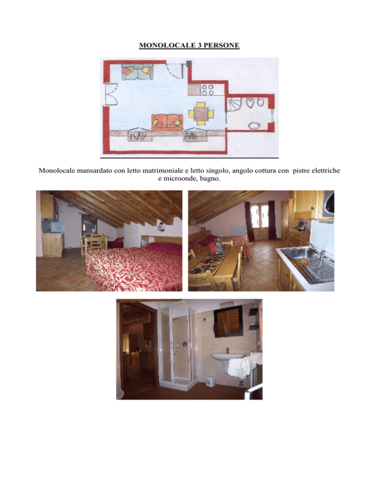 MOOLOCALE 3 PERSOE Monolocale mansardato con letto matrimoniale e letto singolo, angolo cottura con pistre elettriche e microonde, bagno.