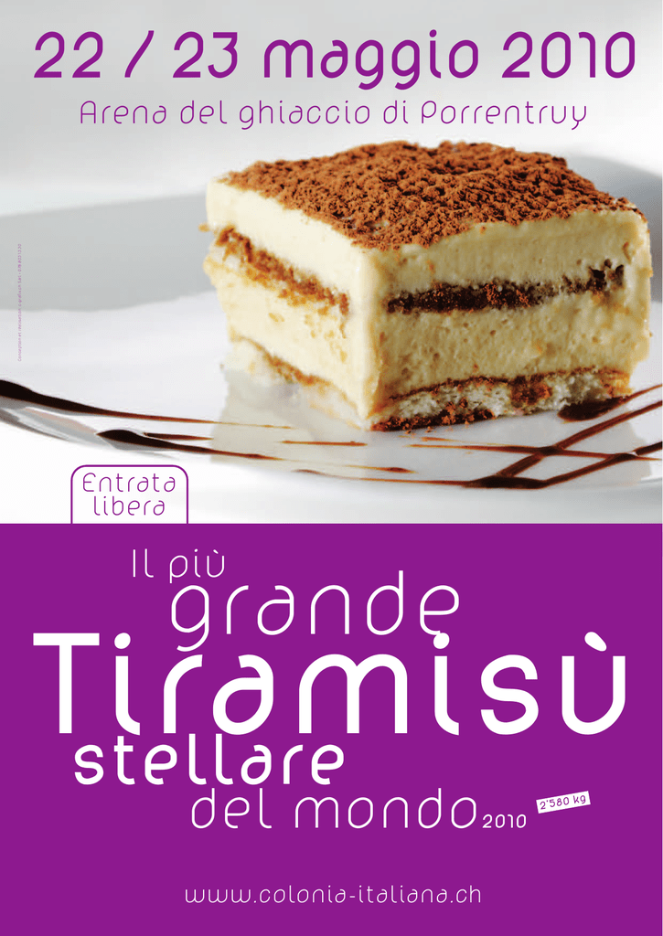 22 / 23 maggio 2010 Conception et réalisation: c-grafix.ch Sàrl • 078 803 13 30 Arena del ghiaccio di Porrentruy Entrata libera Il più grande Tiramisù stellare del mondo 2010 www.colonia-italiana.ch 2’580 k g Un nuovo record STELLARE... 782,4 Kg, era il record che è stato stabilito in Iadarola Presidente, Franco Mancini, Nicola Mau- occasione della prima edizione del mese di giu- rizio, Claude Noirjean, e Bertrand Voisard, hanno gno 2007, nell’Arena del ghiaccio di Porrentruy. deciso di rilanciare la sfida, con un budget di qua- L’animosità e l’emozione di leggere sul celebre si 60.000.- chf., speriamo di attirare ancora una «GuinessWorld Records» l’opera realizzata da un volta i mass media sulla nostra manifestazione. gruppo di persone tenaci, orgogliose, fiere di far La forma, come pure la struttura sono pronti, un parte della popolazione italo - giurassiana, finis- Tiramisu’ STELLARE dal peso di circa 2’500 kg cono per essere conosciute dal grande pubblico... sarà a disposizione di tutta la popolazione. Una mondiale, e di far parlare di questo piccolissimo cosa è certa, il lavoro è immenso, la manifesta- angolo di paese, regione, stato. zione per la realizzazione di questo nuovo record A primavera 2009, siamo venuti a conoscenza si svolgerà su’ due giorni, i 22 / 23 maggio 2010 che un piccolo gruppo di persone, in Francia, nell’ Arena del ghiaccio di Porrentruy. C’è la pos- (anche loro amatori di record) hanno deciso di sibilità di ristorarsi è gustare le varie specialità lanciarsi per battere il record, realizzando un tira- durante i due giorni, approfittando del magnifico misu’ di 1’075,92 Kg. Gli avversari diretti, hanno programma di varietà e divertimenti previsti per avuto modo di studiare da vicino il metodo di piccoli e grandi. Per dare un tocco d’eleganza in lavoro dei nostri architetti-pasticcieri della Colo- piu’, il finale sarà dato dall’artista internazionale nia Italiana di Porrentruy, dimostrazione eseguita Franck Bouroullec, di cui abbiamo potuto sco- a Montbéliard, in occasione del Téléthon 2009. prire il talento nelle famose emissioni televisive Tutto cio’ ha lasciato un gusto amarissimo non delle seguenti reti: TSR, TF1, France 2, France 3, solamente ai responsabili della manifestazione, Rai Uno e tante che se lo contendono, tutto cio’ ma a tutta la popolazione italo-giurassiana per promette uno spettacolo eccezzionale. Il Tirami- i metodi utilizzati e poco rispettosi dell’etica su’ terminato, sarà distribuito gratuitamente agli gastronomica (mancanza di igiene, complicità ospedali del Cantone Giura, case di riposo, come con un responsabile del GuinessWorld Records, pure a tutto il pubblico presente alla manifesta- etc. etc.), sono metodi e sistemi che il comitato zione, sarà chiesto un dono altrettanto modesto promotore, sponsors, benevoli non condivide. che sia per poter realizzare il nostro sogno, ver- Decisi a non farsi derubare di un record che gli sare interamente il beneficio per un’opera cari- apparteneva e che vorrebbe riprenderselo, una tativa. nuova squadra riunitasi in un comitato esecutivo Colonia Italiana di Porrentruy & Distretto dal nome «Tiramisu’ 2010» composta da Nicola Comitato d’organizzazione del Tiramisu’ 2010 2 Frank Bouroullec, L’artista che bisogna imperativamente vedere all’opera ! Sabato 22 maggio dalle ore 20.00 in poi... sorpresa sorpresa... Nasce a Tours ( Francia ) nel 1967 da una famiglia clips video per MC Solar, Passi e Saya, Club Med, di artisti designers, di cui uno zio ha creato il logo Alice Donna, l’artista comico Djamel Debbouze, il della famosa compagnia aerea Airbus. Sin dalla suo talento è riconosciuto nei cinque continenti, tenerissima età, ha un senso innato per la matita, nel suo lungo girovagare, ha messo le sue com- spostarsi a Parigi, alle scuole superiori delle arti petenze a disposizione di; Georges Clooney, Sofia grafiche con dei graffiti di nudo ecct ecct. Riesce Loren, Roberto Benigni, Enzo Ferrari, Luciano Pa- infine a diplomarsi presso le scuole Gobelins varotti, Roger Federer, Giorgio Armani, Tony Par- della sezione film e cartoni, il cinema e la musica ker, Michael Schumacher, Beyoncé, Eva Longoria, due altre passioni che daranno a Frank Bourollec Alberto di Monaco e tanti altri ancora , come per l’incredibile orientamento al suo talento. Dopo esempio; Lancôme, Vacheron & Costantin, Lam- Asterix, Obelix realizzerà delle story boards dei borghini, BMW Miniman etc... ...ancora di piu’, come si svolgerà la giornata... Durante la preparazione del Tiramisu’, il pubblico età. Sabato verso le ore 20.00, ci sarà l’omologa- ha la possibilità di seguire i lavori dalla tribuna, zione ufficiale all’attenzione del «GuinessWorld (400 posti seduti) il 22 maggio dalle ore 09.00 Records» sotto la stretta sorveglianza di due per- in poi. C’è la possibilità di ristorarsi, come pure sone espertissime in materia, Notaio Dott. Hubert di approfittare delle diverse specialità culinarie Comment e il Sindaco di Porrentruy Signor Gue- italiane preparate sul posto. I pomeriggi del 22 nat Gérard, ci sarà il controllo sanitario e della / 23 maggio, la scuola del Circo Starlight, sarà qualità del Tiramisu’ che puo’ essere mangiato. lieto di distrarvi con i suoi vasti programmi. Di- Vari concorsi seguiranno, il piu’ grande mangia- versi gruppi di musica presenti nel Cantone Giura tore di Tiramisu’ Juniors e Seniors. La degusta- e al di fuori, faranno la loro parte, con tutte le zione del Tiramisu’ continuerà tutta la serata, sensibilità, epoche e amori passati, senza dimen- come pure la domenica 23 tutta la giornata... Vi ticare il sabato sera, dedicato ad una orchestra auguriamo di passare due giornate fantastiche, di professionisti italiani, con repertori per tutte le indimenticabili insieme a noi. 4 A no dé us ta re ch to er ur et ne r. Possibilités de soutien Vous n’êtes pas sans savoir qu’une telle manifestat
