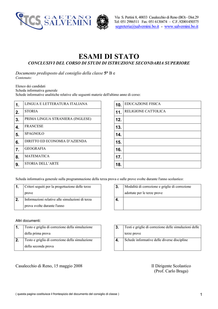 Via S. Pertini 8, 40033 Casalecchio di Reno (BO) - Dist.29 Tel: 051 2986511 Fax: 051 6130474 – C.F..92001450375 [email protected] - www.salvemini.bo.it ESAMI DI STATO CONCLUSIVI DEL CORSO DI STUDI DI ISTRUZIONE SECONDARIA SUPERIORE Documento predisposto dal consiglio della classe 5° B e Contenuto: Elenco dei candidati Scheda informativa generale Schede informative analitiche relative alle seguenti materie dell'ultimo anno di corso: 1. LINGUA E LETTERATURA ITALIANA 10. EDUCAZIONE FISICA 2. STORIA 11. RELIGIONE CATTOLICA 3. PRIMA LINGUA STRANIERA (INGLESE) 12. 4. FRANCESE 13. 5. SPAGNOLO 14. 6. DIRITTO ED ECONOMIA D’AZIENDA 15. 7. GEOGRAFIA 16. 8. MATEMATICA 17. 9. STORIA DELL’ARTE 18. Scheda informativa generale sulla programmazione della terza prova e sulle prove svolte durante l'anno scolastico: 1. Criteri seguiti per la progettazione delle terze 3. prove 2. Informazioni relative alle simulazioni di terza Modalità di correzione e griglie di correzione adottate per le terze prove 4. prova svolte durante l'anno Altri documenti: 1. Testo e griglia di correzione della simulazione 3. della prima prova 2. Testo e griglia di correzione della simulazione Testi e griglie di correzione delle simulazioni delle terze prove 4. Schede informative delle diverse discipline della seconda prova Casalecchio di Reno, 15 maggio 2008 ( questa pagina costituisce il frontespizio del documento del consiglio di classe ) Il Dirigente Scolastico (Prof. Carlo Braga) 1 Elenco dei candidati interni ed esterni Documento del Consiglio di Classe Classe: V B ERICA Anno Scolastico: 2007-08 Numero candidati interni: 11 Cognome e Nome Numero candidati esterni: Provenienza 1. Abbate Carlotta ITC Salvemini 2. Cadar Monica ITC Salvemini 3. Campisi Valentino ITC Salvemini 4. Carroli Federico ITC Salvemini 5. Costa Sara ITC Salvemini 6. Fucarino Francesco ITC Salvemini 7. Ghedini Clizia ITC Salvemini 8. Ghelli Enrica ITC Salvemini 9. Mei Elena ITC Salvemini 10. Menetti Alice ITC Salvemini 11. Visotti Marianna ITC Salvemini 1 Annotazioni 12. 13. 14. 15. 16. 17. 18. 19. 20. 21. 22. 23. 24. 25. 26. 27. 28. 29. 30. 2 Scheda Informativa Generale Documento del Consiglio di Classe 1. Docenti del Consiglio di Classe Docente 1 Materia 2 Classe/i Membro Interno (SI/NO) STANGHELLINI CRISTINA ITALIANO NO TIRIBOCCHI LUCA STORIA NO SBARRA PATRIZIA INGLESE SI RESCA GIULIANA FRANCESE SI PEZZUOLI ALESSANDRA SPAGNOLO SI GUIDI DANIELA DIRITTO ED ECONOMIA SI D’AZIENDA ZACCHERINI LORETTA GEOGRAFIA SI ORLANDINI MARIO MATEMATICA NO PELAGATTI LAURA STORIA DELL’ARTE NO PAJETTI ANDREA EDUCAZIONE FISICA NO MARCHINI CAMILLO RELIGIONE CATTOLICA NO MILANI FRANCESCA CONV. FRANCESE NO VALDIVIA MAYA JIMENA CONV. SPAGNOLO NO 2. Storia della Classe ( situazione iniziale ed evoluzione nel corso del Triennio ) La classe, attualmente composta da undici allievi, è il risultato di una situazione di partenza che vedeva all’inizio del percorso scolastico un numero di ventidue studenti. Alla fine del biennio il giudizio espresso sulla classe risultava abbastanza critico sotto diversi aspetti, tanto nel rendimento scolastico quanto nei rapporti tra alunni e docenti. All’inizio del triennio gli studenti hanno incontrato difficoltà nell’adeguarsi alle richieste del terzo anno Erica e l’impegno serio e rigoroso nello studio si è riscontrato solo in alcuni di loro. Tutto ciò ha comportato un ulteriore ridimensionamento della classe giustificando l’attuale numero. Non va comunque sottaciuto che, dal biennio al triennio e in seguito nel triennio stesso, non vi è sempre stata continuità didattica nella stragrande maggioranza delle discipline, cioè : Italiano, Storia, Geografia, Inglese, Francese, Spagnolo, Economia, Educazione Fisica e Matematica. Relativamente all’ultimo anno di corso, pur rilevando in alcuni casi una frequenza discontinua e una limitata disponibilità all’approfondimento autonomo, il Consiglio di Classe è concorde nel mettere in luce una partecipazione propositiva e attiva ed un atteggiamento sostanzialmente corretto, nonché un deciso miglioramento nei rapporti tra studenti e tra studenti e docenti. I risultati ottenuti sono sicuramente brillanti per alcuni studenti, mentre per altri si rilevano differenze di 3 profitto nelle varie discipline dovute a diverse attitudini e impegno. Diversi studenti della classe hanno partecipato, nel corso del triennio, alle varie attività extra-curricolari offerte dall’istituto: attività di preparazione alla certificazione linguistica, corsi ed esami ECDL, corso di contabilità informatizzata, visite guidate, incontri con esperti, scambi con l’estero, stage ed esperienze di orientamento in uscita, nonché partecipazione e spettacoli teatrali anche in lingua straniera. 3. Attività pluridisciplinari svolte durante l’anno in corso e obiettivi raggiunti Non sono state previste specifiche attività pluridisciplinari nel corso dell’anno. Gli insegnanti hanno comunque sempre tenuto in considerazione il programma dell’ultimo anno nelle diverse discipline, sottolineando o realizzando quando possibile riferimenti e collegamenti anche in considerazione dei percorsi individuali da presentare al colloquio di esame e dello svolgimento del colloquio stesso. Una tematica che è stata trattata sotto diversi aspetti (lingue straniere, arte, economia) è quella relativa al turismo. 4. 5. Attività di recupero svolte durante l’anno in corso e obiettivi raggiunti • Recupero in itinere in tutte le discipline. • Corso di recupero in: inglese (all’inizio dell’anno) • Studio assistito con un corso on-line sul disponibile sul sito della scuola per quanto riguarda l’inglese Attività svolte durante l’anno scolastico nell’area di progetto e obiettivi raggiunti Titolo Il teatro Cenni alle origini del teatro classico Greco: La commedia e la tragedia (Medea) Italiano: Il teatro di Pirandello (Il teatro del grottesco e “Così è se vi pare”; il teatro nel Argomenti trattati e/o teatro “S
