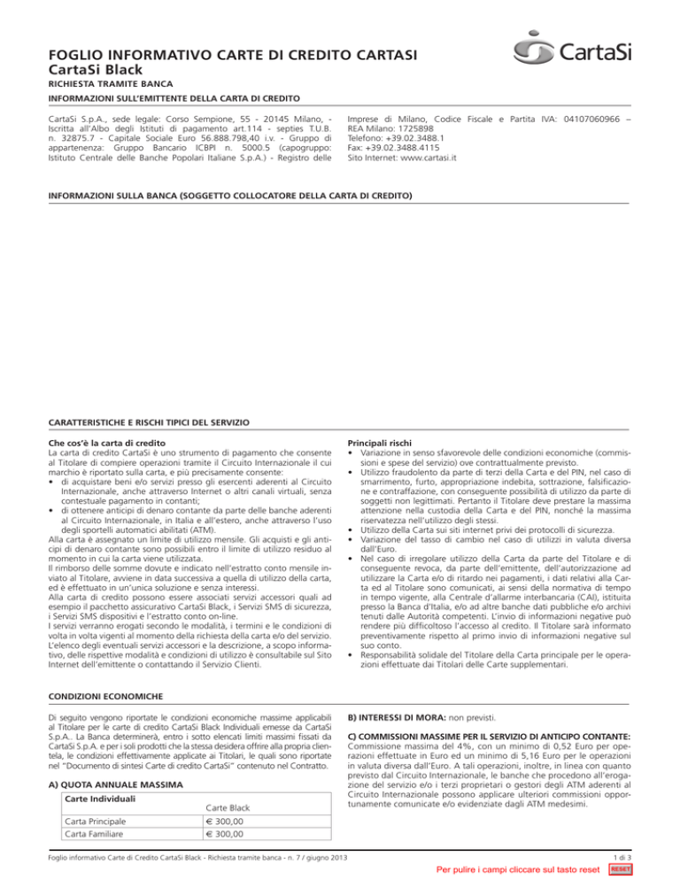 FOGLIO INFORMATIVO CARTE DI CREDITO CARTASI CartaSi Black Richiesta TRAMITE BANCA INFORMAZIONI SULL’EMITTENTE DELLA CARTA DI CREDITO CartaSi S.p.A., sede legale: Corso Sempione, 55 - 20145 Milano, Iscritta all’Albo degli Istituti di pagamento art.114 - septies T.U.B. n. 32875.7 - Capitale Sociale Euro 56.888.798,40 i.v. - Gruppo di appartenenza: Gruppo Bancario ICBPI n. 5000.5 (capogruppo: Istituto Centrale delle Banche Popolari Italiane S.p.A.) - Registro delle Imprese di Milano, Codice Fiscale e Partita IVA: 04107060966 – REA Milano: 1725898 Telefono: +39.02.3488.1 Fax: +39.02.3488.4115 Sito Internet: www.cartasi.it INFORMAZIONI SULLA BANCA (SOGGETTO COLLOCATORE DELLA CARTA DI CREDITO) CARATTERISTICHE E RISCHI TIPICI DEL SERVIZIO Che cos’è la carta di credito La carta di credito CartaSi è uno strumento di pagamento che consente al Titolare di compiere operazioni tramite il Circuito Internazionale il cui marchio è riportato sulla carta, e più precisamente consente: • di acquistare beni e/o servizi presso gli esercenti aderenti al Circuito Internazionale, anche attraverso Internet o altri canali virtuali, senza contestuale pagamento in contanti; • di ottenere anticipi di denaro contante da parte delle banche aderenti al Circuito Internazionale, in Italia e all’estero, anche attraverso l’uso degli sportelli automatici abilitati (ATM). Alla carta è assegnato un limite di utilizzo mensile. Gli acquisti e gli anticipi di denaro contante sono possibili entro il limite di utilizzo residuo al momento in cui la carta viene utilizzata. Il rimborso delle somme dovute e indicato nell’estratto conto mensile inviato al Titolare, avviene in data successiva a quella di utilizzo della carta, ed è effettuato in un’unica soluzione e senza interessi. Alla carta di credito possono essere associati servizi accessori quali ad esempio il pacchetto assicurativo CartaSi Black, i Servizi SMS di sicurezza, i Servizi SMS dispositivi e l’estratto conto on-line. I servizi verranno erogati secondo le modalità, i termini e le condizioni di volta in volta vigenti al momento della richiesta della carta e/o del servizio. L’elenco degli eventuali servizi accessori e la descrizione, a scopo informativo, delle rispettive modalità e condizioni di utilizzo è consultabile sul Sito Internet dell’emittente o contattando il Servizio Clienti. Principali rischi • Variazione in senso sfavorevole delle condizioni economiche (commissioni e spese del servizio) ove contrattualmente previsto. • Utilizzo fraudolento da parte di terzi della Carta e del PIN, nel caso di smarrimento, furto, appropriazione indebita, sottrazione, falsificazione e contraffazione, con conseguente possibilità di utilizzo da parte di soggetti non legittimati. Pertanto il Titolare deve prestare la massima attenzione nella custodia della Carta e del PIN, nonché la massima riservatezza nell’utilizzo degli stessi. • Utilizzo della Carta sui siti internet privi dei protocolli di sicurezza. • Variazione del tasso di cambio nel caso di utilizzi in valuta diversa dall’Euro. • Nel caso di irregolare utilizzo della Carta da parte del Titolare e di conseguente revoca, da parte dell’emittente, dell’autorizzazione ad utilizzare la Carta e/o di ritardo nei pagamenti, i dati relativi alla Carta ed al Titolare sono comunicati, ai sensi della normativa di tempo in tempo vigente, alla Centrale d’allarme interbancaria (CAI), istituita presso la Banca d’Italia, e/o ad altre banche dati pubbliche e/o archivi tenuti dalle Autorità competenti. L’invio di informazioni negative può rendere più difficoltoso l’accesso al credito. Il Titolare sarà informato preventivamente rispetto al primo invio di informazioni negative sul suo conto. • Responsabilità solidale del Titolare della Carta principale per le operazioni effettuate dai Titolari delle Carte supplementari. CONDIZIONI ECONOMICHE Di seguito vengono riportate le condizioni economiche massime applicabili al Titolare per le carte di credito CartaSi Black Individuali emesse da CartaSi S.p.A.. La Banca determinerà, entro i sotto elencati limiti massimi fissati da CartaSi S.p.A. e per i soli prodotti che la stessa desidera offrire alla propria clientela, le condizioni effettivamente applicate ai Titolari, le quali sono riportate nel “Documento di sintesi Carte di credito CartaSi” contenuto nel Contratto. A) QUOTA ANNUALE MASSIMA Carte Individuali Carta Principale Carta Familiare Carte Black B) INTERESSI DI MORA: non previsti. C) COMMISSIONI MASSIME PER IL SERVIZIO DI ANTICIPO CONTANTE: Commissione massima del 4%, con un minimo di 0,52 Euro per operazioni effettuate in Euro ed un minimo di 5,16 Euro per le operazioni in valuta diversa dall’Euro. A tali operazioni, inoltre, in linea con quanto previsto dal Circuito Internazionale, le banche che procedono all’erogazione del servizio e/o i terzi proprietari o gestori degli ATM aderenti al Circuito Internazionale possono applicare ulteriori commissioni opportunamente comunicate e/o evidenziate dagli ATM medesimi. € 300,00 € 300,00 Foglio informativo Carte di Credito CartaSi Black - Richiesta tramite banca - n. 7 / giugno 2013 1 di 3 Per pulire i campi cliccare sul tasto reset RESET FOGLIO INFORMATIVO CARTE DI CREDITO CARTASI CartaSi Black Richiesta TRAMITE BANCA D) GIORNI DI VALUTA PER L’ADDEBITO SU CONTO CORRENTE BANCARIO: 15 giorni di valuta per l’addebito su conto corrente bancario dalla data dell’estratto conto (se il giorno di addebito cade di domenica o in un giorno festivo, la valuta è posticipata al primo giorno feriale successivo). E) ESTRATTI CONTO: • Costi di emissione e di invio: - estratto conto on-line (attivabile tramite iscrizione al Portale Titolari sul sito www.black.cartasi.it): gratuito - estratto conto cartaceo: gratuito • Imposta governativa di bollo su estratti conto superiori a 77,47 Euro: 2,00 Euro F) TASSO DI CAMBIO SULLE OPERAZIONI IN VALUTA DIVERSA DALL’EURO: Tasso determinat