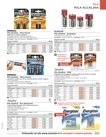 PILA PILA ALCALINA AA (LR6) Pila alcalina - Plus Power Lotto di 4 pezzi 4 pezzi 2 pezzi 2 pezzi 1 pezzo A107270 A107262 A107263 A107264 A107265 9 (LR61) ï Pila alcalina per uso generale. Per modello : Apparecchio elettronico - Tecnologia : Alcalina Per modello : Apparecchio elettronico - Tecnologia : Alcalina Il lotto Tipo di batteria Tensione AAA (LR03) 1,5 V AA (LR06) 1,5 V C (LR14) 1,5 V D (LR20) 1,5 V 9 V (LR61) 9V Consegna in 4 giorni D (LR20) Pila alcalina - Ecologica Ideale per un utilizzo quotidiano ï Pila alcalina ad alto rendimento energetico. ï Affidabile e durevole, anche alle basse temperature. Sconto per quantit‡ C (LR14) Sconto per quantit‡ - - 10 % 1-4 5+ € 3,50 € 3,65 € 3,50 € 3,39 € 3,50 € 3,15 € 3,29 € 3,15 € 3,05 € 3,15 Il lotto Tipo di batteria Tensione AAA (LR03) 1,5 V AA (LR06) 1,5 V C (LR14) 1,5 V D (LR20) 1,5 V 9 V (LR61) 9V Consegna in 4 giorni Lotto di 4 pezzi 4 pezzi 2 pezzi 2 pezzi 1 pezzo A021707 A021708 A021709 A021710 A021711 - - 10 % 1-4 5+ € 3,15 € 3,15 € 3,05 € 3,05 € 3,05 € 2,84 € 2,84 € 2,75 € 2,75 € 2,75 Scegliete la prima pila senza mercurio al mondo! MAX AAA (LR03 FSB4) MAX 9 V Pila alcalina - MAX Progettata per proteggere le apparecchiature dal rischio di colature. ï Gamma di pile alcaline MAX a lunga durata. ï Durata utile fino a 10 anni. ï Protezione dalle perdite fino a 2 anni dopo l'uso completo. ï Priva di mercurio. Pila alcalina - Ultra Power Consente di veriˇcare la carica rimanente grazie al tester integrato. ï Pila di alta qualit‡ ï Prestazioni ottimali in tutti gli apparecchi. Per modello : Apparecchio elettronico - Tecnologia : Alcaline Sconto per quantit‡ Per modello : Apparecchio elettronico - Tecnologia : Alcalina Sconto per quantit‡ Il lotto Tipo di batteria Tensione AA (LR06) 1,5 V D (LR20) 1,5 V AAA (LR03) 1,5 V C (LR14) 1,5 V 9 V (LR61) 9V Consegna in 4 giorni Lotto di 4 pezzi 2 pezzi 4 pezzi 2 pezzi 1 pezzo A107261 A107267 A107271 A107272 A107273 - - 10 % 1-4 5+ € 4,25 € 4,19 € 4,25 € 3,95 € 3,95 € 3,83 € 3,77 € 3,83 € 3,56 € 3,56 Tipo di batteria Tensione AA (LR6) 1,5 V AAA (LR03) 1,5 V AA (LR6) 1,5 V AAA (LR03) 1,5 V C (LR14) 1,5 V D (LR20) 1,5 V 4,5 V (LR12) 4,5 V 9 V (LR61) 9V Consegna in 4 giorni Lotto di 8 pezzi 8 pezzi 4 pezzi 4 pezzi 2 pezzi 2 pezzi 1 pezzo 1 pezzo A128951 A128955 A128952 A128957 A128953 A128956 A128958 A128954 - - 10 % 1-4 5+ € 6,50 € 6,50 € 3,25 € 3,25 € 3,35 € 3,35 € 3,35 € 3,35 € 5,85 € 5,85 € 2,93 € 2,93 € 3,02 € 3,02 € 3,02 € 3,02 Scegliete una tecnologia ecologica e dalle massime prestazioni! Pila alcalina - …co Advanced La pila alcalina Energizer dalle migliori prestazioni ï Grande durata della pila. ï Ecologica e dalle grandi prestazioni. ï Pila prodotta da pile riciclate. ï Non ricaricabile. Per modello : Apparecchio elettronico - Tecnologia : Alcaline P16-13109-AA Sconto per quantit‡ Tipo di batteria Tensione AA (LR6) 1,5 AAA (LR03) 1,5 AA (LR6) 1,5 V AAA (LR03) 1,5 C (LR14) 1,5 D (LR20) 1,5 9 V (LR61) 9V Consegna in 4 giorni Lotto di 8 pezzi 8 pezzi 4 pezzi 4 pezzi 2 pezzi 2 pezzi 1 pezzo A128959 A128963 A128960 A128961 A128965 A128964 A128962 - - 10 % 1-4 5+ € 8,95 € 7,00 € 3,50 € 3,50 € 3,50 € 3,50 € 3,50 € 8,05 € 6,30 € 3,15 € 3,15 € 3,15 € 3,15 € 3,15 827