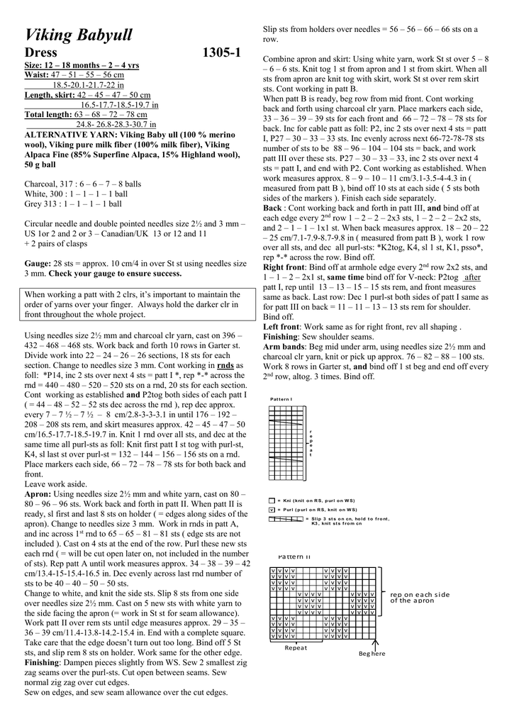 Slip sts from holders over needles = 56 – 56 – 66 – 66 sts on a row. Viking Babyull Dress 1305-1 Size: 12 – 18 months – 2 – 4 yrs Waist: 47 – 51 – 55 – 56 cm 18.5-20.1-21.7-22 in Length, skirt: 42 – 45 – 47 – 50 cm 16.5-17.7-18.5-19.7 in Total length: 63 – 68 – 72 – 78 cm 24.8- 26.8-28.3-30.7 in ALTERNATIVE YARN: Viking Baby ull (100 % merino wool), Viking pure milk fiber (100% milk fiber), Viking Alpaca Fine (85% Superfine Alpaca, 15% Highland wool), 50 g ball Charcoal, 317 : 6 – 6 – 7 – 8 balls White, 300 : 1 – 1 – 1 – 1 ball Grey 313 : 1 – 1 – 1 – 1 ball Circular needle and double pointed needles size 2½ and 3 mm – US 1or 2 and 2 or 3 – Canadian/UK 13 or 12 and 11 + 2 pairs of clasps Gauge: 28 sts = approx. 10 cm/4 in over St st using needles size 3 mm. Check your gauge to ensure success. When working a patt with 2 clrs, it’s important to maintain the order of yarns over your finger. Always hold the darker clr in front throughout the whole project. Using needles size 2½ mm and charcoal clr yarn, cast on 396 – 432 – 468 – 468 sts. Work back and forth 10 rows in Garter st. Divide work into 22 – 24 – 26 – 26 sections, 18 sts for each section. Change to needles size 3 mm. Cont working in rnds as foll: *P14, inc 2 sts over next 4 sts = patt I *, rep *-* across the rnd = 440 – 480 – 520 – 520 sts on a rnd, 20 sts for each section. Cont working as established and P2tog both sides of each patt I ( = 44 – 48 – 52 – 52 sts dec across the rnd ), rep dec approx. every 7 – 7 ½ – 7 ½ – 8 cm/2.8-3-3-3.1 in until 176 – 192 – 208 – 208 sts rem, and skirt measures approx. 42 – 45 – 47 – 50 cm/16.5-17.7-18.5-19.7 in. Knit 1 rnd over all sts, and dec at the same time all purl-sts as foll: Knit first patt I st tog with purl-st, K4, sl last st over purl-st = 132 – 144 – 156 – 156 sts on a rnd. Place markers each side, 66 – 72 – 78 – 78 sts for both back and front. Leave work aside. Apron: Using needles size 2½ mm and white yarn, cast on 80 – 80 – 96 – 96 sts. Work back and forth in patt II. When patt II is ready, sl first and last 8 sts on holder ( = edges along sides of the apron). Change to needles size 3 mm. Work in rnds in patt A, and inc across 1st rnd to 65 – 65 – 81 – 81 sts ( edge sts are not included ). Cast on 4 sts at the end of the row. Purl these new sts each rnd ( = will be cut open later on, not included in the number of sts). Rep patt A until work measures approx. 34 – 38 – 39 – 42 cm/13.4-15-15.4-16.5 in. Dec evenly across last rnd number of sts to be 40 – 40 – 50 – 50 sts. Change to white, and knit the side sts. Slip 8 sts from one side over needles size 2½ mm. Cast on 5 new sts with white yarn to the side facing the apron (= work in St st for seam allowance). Work patt II over rem sts until edge measures approx. 29 – 35 – 36 – 39 cm/11.4-13.8-14.2-15.4 in. End with a complete square. Take care that the edge doesn’t turn out too long. Bind off 5 St sts, and slip rem 8 sts on holder. Work same for the other edge. Finishing: Dampen pieces slightly from WS. Sew 2 smallest zig zag seams over the purl-sts. Cut open between seams. Sew normal zig zag over cut edges. Sew on edges, and sew seam allowance over the cut edges. Combine apron and skirt: Using white yarn, work St st over 5 – 8 – 6 – 6 sts. Knit tog 1 st from apron and 1 st from skirt. When all sts from apron are knit tog with skirt, work St st over rem skirt sts. Cont working in patt B. When patt B is ready, beg row from mid front. Cont working back and forth using charcoal clr yarn. Place markers each side, 33 – 36 – 39 – 39 sts for each front and 66 – 72 – 78 – 78 sts for back. Inc for cable patt as foll: P2, inc 2 sts over next 4 sts = patt I, P27 – 30 – 33 – 33 sts. Inc evenly across next 66-72-78-78 sts number of sts to be 88 – 96 – 104 – 104 sts = back, and work patt III over these sts. P27 – 30 – 33 – 33, inc 2 sts over next 4 sts = patt I, and end with P2. Cont working as established. When work measures approx. 8 – 9 – 10 – 11 cm/3.1-3.5-4-4.3 in ( measured from patt B ), bind off 10 sts at each side ( 5 sts both sides of the markers ). Finish each side separately. Back : Cont working back and forth in patt III, and bind off at each edge every 2nd row 1 – 2 – 2 – 2x3 sts, 1 – 2 – 2 – 2x2 sts, and 2 – 1 – 1 – 1x1 st. When back measures approx. 18 – 20 – 22 – 25 cm/7.1-7.9-8.7-9.8 in ( measured from patt B ), work 1 row over all sts, and dec all purl-sts: *K2tog, K4, sl 1 st, K1, psso*, rep *-* across the row. Bind off. Right front: Bind off at armhole edge every 2nd row 2x2 sts, and 1 – 1 – 2 – 2x1 st, same time bind off for V-neck: P2tog after patt I, rep until 13 – 13 – 15 – 15 sts rem, and front measures same as back. Last row: Dec 1 purl-st both sides of patt I same as for patt III on back = 11 – 11 – 13 – 13 sts rem for shoulder. Bind off. Left front: Work same as for right front, rev all shaping . Finishing: Sew shoulder seams. Arm bands: Beg mid under arm, using needles size 2½ mm and charcoal clr yarn, knit or pick up approx. 76 – 82 – 88 – 100 sts. Work 8 rows in Garter st, and bind off 1 st beg and end off every 2nd row, altog. 3 times. Bind off. Pat t er n I r e p e a t = Kni ( kni t o n R S, p ur l o n W S) v = Pur l ( p ur l o n R S, kni t o n W S) = Sl i p 3 st s o n cn, ho l d t o f r o nt , K3 , kni t st s f r o m cn Pa ttern II v v v v v v v v v v v v v v v v v v v v v v v v v v v v v v v v v v v v v v v v Repeat v v v v v v v v v v v v v v v v v v v v v v v v v v v v v v v v v v v v v v v v v v v v v v v v v v v v v v v v Beg here rep on ea ch s i de of the a pron Pat t er n I I I v v v v v v v v v v v v v v v v v v v v v v v v v v v v v v v v v v v v v v v v v v v v v v v v v v v v v v v v v v v v v v v v r e p e a t R ep eat Pattern A r e p e a t Repeat Beg here Pattern B Repea
