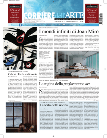 Corriere7__ 29/03/12 15:51 Pagina 1 L’arte di vendere l’arte autentica Corso Tassoni, 56 - Torino Tel. 011 4377770 www. santagostinoaste.it [email protected] P e R I o D I C o D I C U L T U R a e I n F o R M a z I o n e Fondato da Carlo accossato nel 1994 L’arte di vendere l’arte autentica CORRIEREdell’ARTE Direzione e Redazione: P.za Zara, 3 - 10133 Torino. Tel. 011 6312666 - Fax 011 6317243 - Cell. 377 4648901 E-Mail: [email protected] - www.corrieredellarte.it Art. 2 Comma 2 Legge 662/96 - Pubblicità inferiore al 45% Spedizione in abbonamento postale anno XvIII - n° 7 - venerdì 6 aprile 2012 COURRIER DES € 2,50 ARTS Corso Tassoni, 56 - Torino Tel. 011 4377770 www. santagostinoaste.it [email protected] I mondi infiniti di Joan Miró Il Corriere dell’Arte è on-line e su facebook con oltre 5000 contatti da tutto il mondo Chiostro del Bramante, Roma È FaBRIzIo FLoRIan un Miró intensamente sperimentale e manierista, e a tratti crepuscolare e malinconico, quello che si può ammirare nella splendida mostra, dal titolo Miró! Poesia e luce (a cura di Maria Luisa Lax Cacho), allestita nel Chiostro del Bramante e prodotta e Joan Miró, “Oiseaux”, 1973, Fundació Pilar i Joan Miró, Mallorca, © Successió Miró by SIAE 2012 foto © Joan Ramón Bonet & David Bonet courtesy Archivo Fundació Pilar i Joan Miró a Mallorca Caboni oltre la malinconia Alla Galleria Davico – Torino I e LIsa PaRMesanI n mostra fino al 10 maggio presso la Galleria Davico una selezione di 35 opere di Leonardo Caboni, pittore romano. Le pennellate stese con mano colta e precisa, che il gallerista emilio Gargioni definisce “esteticamente maniacale, tanto sono realisticamente perfette”, disegnano un mondo che pare senza tempo, sospeso tra il reale e l’onirico. si tratta probabilmente di una reminescenza Leonardo Caboni, “Il sogno del Principe di Montenevoso” delle fascinazioni giovanili per De Chirico e arnold Böcklin, sviluppate da Caboni attraverso una squisita maturità tecnica, che incanta lo spettatore nell’illusione bidimensionale. Una luce surreale caratterizza le sue opere, come in Natura morta con Napoleone e carillon, sormontato dall’effigie di un piccolo dodo, dove le ombre sembrano allungare la permanenza dei personaggi che a testa alta guardano l’orizzonte del proprio declino. I soggetti dipinti svelano una passione segue a pag. 2 quando l’artista catalano decide di stabilirsi a Palma di Mallorca nel nuovo studio progettato dall’amico architetto Josep Lluís sert, e conclusasi con la morte nel 1983. Immerso in un paesaggio mediterraneo fatto di luce, cielo, terra e mare, Miró ripensa radicalmente la propria arte incrociando i furori iconoclasti del dadaismo con nuovi stimoli provenienti dalle ricerce più avanzate dell’arte contemporanea e spingendo la propria iconografia ai limiti dell’astrazione e dell’essenzialità. a partire dagli anni sessanta, l’artista abbandona progressivamente il cavalletto in favore di una «fisicità» pittorica fatta di azioni dirette sulla te- la: Miró dipinge a terra, cammina sulle proprie tele, vi si stende sopra producendo spruzzi e gocciolamenti come nel Senza titolo del 1966, dove si combinano olio, acrilico e carboncino nero con segni di colore rosso e blu. ancora più stupefacenti i paesaggi monocromi degli anni segue a pag. 2 Marina Abramović - AM- Fabrizio Vatieri organizzata da arthemisia Group, 24 ore Cultura – Gruppo 24 ore, DaRT Chiostro del Bramante, in collaborazione con Fundació Pilar i Joan Miró e con il patrocinio dell’ambasciata di spagna. Un’ottantina di opere, di cui 50 olii di grande formato, terrecotte, bronzi e acquerelli, appartenenti all’ultima stagione creativa iniziatasi nel 1956, La regina della performance art Tutto su Marina Abramović al Pac di Milano n Rosa CaRnevaLe el 1974 una giovanissima artista serba si presentava al pubblico della galleria milanese Diagramma con una performance dal titolo Rhythm 4. sola e nuda in una stanza della galleria, veniva ripresa da una telecamera che trasmetteva le immagini in un’altra stanza dello spazio espositivo, dove il pubblico assisteva in diretta. L’artista accostava il volto ad un ventilatore molto potente riempendosi i polmoni d’aria fino allo svenimento. La giovane performer si chiamava Marina abramović. erano i primi passi di una carriera che sarebbe esplosa in pochi anni, facendo dell’artista una delle voci più La torta della nonna La GAM di Torino ai tempi della krísis aDRIano oLIvIeRI se dovessimo attribuire un’identità fisica alla crisi, in ogni sua forma e intensità, la più consona sarebbe forse quella del popolo italiano anche quando, proprio nei momenti più bui, i nostri connazionali si rendono protagonisti di brillanti quanto imprevedibili risorgimenti. L’etimologia greca e latina del termine “crisi” non lascia scampo tuttavia: criterio, discernimento e distinzione sono i concetti che risiedono nel- la parola e che se non divengono momento per una più alta riflessione e opportunità per una positiva trasformazione restano una parentesi fra prolungati periodi di annebbiamento delle facoltà cognitive. era curiosa l’arietta che si respirava alla GaM di Torino in occasione dell’inaugurazione della mostra “strangers”. nulla di particolarmente diverso dal solito ma certamente più casereccia la presentazione, introspettivo l’argomento, rustico il catalogo che è un qua- autorevoli dell’arte contemporanea mainstream. oggi, dopo 38 anni, Marina abramović ritorna a Milano con un nuovo progetto pensato per gli spazi del Padiglione d’arte Contemporanea. Ma questa volta non possiamo raccontare la storia di una presenza ma quella, invece, di una profonda assenza. Dopo anni in cui ci ha abituato a soffrire, a commuoverci e a interagire direttamente col suo corpo di artista, Marina ci abbandona facendo vestire direttamente a noi i panni dei performers. Diventare un’opera d’arte con Marina è facile: bas