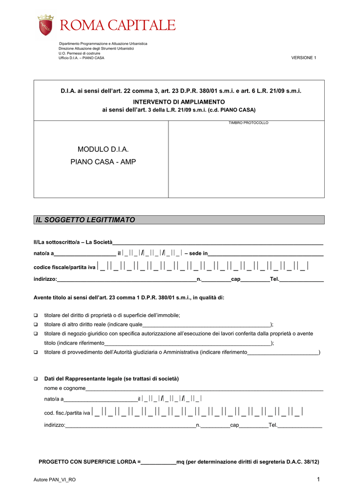 ROMA CAPITALE Dipartimento Programmazione e Attuazione Urbanistica Direzione Attuazione degli Strumenti Urbanistici U.O. Permessi di costruire Ufficio D.I.A. – PIANO CASA VERSIONE 1 D.I.A. ai sensi dell’art. 22 comma 3, art. 23 D.P.R. 380/01 s.m.i. e art. 6 L.R. 21/09 s.m.i. INTERVENTO DI AMPLIAMENTO ai sensi dell’art. 3 della L.R. 21/09 s.m.i. (c.d. PIANO CASA) TIMBRO PROTOCOLLO MODULO D.I.A. PIANO CASA - AMP IL SOGGETTO LEGITTIMATO Il/La sottoscritto/a – La Società_______________________________________________________________________ nato/a a_____________________ il _ _ /_ _ /_ _ – sede in_______________________________________ codice fiscale/partita iva _ _ _ _ _ _ _ _ _ _ _ _ _ _ _ _ indirizzo:_______________________________________________n.__________cap__________Tel._______________ Avente titolo ai sensi dell’art. 23 comma 1 D.P.R. 380/01 s.m.i., in qualità di: titolare del diritto di proprietà o di superficie dell’immobile; titolare di altro diritto reale (indicare quale___________________________________________); titolare di negozio giuridico con specifica autorizzazione all’esecuzione dei lavori conferita dalla proprietà o avente titolo (indicare riferimento________________________________________________________); titolare di provvedimento dell’Autorità giudiziaria o Amministrativa (indicare riferimento________________________) Dati del Rappresentante legale (se trattasi di società) nome e cognome________________________________________________________________________________ nato/a a_________________________il _ _ /_ _ /_ _ cod. fisc./partita iva _ _ _ _ _ _ _ _ _ _ _ _ _ _ _ _ indirizzo:____________________________________________n.__________cap__________Tel._______________ PROGETTO CON SUPERFICIE LORDA =____________mq (per determinazione diritti di segreteria D.A.C. 38/12) Autore PAN_VI_RO 1 DEPOSITA DENUNCIA INIZIO ATTIVITÀ PER: 1 INTERVENTO DI AMPLIAMENTO DI UNITA’ IMMOBILIARE/I IN EDIFICIO PLURIFAMILIARE A DESTINAZIONE RESIDENZIALE (destinazione esemplificata nell’art. 6 comma 1 lett. a delle N.T.A. del P.R.G.) - art. 3 comma 1 lett. a), comma 8 L. R. 21/09 s.m.i. e Circolare esplicativa D.G.R. 20/12 con allegato progetto unitario dell’intero edificio – che riporta i prospetti delle facciate interessate dall’intervento di ampliamento – timbrato e firmato da tecnico abilitato, sottoscritto dai proprietari o aventi titolo in conformità a quanto previsto dal codice civile (art. 3 comma 8 L.R. 21/09 s.m.i. e Circolare esplicativa D.G.R. 20/12); senza progetto unitario in quanto trattasi di intervento che non incide sul decoro architettonico, non riguarda parti comuni e rispetta i diritti edificatori spettanti a ciascun proprietario o avente titolo così come si evince dall’allegata tabella di ripartizione e di verifica (art. 3 comma 8 L.R. 21/09 s.m.i. e Circolare esplicativa D.G.R. 20/12). L’intervento contempla il recupero di volumi accessori - art. 3 comma 8 e art. 5 comma 1 lett. a) e D.A.C. 9/12 L’intervento non contempla il recupero dei volumi accessori - art. 3 comma 8 e art. 5 comma 1 lett. a) e D.A.C. 9/12 2 INTERVENTO DI AMPLIAMENTO DI UNITA’ A DESTINAZIONE RESIDENZIALE – PORZIONE DI EDIFICIO O SINGOLA UNITA’ IMMOBILIARE – DOTATA DI SPECIFICA AUTONOMIA FUNZIONALE (destinazione esemplificata nell’art. 6 comma 1 lett. a delle N.T.A. del P.R.G.) - art. 3 comma 1 lett. a), comma 8 L. R. 21/09 s.m.i. e Circolare esplicativa D.G.R. 20/12 2.1 RIGUARDANTE PORZIONE DI EDIFICIO PLURIFAMILIARE, dotato di specifica autonomia funzionale con accesso autonomo dall’esterno con allegato progetto unitario della porzione di edificio – che riporta i prospetti delle facciate interessate dall’intervento di ampliamento – timbrato e firmato da tecnico abilitato, sottoscritto dai proprietari o aventi titolo in conformità a quanto previsto dal codice civile (art. 3 comma 8 L.R. 21/09 s.m.i. e Circolare esplicativa D.G.R. 20/12); senza progetto unitario in quanto trattasi di intervento che non incide sul decoro architettonico, non riguarda parti comuni e rispetta i diritti edificatori spettanti a ciascun proprietario o avente titolo così come si evince dall’allegata tabella di ripartizione e di verifica (art. 3 comma 8 L.R. 21/09 s.m.i. e Circolare esplicativa D.G.R. 20/12); L’intervento contempla altresì il recupero dei volumi accessori - art. 3 comma 8 e art. 5 comma 1 lett. a) e D.A.C. 9/12 L’intervento non contempla il recupero dei volumi accessori - art. 3 comma 8 e art. 5 comma 1 lett. a) e D.A.C. 9/12 2.2 RIGUARDANTE SINGOLA UNITÀ IMMOBILIARE DI EDIFICIO MONO/PLURIFAMILIARE, dotata di specifica autonomia funzionale con accesso autonomo dall’esterno L’intervento contempla il recupero di volumi accessori - art. 3 comma 8 e art. 5 comma 1 lett. a) e D.A.C. 9/12 L’intervento non contempla il recupero dei volumi accessori - art. 3 comma 8 e art. 5 comma 1 lett. a) e D.A.C. 9/12 Autore PAN_VI_RO 2 3 INTERVENTO DI AMPLIAMENTO DI EDIFICIO A DESTINAZIONE NON RESIDENZIALE (destinazione esemplificata nell’art. 6 comma 1 lett. b, c parte ed f delle N.T.A. del P.R.G.) - art. 3 comma 1 lett. c) L. R. 21/09 s.m.i. e Circolare esplicativa D.G.R. 20/12 con allegato progetto unitario dell’intero edificio e/o porzioni di edificio aventi accesso autonomo dall’esterno del fabbricato – che riporta i prospetti delle facciate interessate dall’intervento di ampliamento – timbrato e firmato da tecnico abilitato, sottoscritto da tutti i proprietari o aventi titolo in conformità a quanto previsto dal codice civile (art. 3 comma 8 L.R. 21/09 s.m.i. e Circolare esplicativa D.G.R. 20/12); 4 INTERVENTO DI AMPLIAMENTO DI EDIFICIO A DESTINAZIONE PRODUTTIVA ED ARTIGIANALE (destinazione esemplificata nell’art. 6 comma 1 lett. b, c parte, d ed e delle N.T.A. del P.R.G.) - art. 3 comma 1 lett. c) L. R. 21/09 s.m.i. e Circolare esplicativa D.G.R. 20/12 con allegato progetto unitario dell’intero edificio e/o porzioni di edificio 