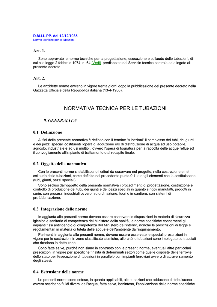 D.M.LL.PP. del 12/12/1985 Norme tecniche per le tubazioni. Art. 1. Sono approvate le norme tecniche per la progettazione, esecuzione e collaudo delle tubazioni, di cui alla legge 2 febbraio 1974, n. 64,[Vedi] predisposte dal Servizio tecnico centrale ed allegate al presente decreto. Art. 2. Le anzidette norme entrano in vigore trenta giorni dopo la pubblicazione del presente decreto nella Gazzetta Ufficiale della Repubblica italiana (13-4-1986). NORMATIVA TECNICA PER LE TUBAZIONI 0. GENERALITA' 0.1 Definizione Ai fini della presente normativa è definito con il termine "tubazioni" il complesso dei tubi, dei giunti e dei pezzi speciali costituenti l'opera di adduzione e/o di distribuzione di acqua ad uso potabile, agricolo, industriale e ad usi multipli, ovvero I'opera di fognatura per la raccolta delle acque reflue ed il convogliamento all'impianto di trattamento e al recapito finale. 0.2 Oggetto della normativa Con le presenti norme si stabiliscono i criteri da osservare nel progetto, nella costruzione e nel collaudo delle tubazioni, come definito nel precedente punto 0.1. e degli elementi che le costituiscono (tubi, giunti, pezzi speciali). Sono esclusi dall'oggetto della presente normativa i procedimenti di progettazione, costruzione e controllo di produzione dei tubi, dei giunti e dei pezzi speciali in quanto singoli manufatti, prodotti in serie, con processi industriali ovvero, su ordinazione, fuori o in cantiere, con sistemi di prefabbricazione. 0.3 Integrazione delle norme In aggiunta alle presenti norme devono essere osservate le disposizioni in materia di sicurezza igienica e sanitaria di competenza del Ministero della sanità, le norme specifiche concernenti gli impianti fissi antincendio di competenza del Ministero delI'interno, nonché le prescrizioni di legge e regolamentari in materia di tutela delle acque e dell'ambiente dall'inquinamento. Parimenti in aggiunta alle presenti norme, devono essere osservate le speciali prescrizioni in vigore per le costruzioni in zone classificate sismiche, allorché le tubazioni sono impiegate su tracciati che ricadono in dette zone Sono fatte salve, purché non siano in contrasto con le presenti norme, eventuali altre particolari prescrizioni in vigore per specifiche finalità di determinati settori come quelle disposte delle ferrovie dello stato per l'esecuzione di tubazioni in parallelo con impianti ferroviari ovvero di attraversamento degli stessi. 0.4 Estensione delle norme Le presenti norme sono estese, in quanto applicabili, alle tubazioni che adducono distribuiscono ovvero scaricano fluidi diversi dall'acqua, fatta salva, beninteso, I'applicazione delle norme specifiche eventualmente in vigore nel settore. 1. CRITERI GENERALI 1.1 Progetto Il progetto deve comprendere i seguenti elementi essenziali: a) la caratterizzazione fisica, chimica, sanitaria dei fluidi da trasportare, documentata mediante rilievi e prove; b) la caratterizzazione geologica e geotecnica dei terreni interessati dal tracciato delle tubazioni, documentata dai risultati di indagini da condursi nel rispetto della vigente normativa riguardante le indagini sui terreni e sulle rocce ed i criteri generali e le prescrizioni per la progettazione l'esecuzione ed il collaudo delle opere di sostegno delle terre e delle opere di fondazione. c) I'esame dei diversi possibili schemi idraulici di funzionamento delle opere e loro modificazioni prevedibili nel tempo, documentati ai fini della scelta del proporzionamento idraulico e statico delle tubazioni. d) I'analisi delle situazioni ambientali, in quanto elementi vincolanti nello studio del tracciato e del profilo delle tubazioni. Sulla base dei suindicati elementi deve essere espressa in forma circostanziata la scelta dei tipi di tubazioni e delle corrispondenti caratteristiche concernenti diametri interni, spessori, classi di impiego, giunti pezzi speciali ed appoggi. Il progetto deve comprendere, inoltre, lo studio dei seguenti aspetti: funzionalità e razionalità di costruzione e di esercizio delle nuove opere nel contesto esistenti e/o in quello previsto in tempi di prossimo futuro; compatibilità con la presenza attuale e/o prevista e/o prevedibile di altre infrastrutture di servizio, con particolare riferimento alla esigenza di sicurezza e di esercizio; rispetto delle esigenze urbanistiche, ambientali e/o archeologiche, in rapporto anche a fondata previsione di modificazioni future e, per le reti fognanti, rapporto agli obiettivi di qualità da conseguire e da tutelare del corpo ricettore. Il progetto deve dimostrare l'affidabilità di comportamento delle tubazioni nelle diverse fasi della costruzione dell'opera e nel previsto periodo dell'esercizio. L'affidabilità dell'opera progettata, che riguarda il grado di sicurezza statica, di resistenza alla corrosione, di conservazione delle caratteristiche idrauliche, di integrità nella tenuta e di continuità nel servizio, deve risultare nella forma documentata adeguata, in particolare esplicitando le debite considerazioni a riguardo dei controlli sui materiali e sui tubi che vengono effettuati nello stabilimento e nel cantiere di prefabbricazione, secondo metodologie note e/o specifiche tecniche e dei controlli in sito lungo i tracciati prescelti. 1.2 Costruzione Nel corso della costruzione, dovranno essere disposte e fatte osservare prescrizioni confacenti: a) con idonee metodologie di manipolazione, trasporto, accatastamento, sfilamento, posa in opera dei tubi, dei giunti e dei pezzi speciali; nonché con idonee modalità di formazione del giunto; b) con le effettive condizioni geologiche e geotecniche, urbanistiche ed ambientali, di volta in volta accertate nello sviluppo dei lavori, per la loro possibile influenza sul comportamento delle tubazioni nel tempo; c) con tutte le altre situazioni che possano influenzare la conservazione nel tempo delle tubazioni. Eventuali varianti, in particolare quelle concernenti la tipologia delle tubazioni, sono ammesse solo se, nel risp