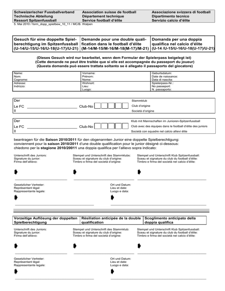Schweizerischer Fussballverband Technische Abteilung Ressort Spitzenfussball Association suisse de football Département technique Service football d’élite Associazione svizzera di football Dipartimento tecnico Servizio calcio d’élite 5. Mai 2010 / form_dopp_spielbew_10_11 / MC/B. Walpen Gesuch für eine doppelte Spiel- Demande pour une double quali- Domanda per una doppia berechtigung im Spitzenfussball fication dans le football d’élite qualifica nel calcio d’élite (U-14/U-15/U-16/U-18(U-17)/U-21) (M-14/M-15/M-16/M-18(M-17)/M-21) (U-14 /U-15/U-16/U-18(U-17)/U-21) (Dieses Gesuch wird nur bearbeitet, wenn dem Formular der Spielerpass beigelegt ist) (Cette demande ne peut être traitée que si elle est accompagnée du passeport du joueur) (Questa domanda può essere trattata soltanto se è allegato il passaporto del giocatore) Name: Nom: Cognome: Adresse: Indrizzo: Vorname: Prénom: Nome: Wohnort: Lieu: Luogo: Geburtsdatum: Date de naissance: Data di nascita: Spielerpass-Nr.: No passeport: N. passaporto: Der Stammklub Le FC ________________________ Club-No Il Club d’origine Der Klub mit Mannschaften im Junioren-Spitzenfussball Le FC ________________________ Club-No Il Club avec des équipes dans le football d’élite des juniors Società d’origine Società con squadre nel calcio allievi élite beantragen für die Saison 2010/2011 für den obgenannten Junior eine doppelte Spielberechtigung: conviennent pour la saison 2010/2011 d’une double qualification pour le junior désigné ci-dessous: chiedono per la stagione 2010/20011 una doppia qualifica per l’allievo sopra indicato: Unterschrift des Juniors: Signature du junior: Firma dell’allievo: Stempel und Unterschrift des Stammklubs: Sceau et signature du club d’origine: Timbro e firma del società d’origine: Stempel und Unterschrift Klub Spitzenfussball: Sceau et signature du club du football d’élite: Timbro e firma del società nel calcio d’élite: _______________________________ ____________________________________ Gesetzlicher Vertreter: Représentant légal: Rappresentante legale: Ort und Datum: Lieu et date: Luogo e data: _______________________________________________ Vorzeitige Auflösung der doppelten Spielberechtigung _________________________________________ _________________________________________________________ Résiliation anticipée de la double qualification Scoglimento anticipato della doppia qualifica Unterschrift des Juniors: Signature du junior: Firma dell’allievo: Stempel und Unterschrift des Stammklub: Sceau et signature du club d’origine: Timbro e firma del società d’origine: Stempel und Unterschrift Klub Spitzenfussball: Sceau et signature du club du football d’élite: Timbro e firma del società nel calcio d’élite: _______________________________ ____________________________________ Gesetzlicher Vertreter: Représentant légal: Rappresentante legale: Ort und Datum: Lieu et date: Luogo e data: _______________________________________________ _________________________________________ _________________________________________________________