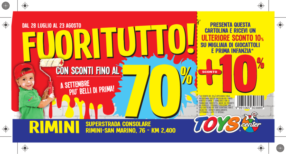 10 + 70 ✁ ! O T T U T I R FUO DAL 28 luglio AL 23 agosto con sconti fino AL A SETTEMBRE I PRIMA! PIU’ BELLI D rimini superstrada consolare rimini-san marino, 76 - km 2,400 presenta questa cartolina e ricevi un ulteriore sconto 10 su migliaia di giocattoli e prima infanzia* sconto *lo sconto del 10 è applicabile solo presentando questa cartolina nel punto vendita di rimini. è cumulabile con la promozione fuoritutto, anche sui prodotti già scontati. è possibile utilizzare una sola cartolina per ogni scontrino. non è valido per i reparti abbigliamento, elettronica, i latti 1 e speciali. questo è solo un esempio dei tanti prodotti scontati fino pista hot wheels superloop pampers baby dry -50 79,99€ al 70 dal 28/7 al 23/8/15 glam camper barbie & ken 40,00€ -30 119,00€ 83,30€ pacco singolo,varie misure -31 6,59€ 4,49€ uscita A14 trad Supers a Conso passeggino peps plain colori assortiti -14 MARE 34,99€ 29,99€ rimini -70 scooby-doo mistery van smile edition superstrada consolare rimini-san marino, 76 - km 2,400 49,99€ 15,00€ San Marino 5 km dal centro di Rimini Promozione valida solo nel punto vendita Toys Center di Rimini dal 28/7 al 23/8/15 salvo esaurimento scorte e/o errori di stampa. scopri gli orari su www.toyscenter.it lare 2,400 76 Km R i m ini - San Marino, Tel. 0541 753369