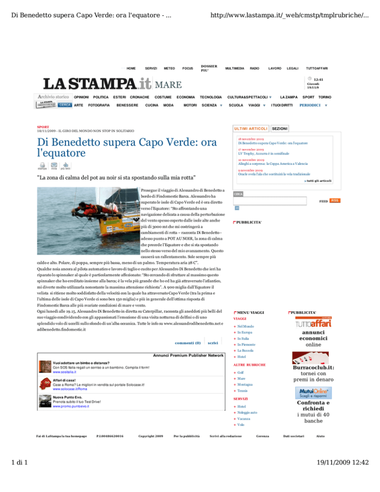 Di Benedetto supera Capo Verde: ora l'equatore - ... v e rs o i n e a c c e s s ib le i HOME SERVIZI http://www.lastampa.it/_web/cmstp/tmplrubriche/... METEO DOSSIER PIU' FOCUS MULTIMEDIA RADIO LAVORO LEGALI TUTTOAFFARI 12:41 MARE OPINIONI ARTE POLITICA FOTOGRAFIA ESTERI CRONACHE BENESSERE COSTUME CUCINA MODA Giovedì 19/11/9 ECONOMIA TECNOLOGIA MOTORI SCIENZA SPORT 18/11/2009 - IL GIRO DEL MONDO NON STOP IN SOLITARIO CULTURA&SPETTACOLI SCUOLA VIAGGI ULTIMI ARTICOLI Di Benedetto supera Capo Verde: ora l'equatore LA ZAMPA I TUOI DIRITTI SPORT TORINO PERIODICI SEZIONI 18 novembre 2009 Di Benedetto supera Capo Verde: ora l'equatore 17 novembre 2009 LV Trophy, Azzurra è in semifinale 10 novembre 2009 Alinghi a sorpresa: la Coppa America a Valencia 9 novembre 2009 Oracle svela l'ala che sostituirà la vela tradizionale "La zona di calma del pot au noir si sta spostando sulla mia rotta" tutti gli articoli Prosegue il viaggio di Alessandro di Benedetto a bordo di Findomestic Barca. Alessandro ha FEED superato le isole di Capo Verde ed è ora diretto verso l’Equatore: “Sto affrontando una navigazione delicata a causa della perturbazione del vento spesso coperto dalle isole alte anche più di 3000 mt che mi costringerà a PUBBLICITA' cambiamenti di rotta – racconta Di Benedetto adesso punto a POT AU NOIR, la zona di calma che precede l'Equatore e che si sta spostando nello stesso verso del mio avanzamento. Questo causerà un rallentamento. Sole sempre più caldo e alto. Polare, di poppa, sempre più bassa, meno di un palmo. Temperatura aria 28 C”. Qualche noia ancora al pilota automatico e lavoro di taglio e cucito per Alessandro Di Benedetto che ieri ha riparato lo spinnaker al quale è particolarmente affezionato: “Sto cercando di sfruttare al massimo questo spinnaker che ho ereditato insieme alla barca; è la vela più grande che ho ed ha già attraversato l’atlantico, mi diverte molto utilizzarla nonostante la massima attenzione richiesta”. A 900 miglia dall’Equatore il velista si ritiene molto soddisfatto della velocità con la quale ha attraversato Capo Verde (tra la prima e l’ultima delle isole di Capo Verde ci sono ben 150 miglia) e più in generale dell’ottima risposta di Findomestic Barca alle più svariate condizioni di mare e vento. Ogni lunedì alle 19.15, Alessandro Di Benedetto in diretta su Caterpillar, racconta gli aneddoti più belli del suo viaggio condividendo con gli appassionati l’emozione di una visita notturna di delfini o di uno MENU VIAGGI splendido volo di uccelli sullo sfondo di un’alba oceanica. Tutte le info su www.alessandrodibenedetto.net e adibenedetto.findomestic.it + Nel Mondo annunci economici online + In Europa + In Italia commenti (0) PUBBLICITA' VIAGGI scrivi + In Piemonte + La Bussola Annunci Premium Publisher Network Vuoi adottare un bimbo a distanza? Con SOS Italia regali un sorriso a un bambino. Compila il form! www.sositalia.it + Hotel ALTRE RUBRICHE + Golf + Mare Affari di casa! Case a Roma? Le migliori in vendita sul portale Solocase.it! www.solocase.it/Roma + Montagna + Tennis Nuova Punto Evo. Prenota subito il tuo Test Drive! www.promo.puntoevo.it SERVIZI + Hotel + Noleggio auto + Vacanza + Volo Fai di LaStampa la tua homepage 1 di 1 P.I.00486620016 Copyright 2009 Burracoclub.it: tornei con premi in denaro Per la pubblicità Scrivi alla redazione Gerenza Confronta e richiedi i mutui di 40 banche Dati societari Aiuto 19/11/2009 12:42